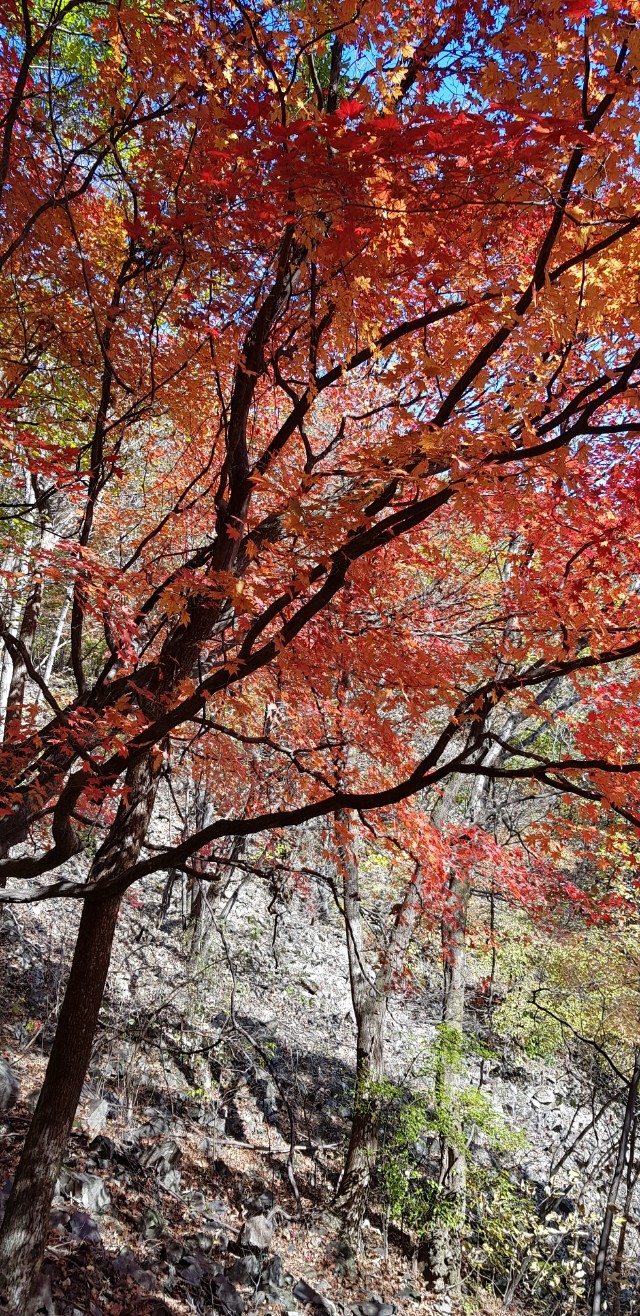 계곡은 계속해서 단풍의 절경을 내게 허락한다. 사진을 계속해서 찍어도 눈으로 본 그 느낌이 나지 않는다. 진짜 단풍은 사진이 아닌 눈으로 담아와야 한다는 진리를 되새긴다. 인물사진은 실물보다 잘 나오는 경우가 많은데 단풍은 그렇지 않으니. 계속되는 너덜길을 따라 걷다 보니 어느새 마당바위 입구에 이른다.