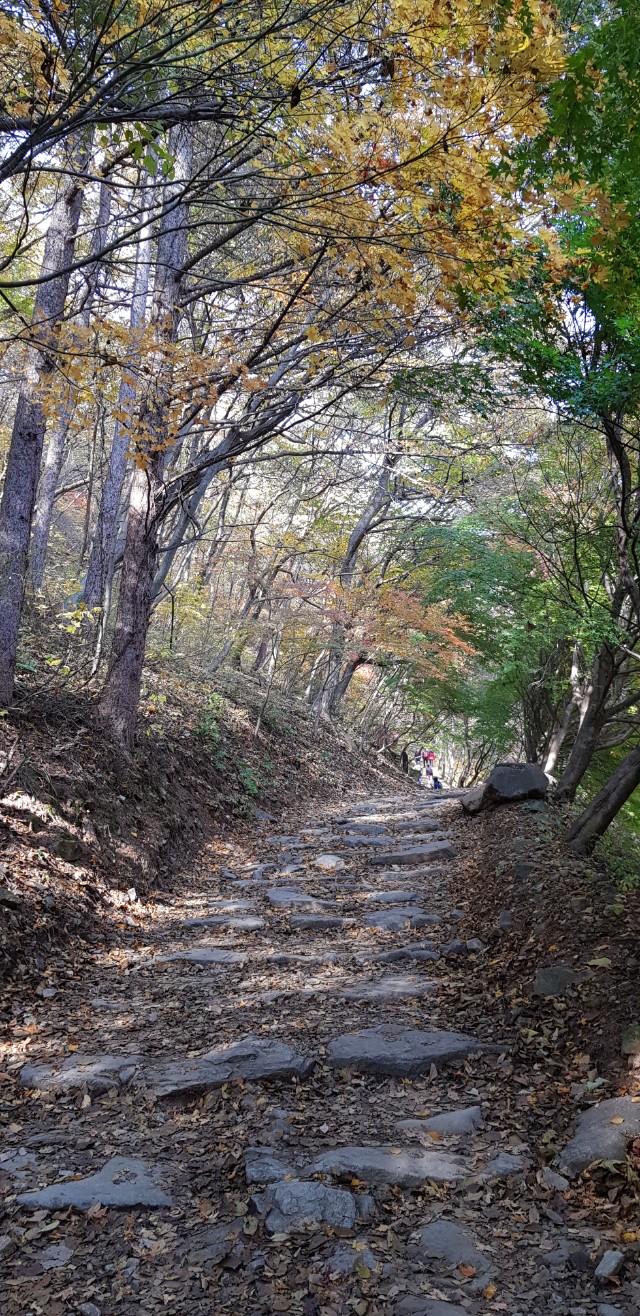 첫 번째 갈림길에서 좌측 편을 택한다. 우선 정상까지 가까운 코스로 가고, 내려오는 길을 길게 잡아 단풍을 즐길 수 있기를 바라본다. 단풍을 느긋하게 감상하며 목재 계단을 지난다. 이런 목재 계단을 좋아한다. 항상 아래를 내려보며 사진을 찍게 된다. 중간중간 쉼터가 잘 조성된 등산코스를 가다 보니, 정자가 나타난다. 어김없이 단풍을 즐기려는 산객들이 자리를 차지하고 앉아 간식타임을 즐기고 있다.