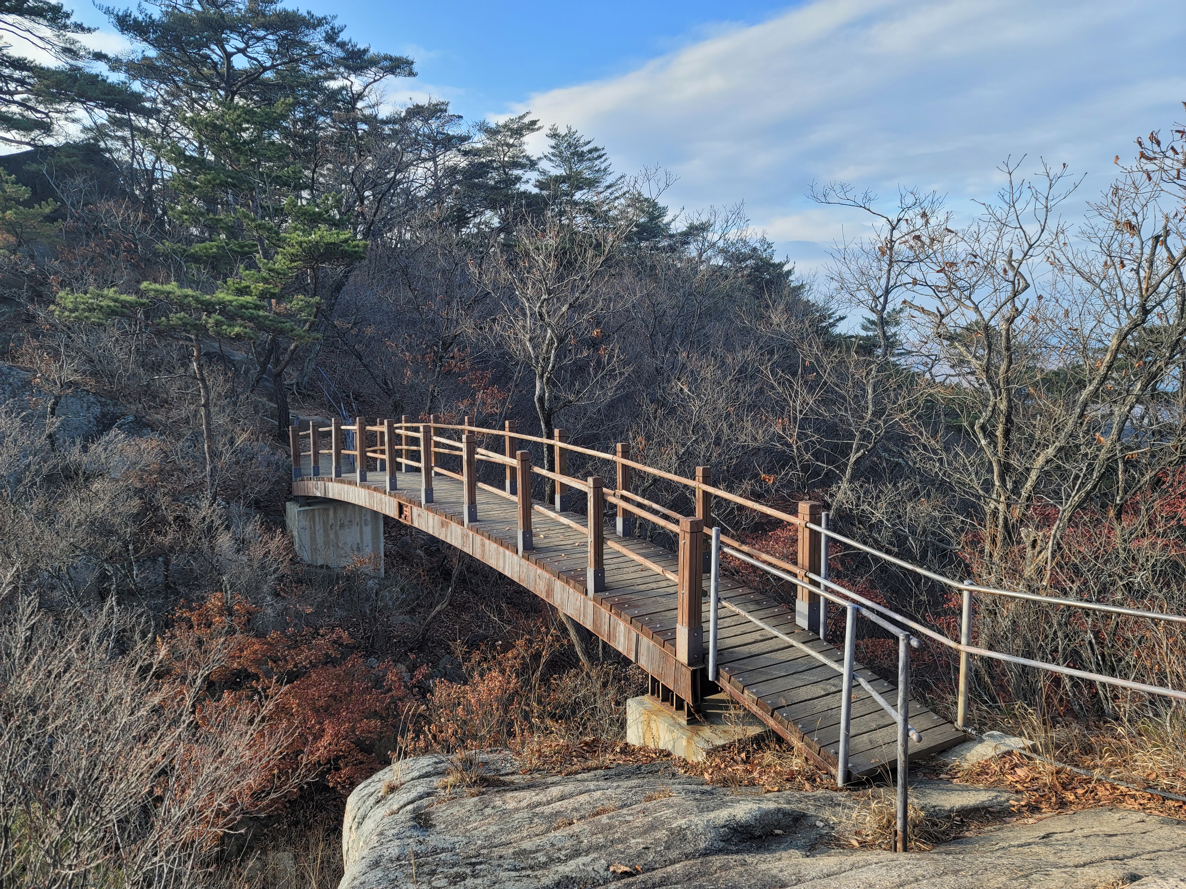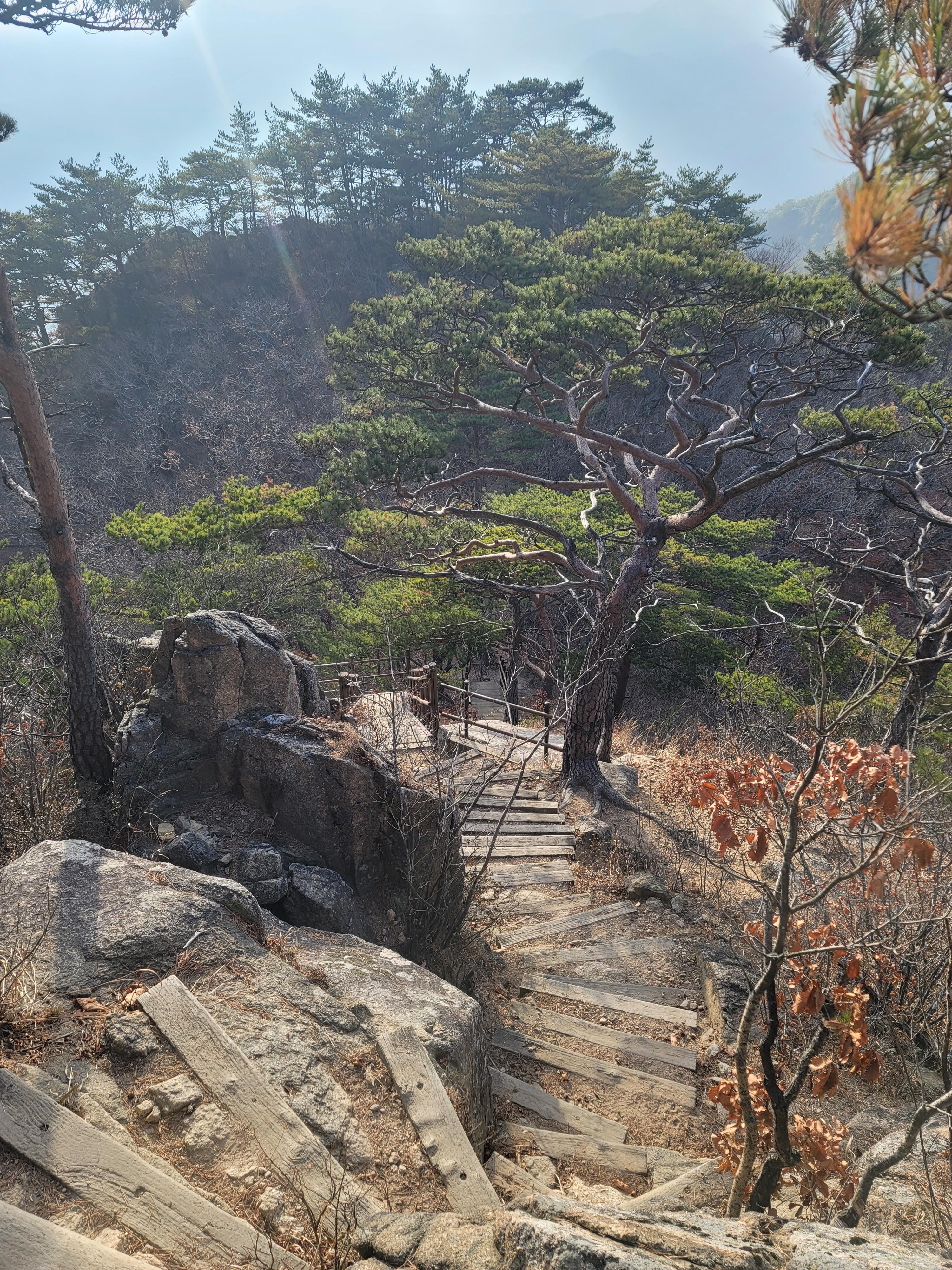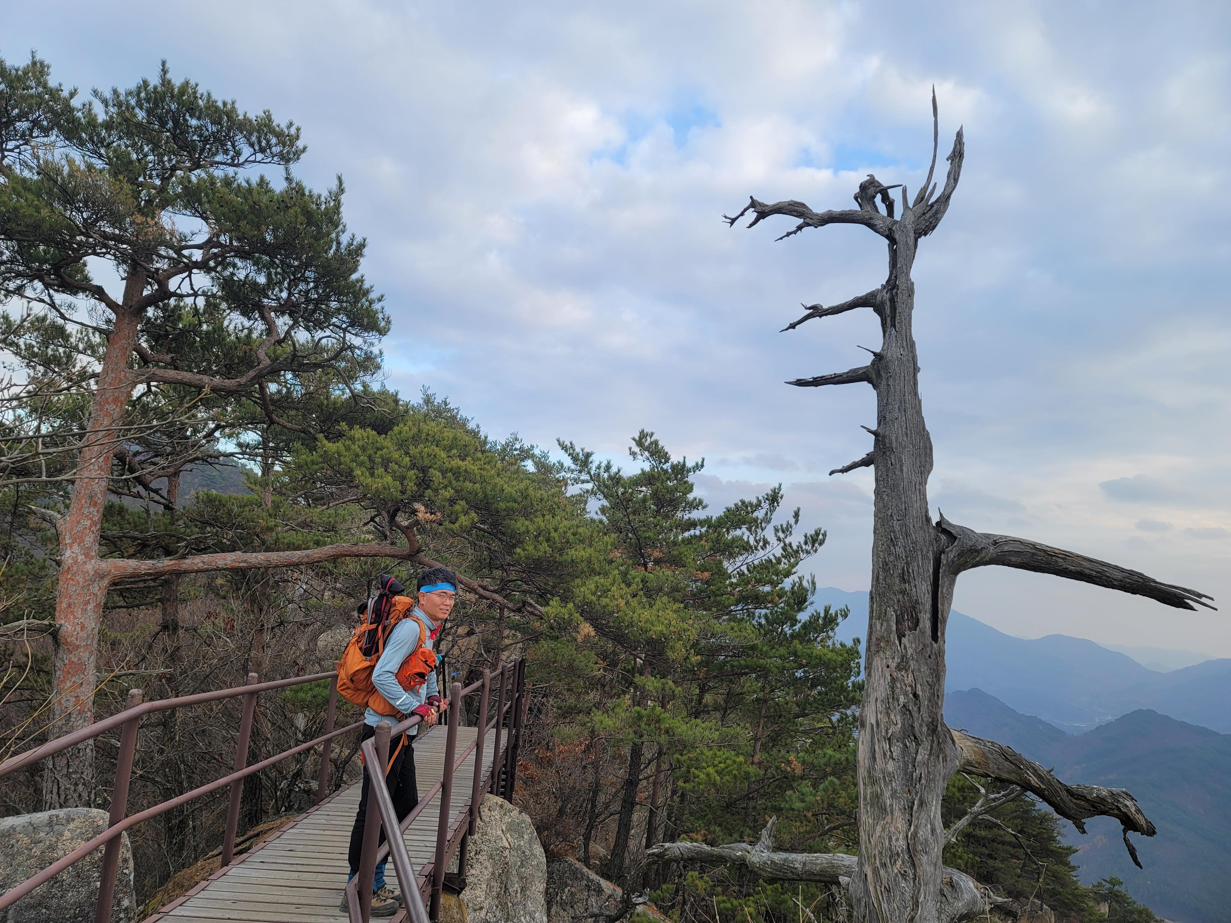 정상에서 오래 머물지 않고 하산을 시작한다. 도락산 삼거리에서 좌측 편 목재데크를 따라 채운봉 방향으로 향한다. 계속되는 오르내림이지만, 바위와 계단에서 바라보는 뷰가 멋지다. 춥지도 덥지도 않은 날씨의 산행이라 더 편안하다. 어느샌가 홀로 서있는 고고한 고사목 앞을 지나게 된다. 이곳이 또한 포토존이다. 저런 고고함을 본받아 강하게 버티며 남은 인생을 지켜내겠다는 다짐을 해보는 시간이다. 등산로를 빠져나와 도로를 따라 걸어 내려오며 도락산 산행을 되돌아본다. 이곳도 무엇 하나 빠질 게 없는 명산임에 틀림없다. 이제 네 번째 도락산 산행은 언제쯤에 돌아올까?