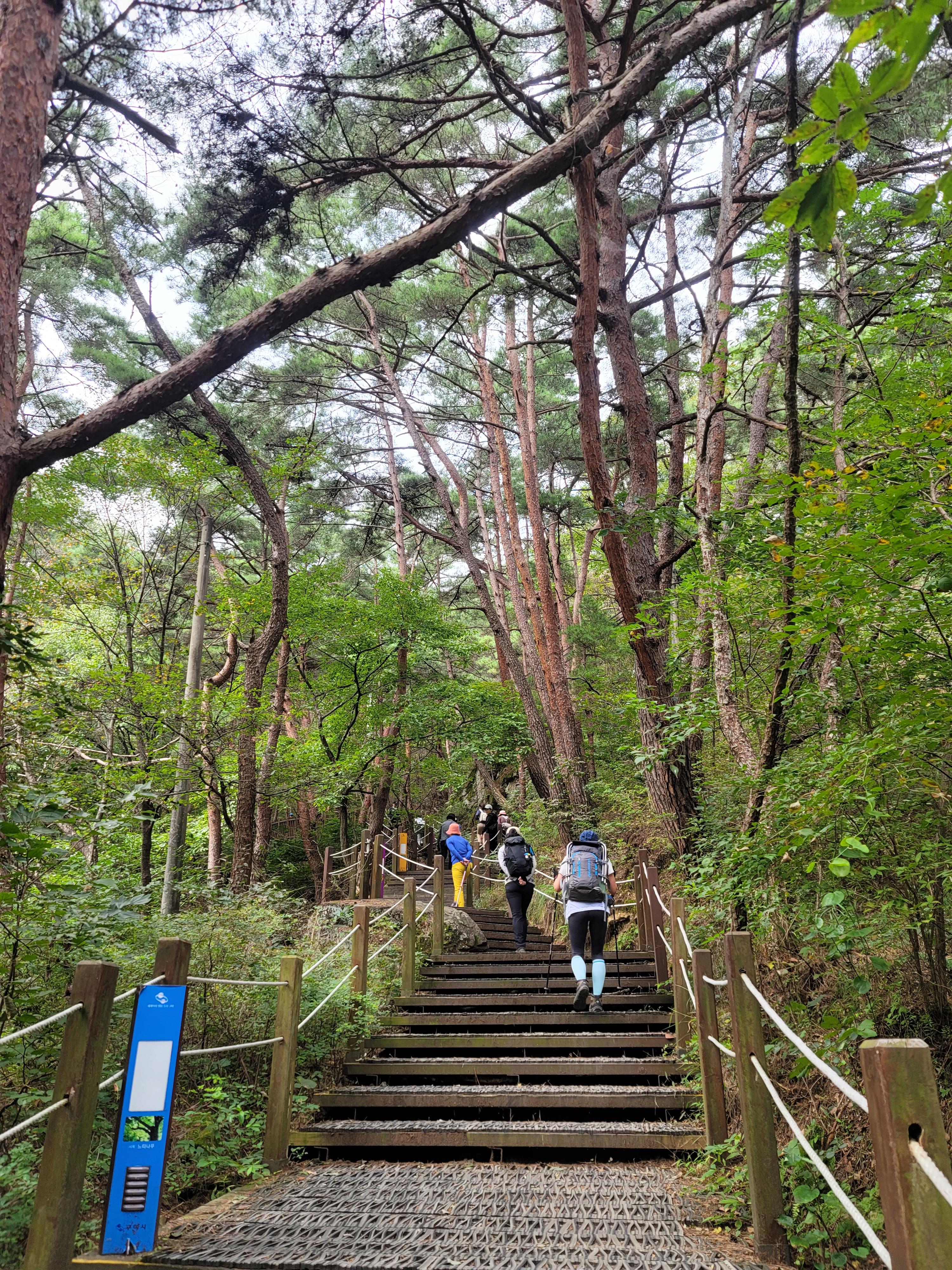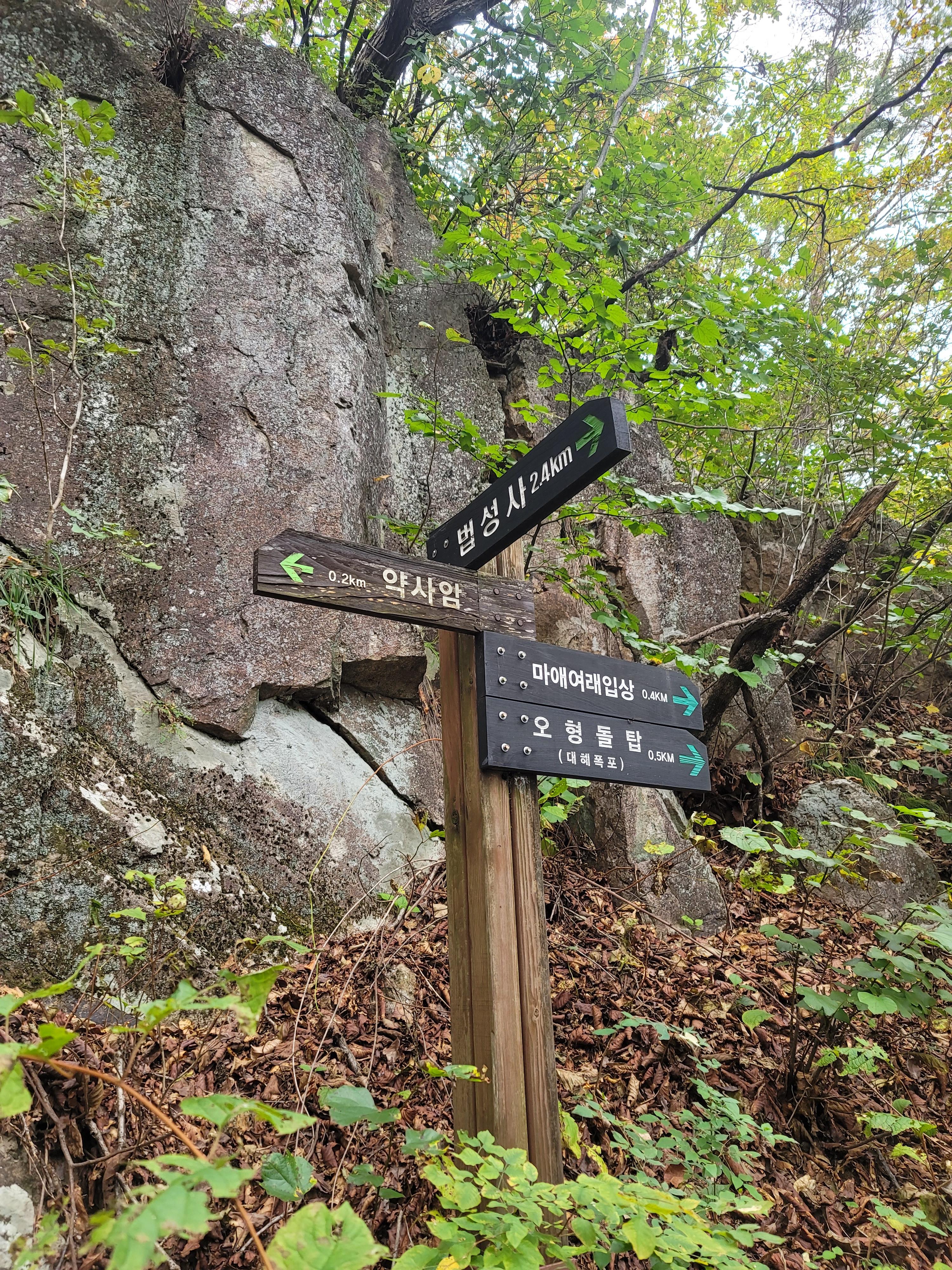 대혜폭포에서부터 길게 이어지는 할딱고개라고 불리는 오르막 구간이다. 가파른 나무계단을 오르면 우선 할딱고개 전망대를 접하게 된다. 이곳도 손꼽히는 포토존이다. 사방의 조망을 배경 삼아 모델이 되어 본다. 약 1km 정도의 길게 이어지는 오르막 구간은 금오산에서 만나게 되는 최대 난코스라 할 수 있다. 그래도 어느 정도의 등력이 있는 사람이라면 크게 ㅂ담을 가지지 않을 정도의 코스라 할 수 있다. 시원한 날씨임에도 땀이 송골송골 맺힐 정도로 숨이 차 온다. 몇 번의 가다 쉼을 반복하다 정상을 9백 미터를 남긴 지점에 오형돌탑 분기점 이정표가 나타난다. 금오산의 명물 중 하나인 오형돌탑을 지나칠 수 없다. 왼쪽 편 마애석불 방면으로 오르막을 오른다.