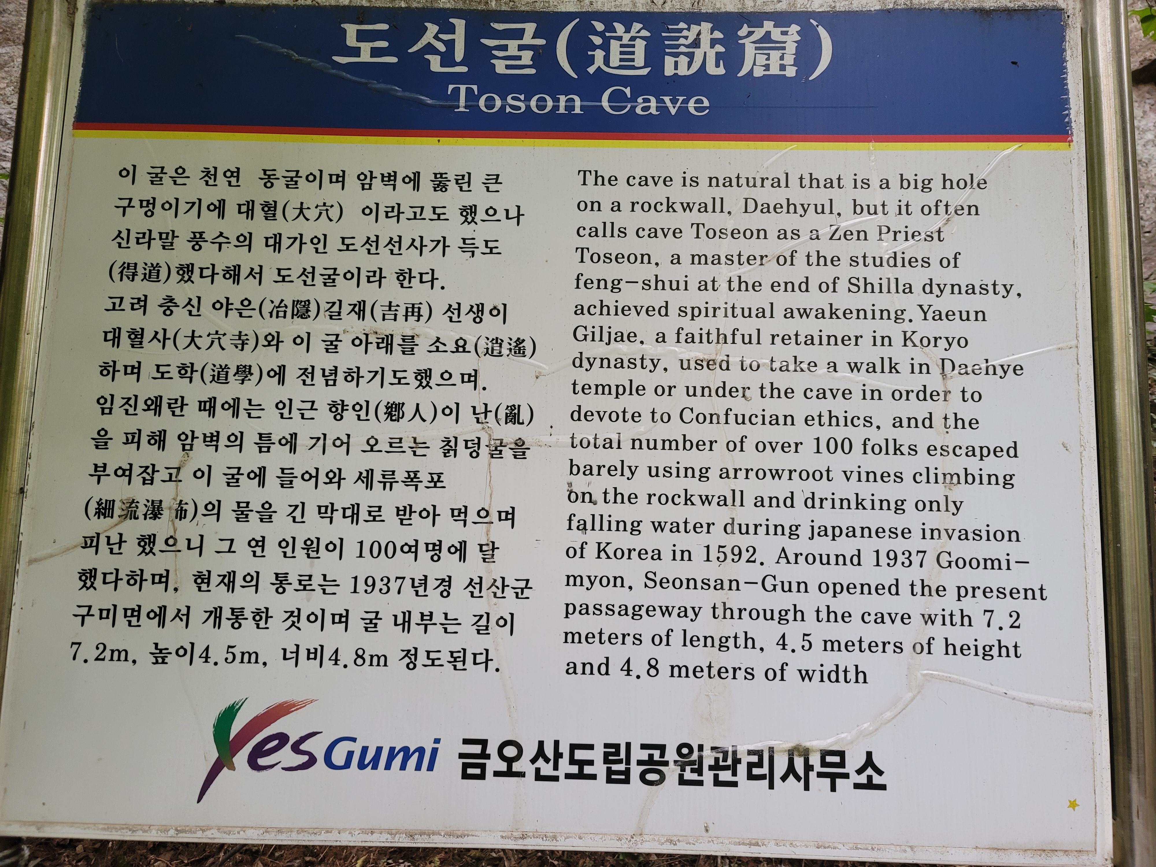 폭포까지 가는 계곡길은 꽤 수월한 길이다. 중간에 유실된 구간도 있지만 쉽게 찾을 수 있다. 낭만이 있는 오솔길을 걷듯, 경쾌하게 걸어가다 보니, 어느새 할딱고개 계단과 만나는 지점이다. 나무 계단을 내려와 다시 대혜폭포와 만난다. 시간이 늦어져서 사람들의 모습도 많이 보이지 않는다. 산을 오를 때 지나쳤던 도선굴로 향한다. 임진왜란 때 난을 피해 1백여 명이 피해 있었다는 역사적 장소인 셈이다. 여기도 금오산의 핫스팟이라고 하니, 사진을 안 찍을 수 없다.