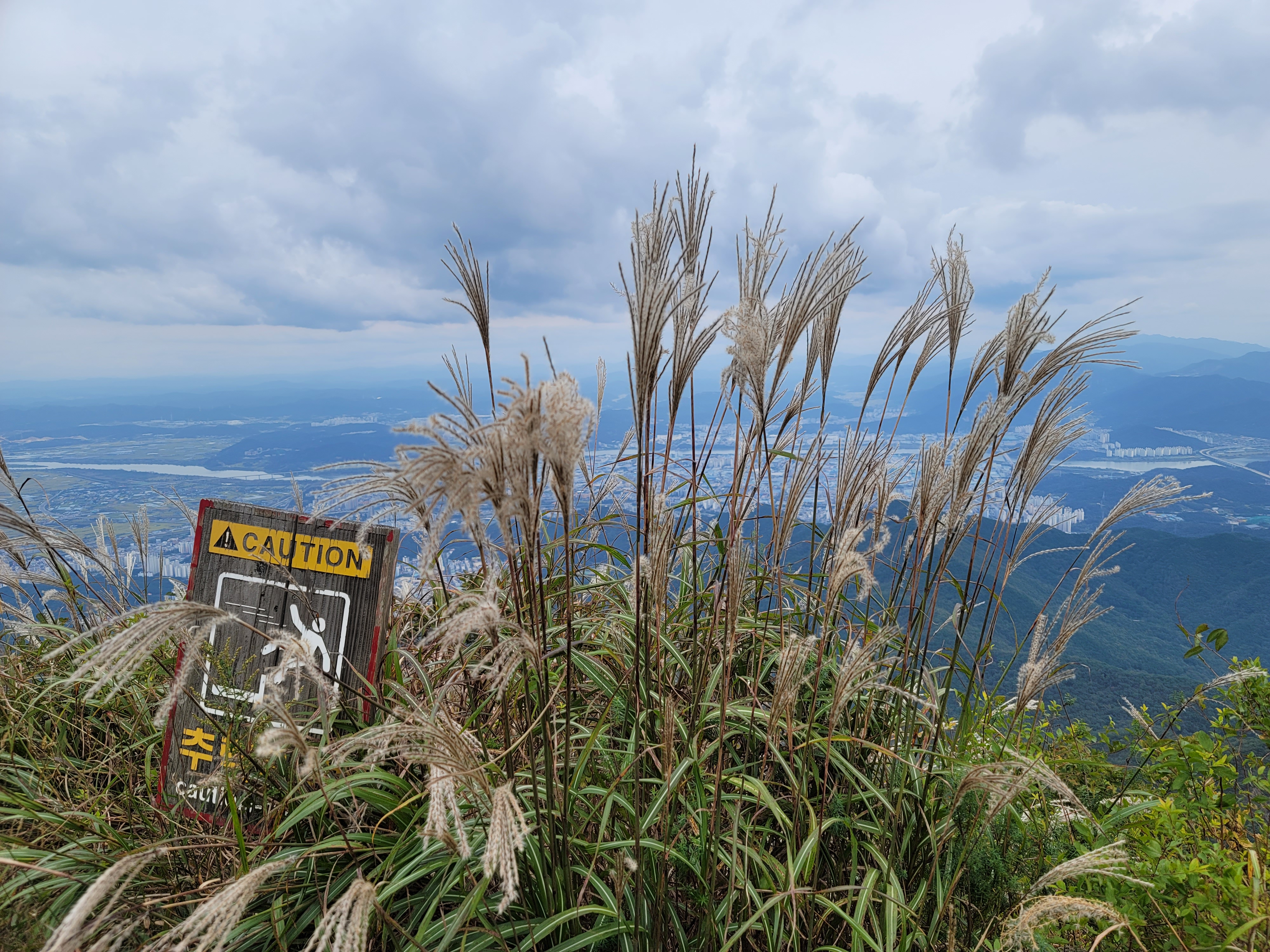 역시나 약사암의 모습은 기대를 저버리지 않는다. 약사암 범종까지는 접근이 통제되고 있다. 멀찍이 떨어져 사진에 담아본다. 이곳의 기도 효과가 뛰어날 거라는 얘기들을 들은 터라, 또다시 내 주변의 무사한 일상을 위해 기도를 해본다. 계단을 올라 드디어 금오산 정상에 진입한다. 2014년까지 역할을 했던 구 정상석을 지나, 멋진 정상석과 만난다. 정상석 뒤편에 규모가 작은 억새도 운치 있다. 사방의 조망을 스캔해 본다. 시간이 충분하다면, 이곳에서 간식이라도 즐겨야 하는데, 그럴 여유가 없다. 칼다봉 방향으로 하산을 시작한다. 정상석 바로 밑의 헬기장 보수 공사로 인해 등산로 찾기가 쉽지 않다. 어렵게 주 등산로를 찾아 성안까지 진행한다. 예나 지금이나 성안의 녹지는 운치가 있어서 좋다. 칼다봉까지 가려던 계획을 바꿔 폭포 방향으로 본격적으로 하산을 이어 나간다.