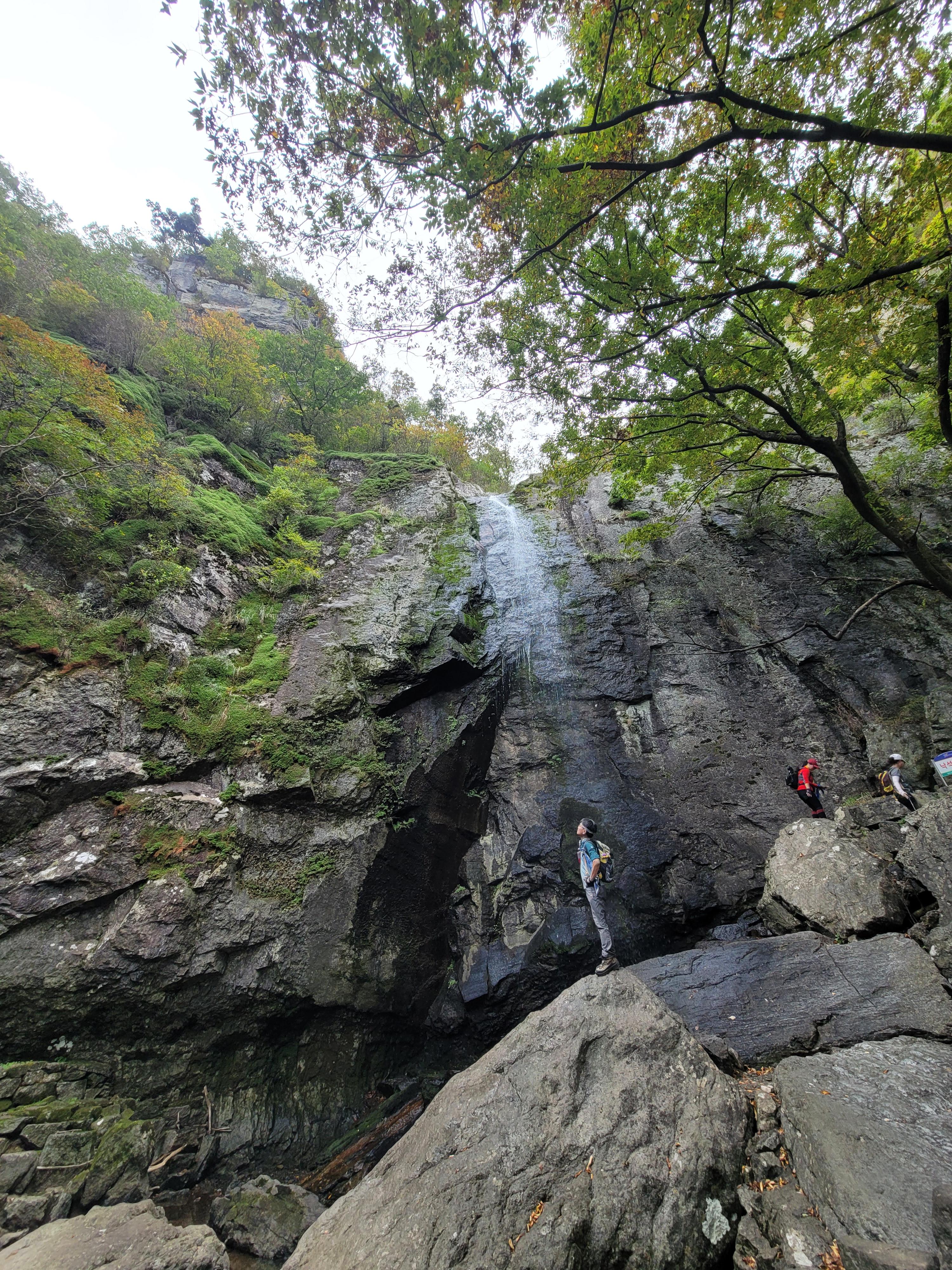 이른 시간에 출발해서 구미역 앞 식당에서 순두부찌개로 아침 식사를 챙기고 부지런히 차를 이동해 금오산 제1주차장까지 올라서 운 좋게 주차공간을 확보해 주차를 한다. 들머리까지 진행거리를 꽤나 많이 줄여주는 지점이다. 간단히 준비를 마치고, 여유 있게 산행을 시작한다. 편안한 도로를 따라 걷다가 금오산성 대혜문과 만난다. 색깔이 물들어가는 나뭇잎들이 가을을 느끼게 해 준다. 돌계단을 천천히 오르고 진행하다 보면 운치 있는 나무다리를 건너며 대혜폭포의 웅장함과 만나게 된다. 역시나 그 멋진 모습을 보기 위해 사람들이 많이들 모여 있다. 가장 멋진 자리에서 폭포수를 뒤로 하고, 사진 한 장의 추억을 남긴다.