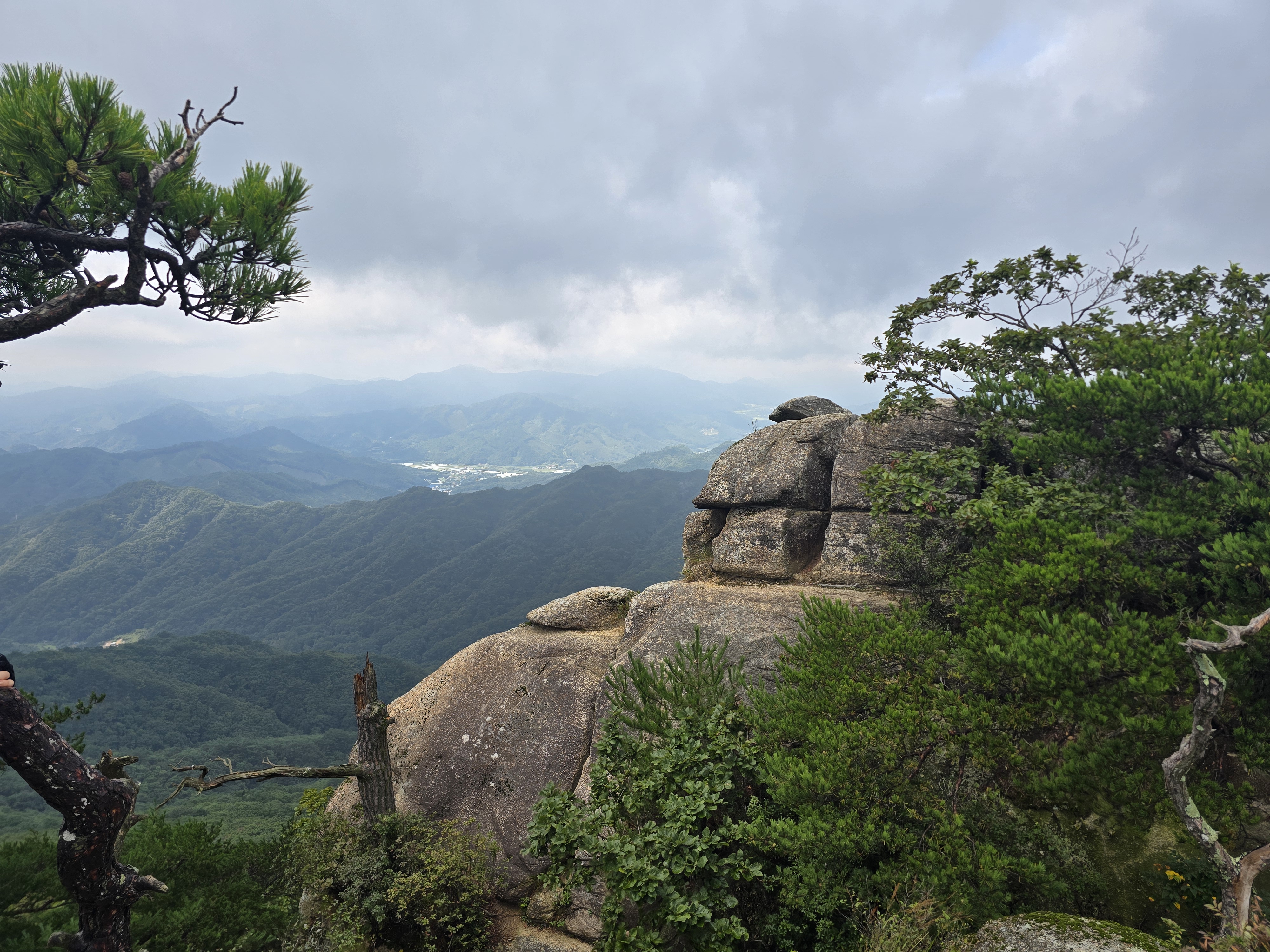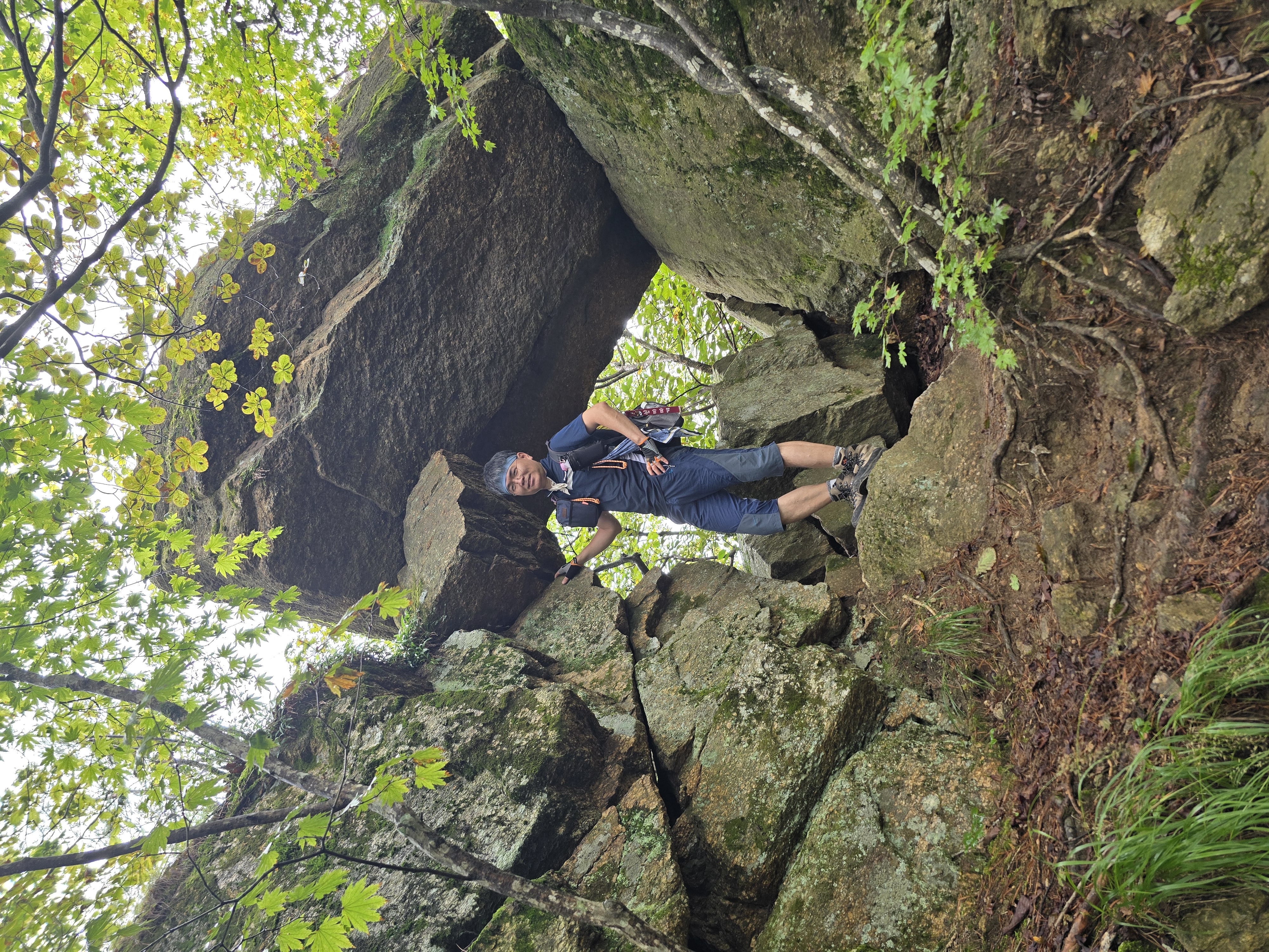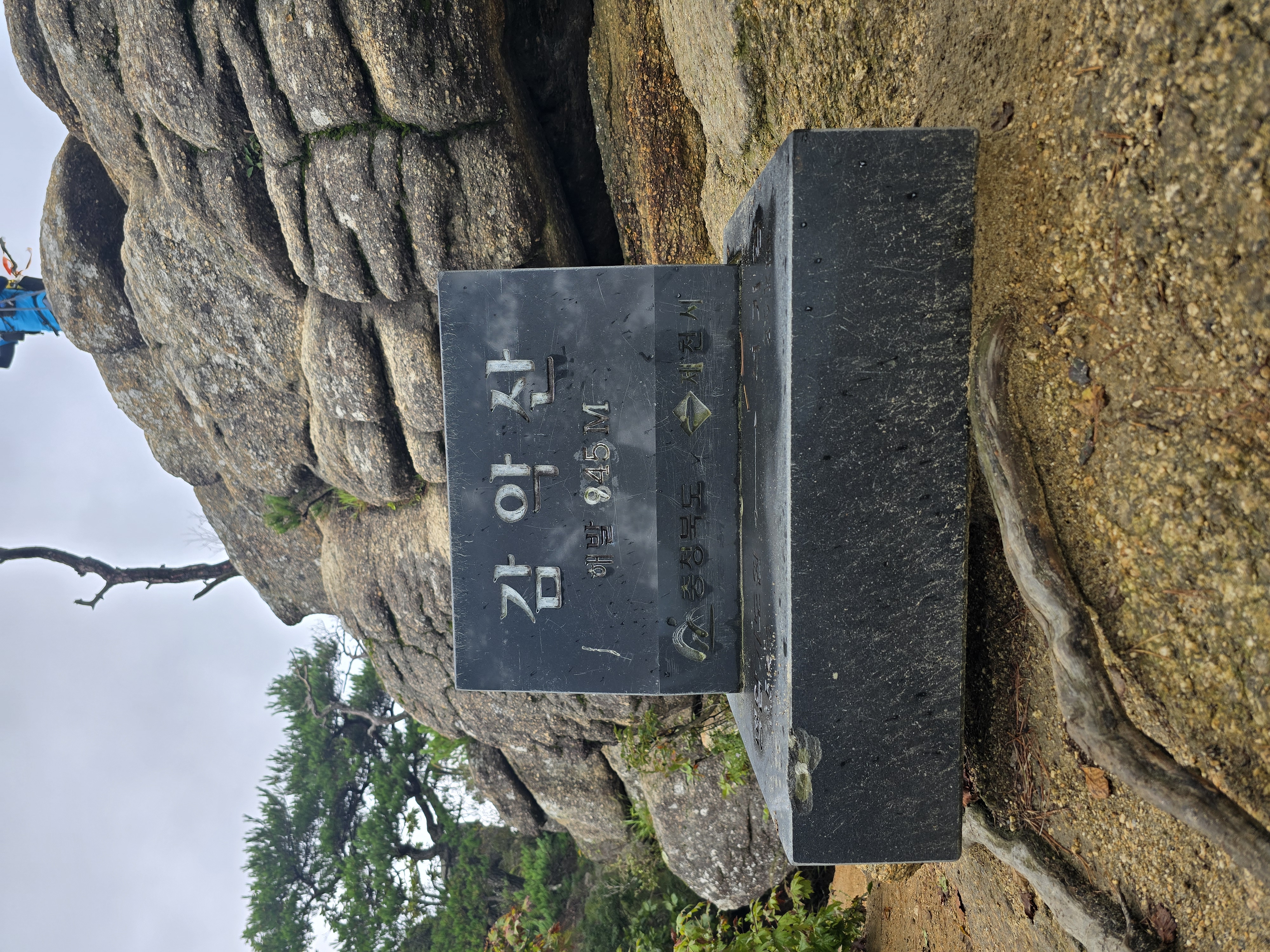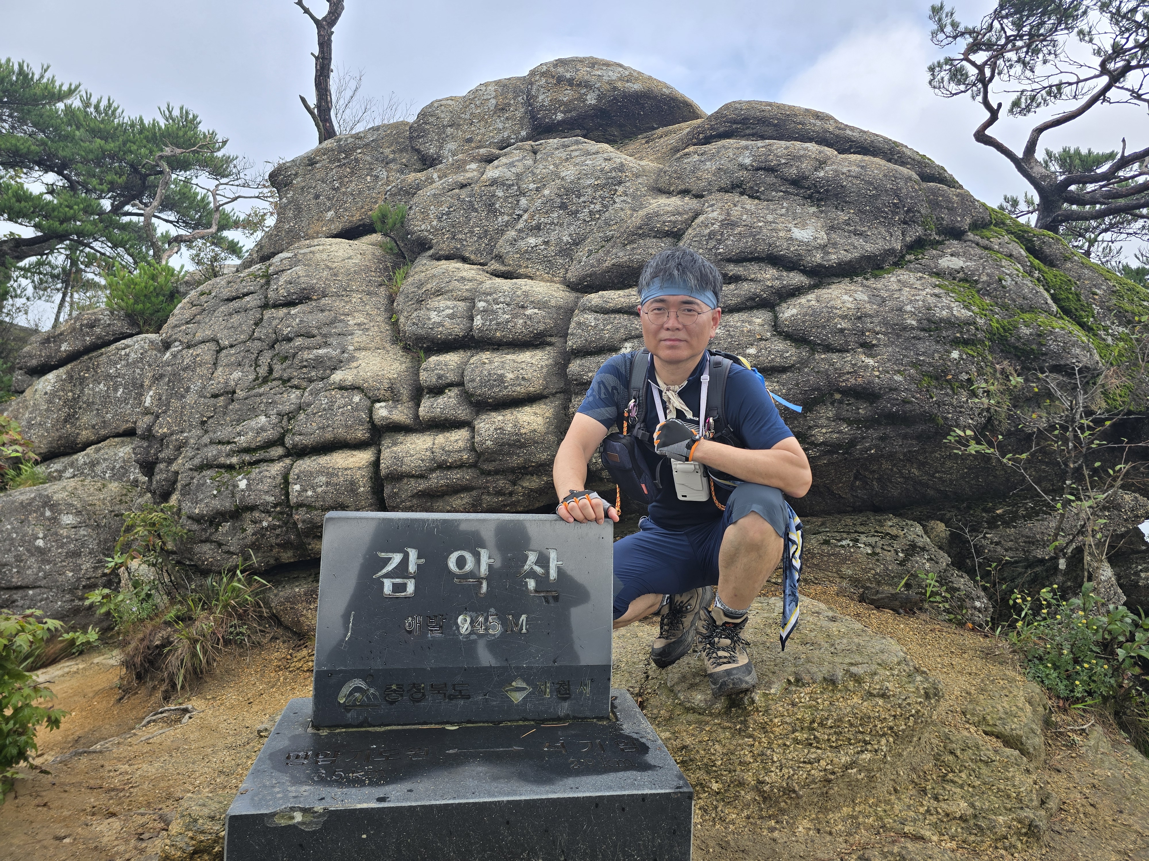 커다란 바위가 고인돌처럼 걸쳐 있는 곳을 지난다. 이곳에서도 기념사진을 한 장 찍는다. 신기한 모습이다. 좁고 다소 짜릿(?)한 등산로를 지나면 감악산 정상 이정목이 나온다. 이곳에서 가파른 바위를 로프를 잡고 올라야 제천 감악산 정상석과 만난다. 바위가 무서운 이들은 오르지도 내려오지도 못하는 구간이다. 바위가 부담되거나, 고소공포증이 있는 사람은 정상석에 무리해서 오르지 않고, 이정목에서 인증을 대신하기도 한다. 어쨌든 바위에 올라서 산 아래를 내려보는 조망이 무척 멋진 곳이기에 가급적 오르는 것이 좋다. 시원한 바람과 멋진 조망을 다시 한번 만끽하고, 정상 인증을 마친다.