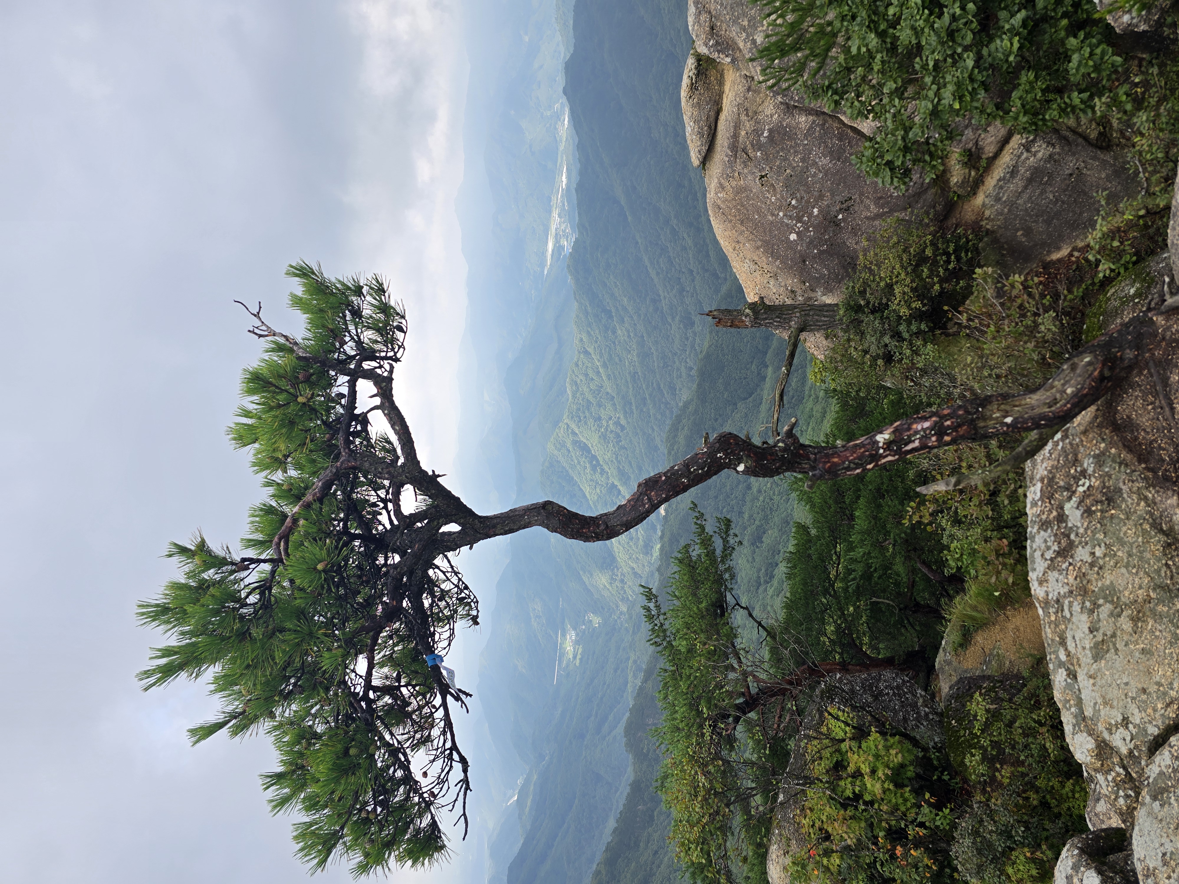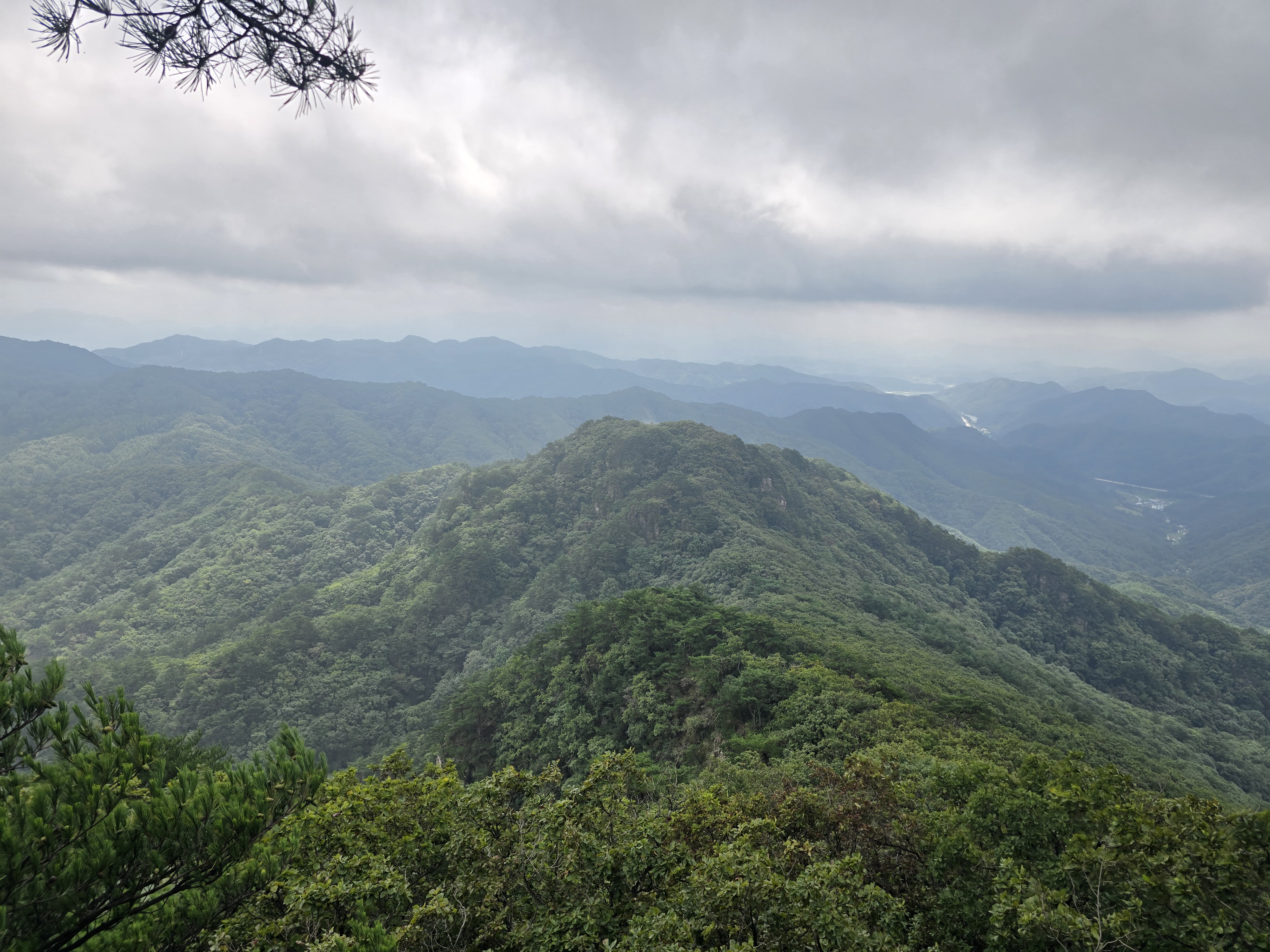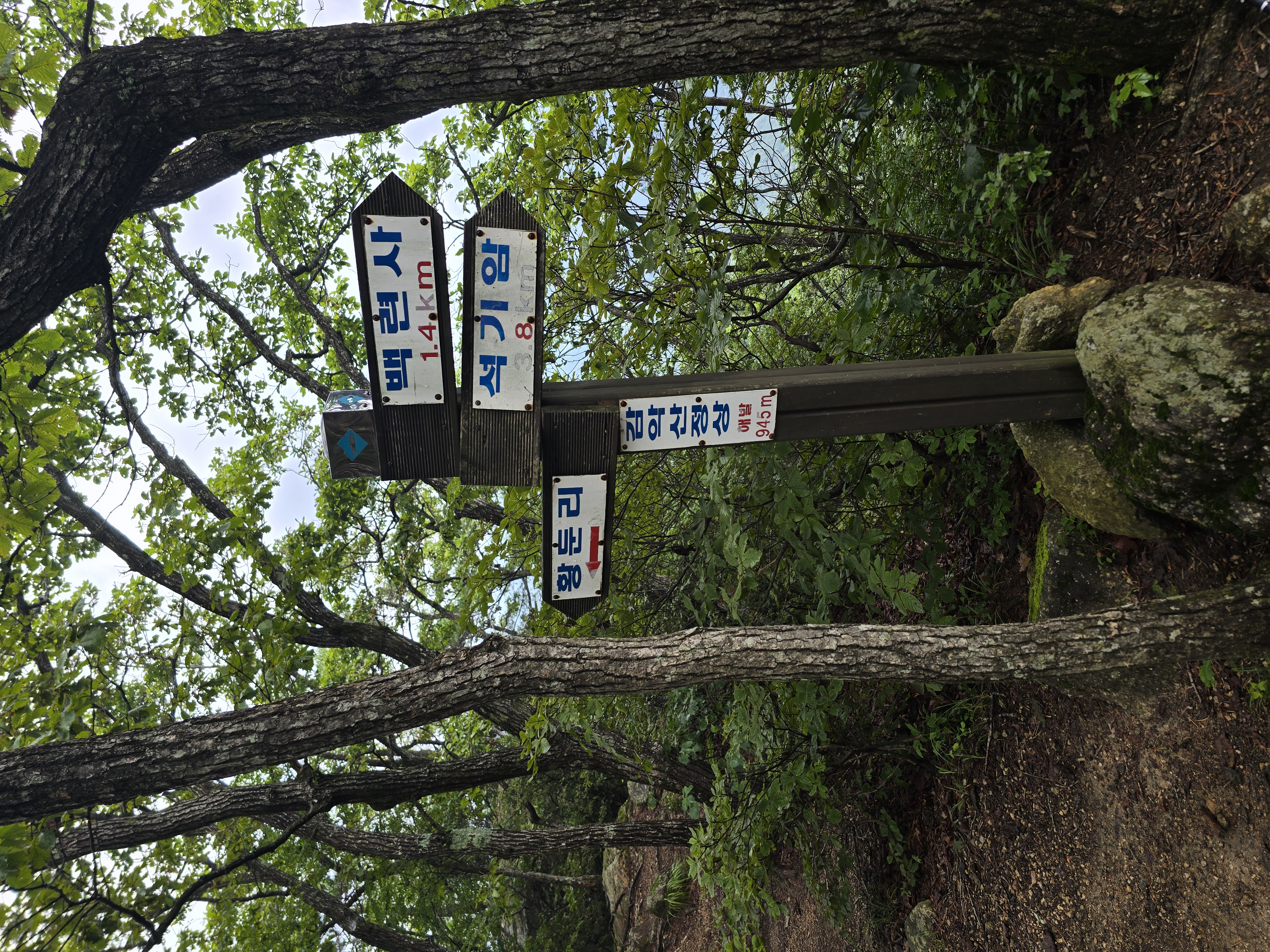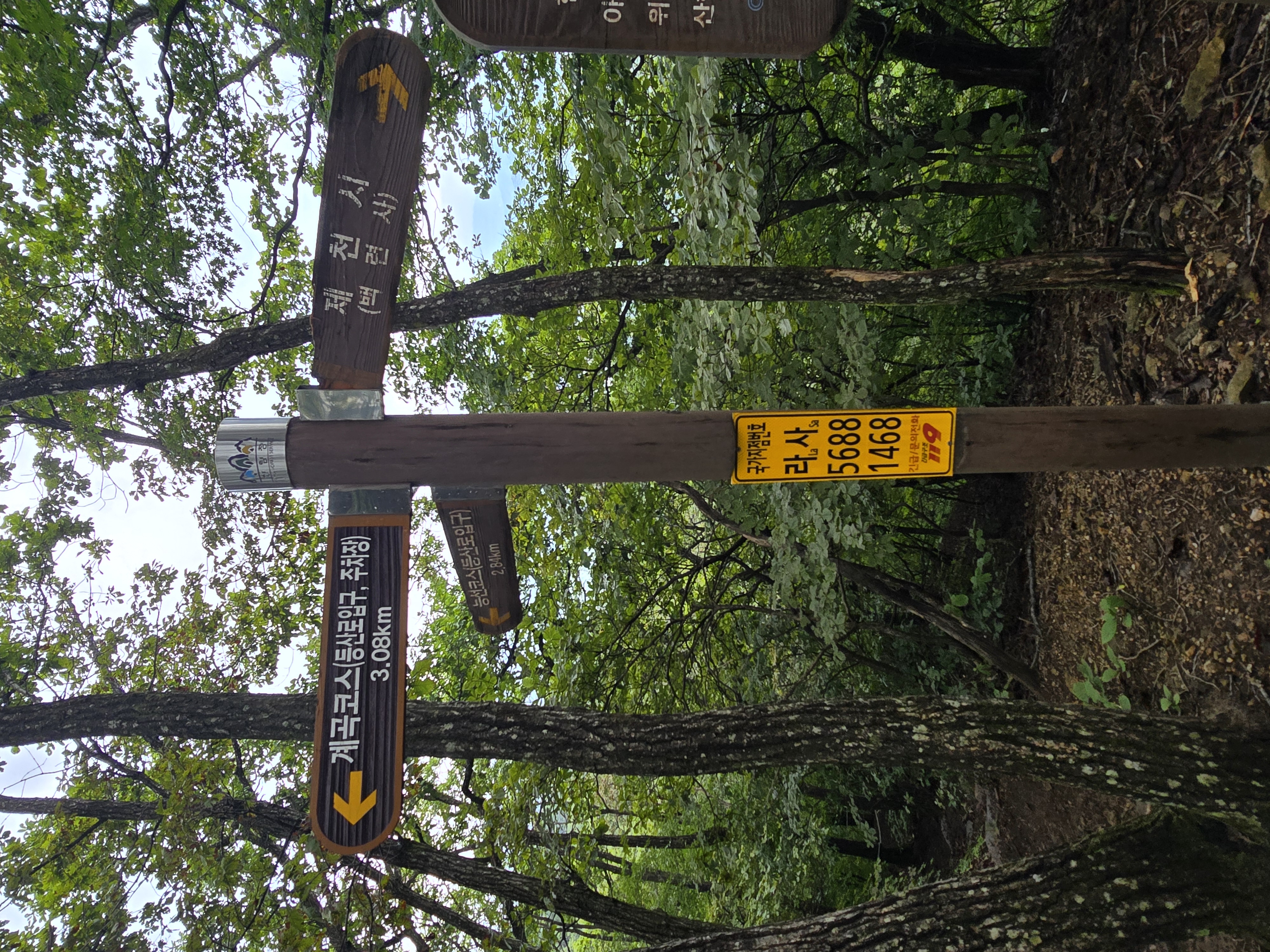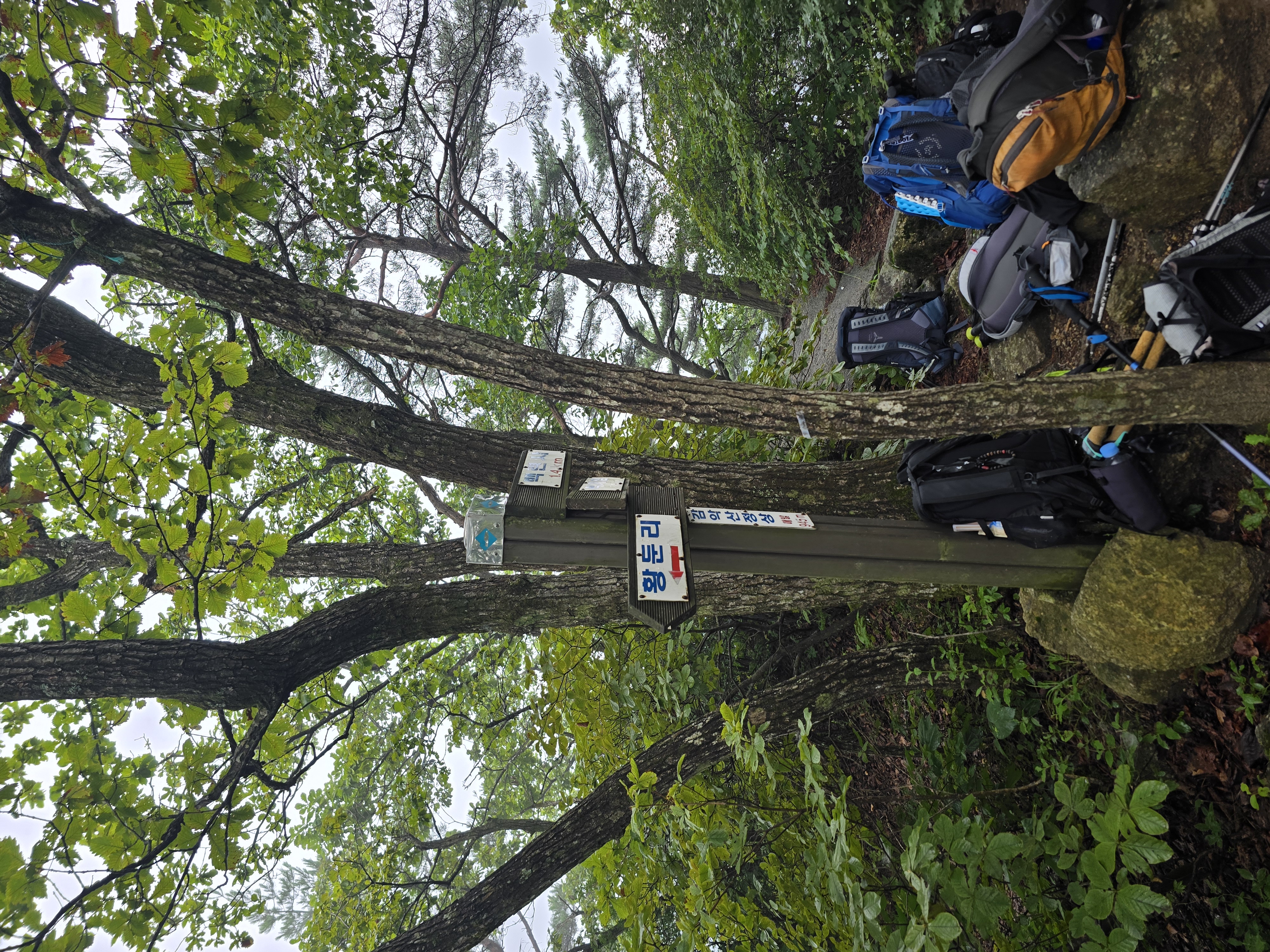 감악고개에서 시작하는 오르막은 본격적인 산행의 시작을 알린다. 계곡에는 바람이 없고 습도가 높았던 반면, 본격 오르막에서는 바람도 불고 습도가 적어 오히려 상쾌한 걸음이 가능한다. 조금씩 조망도 트이고 있다. 다소 흐린 날씨라 100%의 조망을 감상하지는 못하지만, 그래도 산행을 하는 데는 크게 도움이 된다. 더운 가운데에도 조금씩 가을의 기운이 느껴지기 시작한다. 등산의 계절이 턱밑에 다가온 듯해서 기분이 좋아진다. 길지 않은 오르막을 올라, 계곡코스와 능선코스가 만나는 지점에 이른다. 능선코스 방면으로 이동하면 원주 정상석이 있지만, 나는 제천의 정상석이 있는 오른쪽으로 향한다.