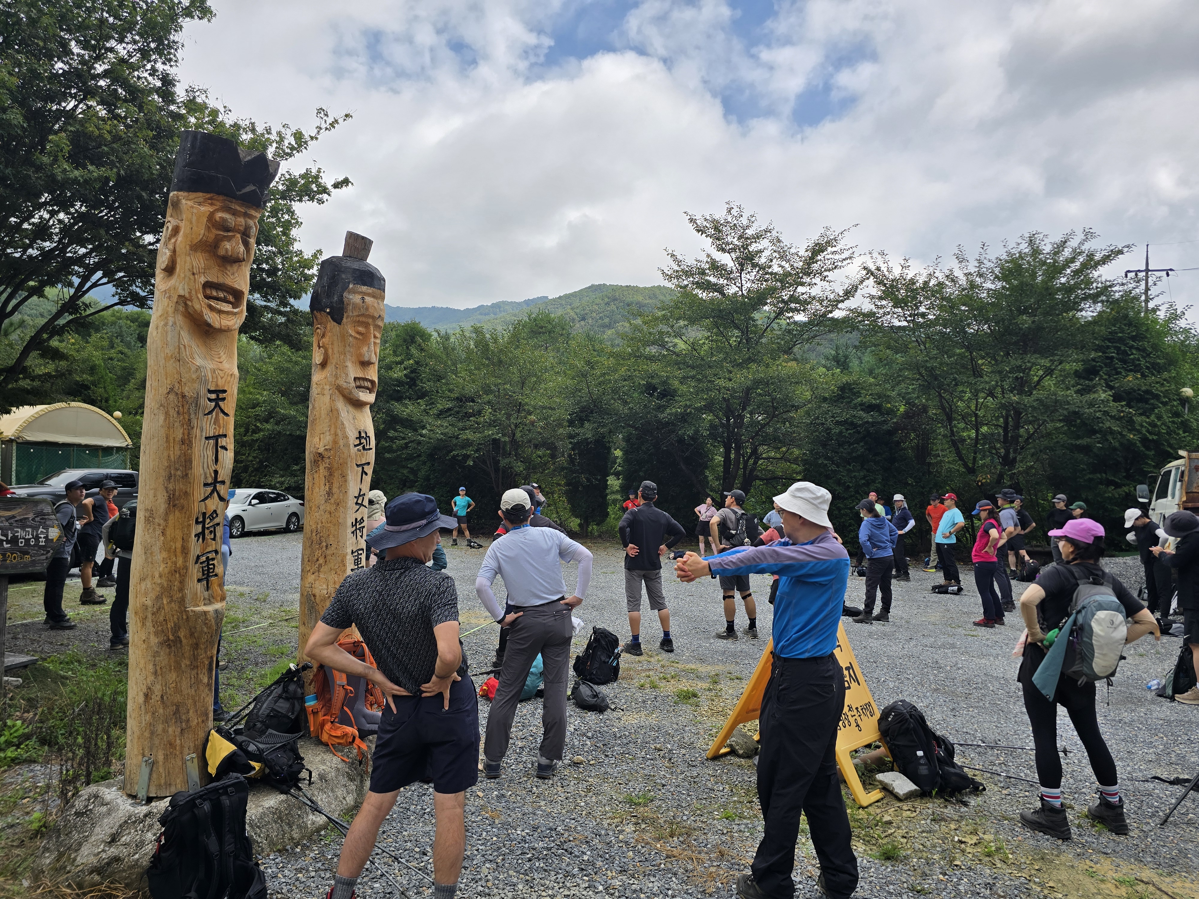폭염의 기세는 꺾일 줄은 모른다. 거기에 주말마다 이어지는 폭우는 산행 일정을 짜기 어렵게 만든다. 주말에 전국적으로 비 예보가 있는 가운데 그나마 강원도 방향은 거의 비소식이 없거나, 소량의 비가 예상된다. 오래전에 예약했던 원주(제천) 감악산을 그나마 부담 없이 출발한다. 아침 일찍 오르면 기온이 높아지기 전에 내려올 수 있다는 생각을 가지고 출발한다. 몇 년 전에 다녀왔던 감악산 쉼터 주차장에 10시가 되지 전에 도착한다. 인솔자의 리드에 따라 간단히 몸풀기를 마치고 산행을 시작한다.