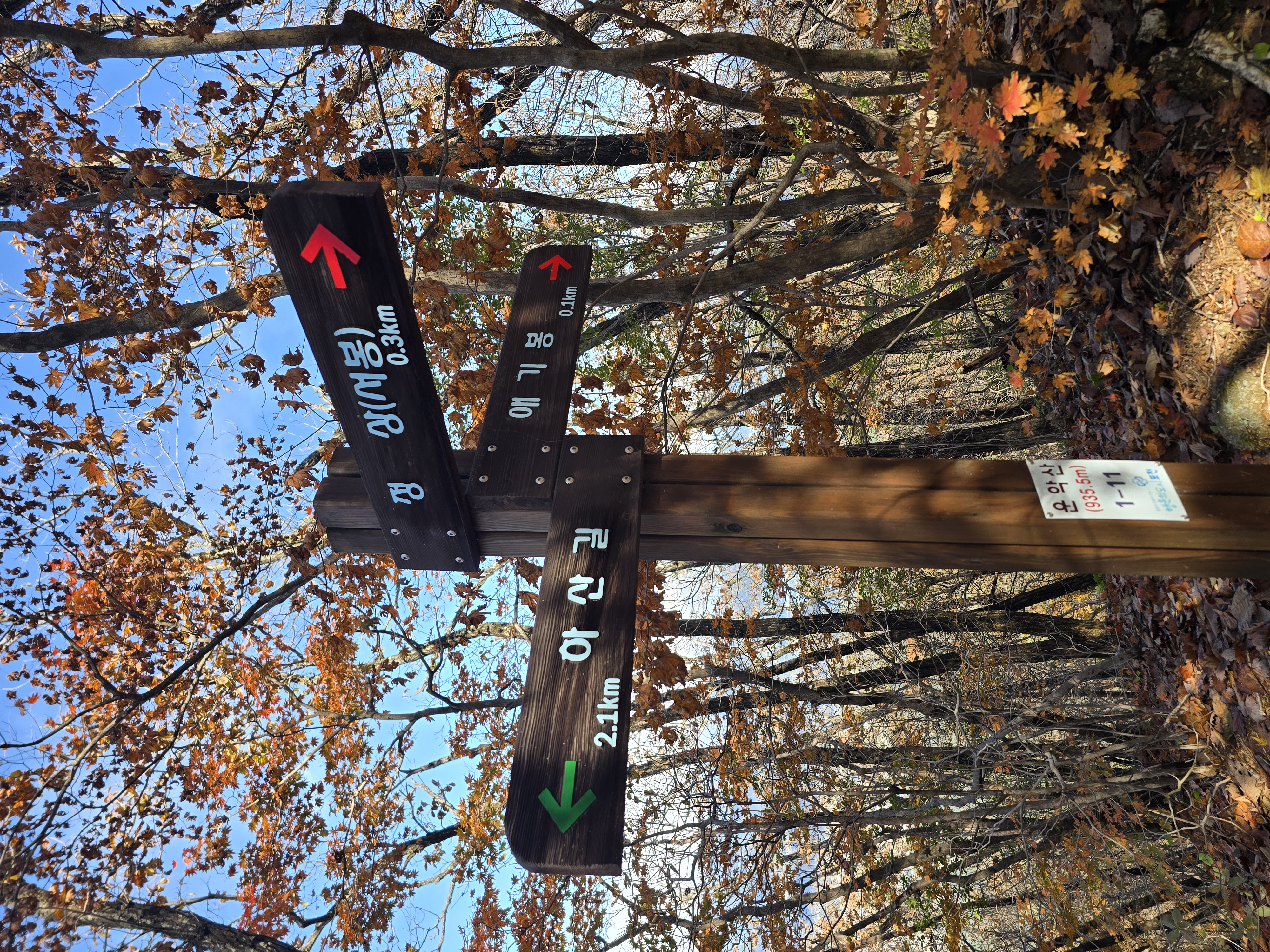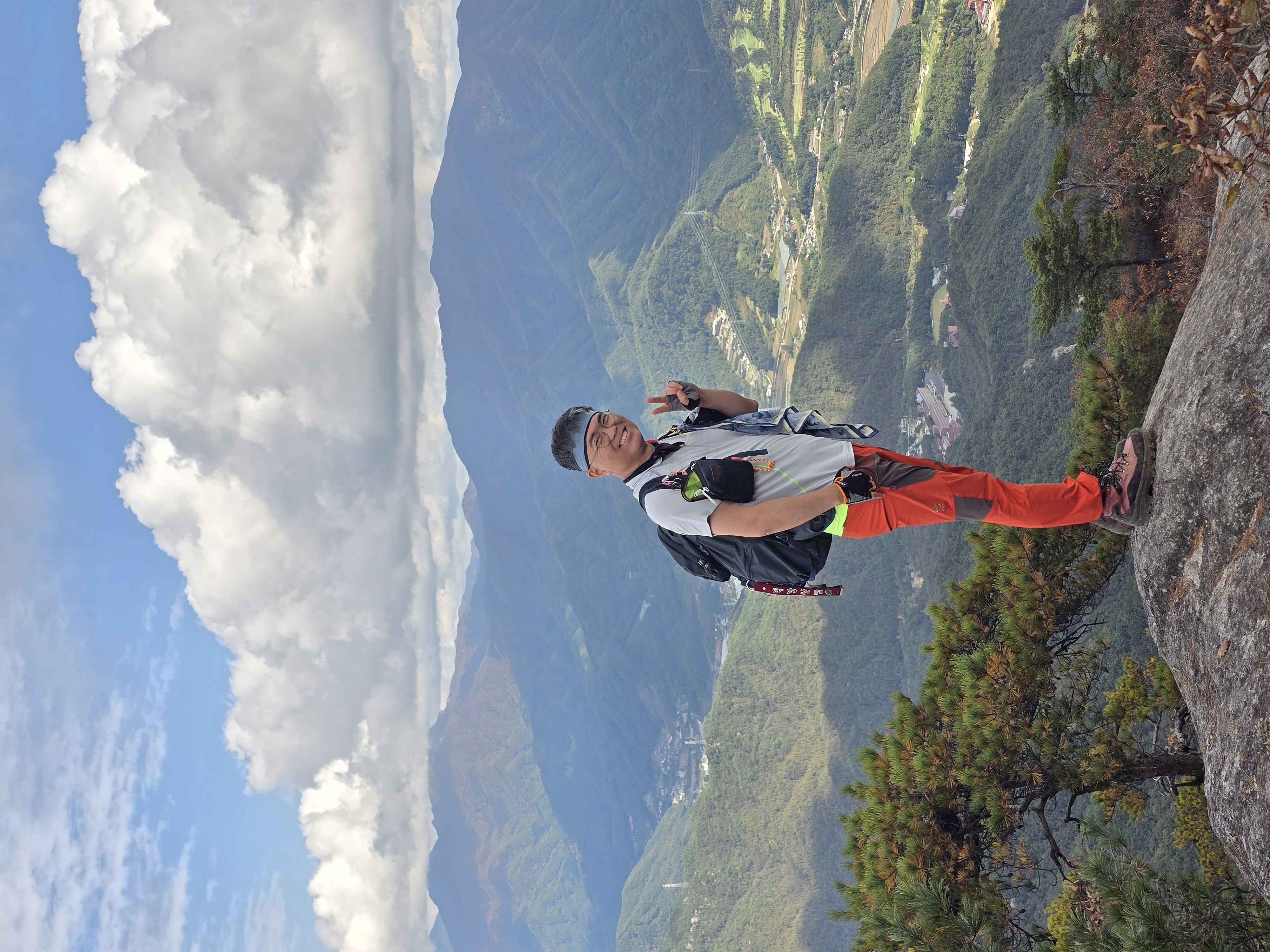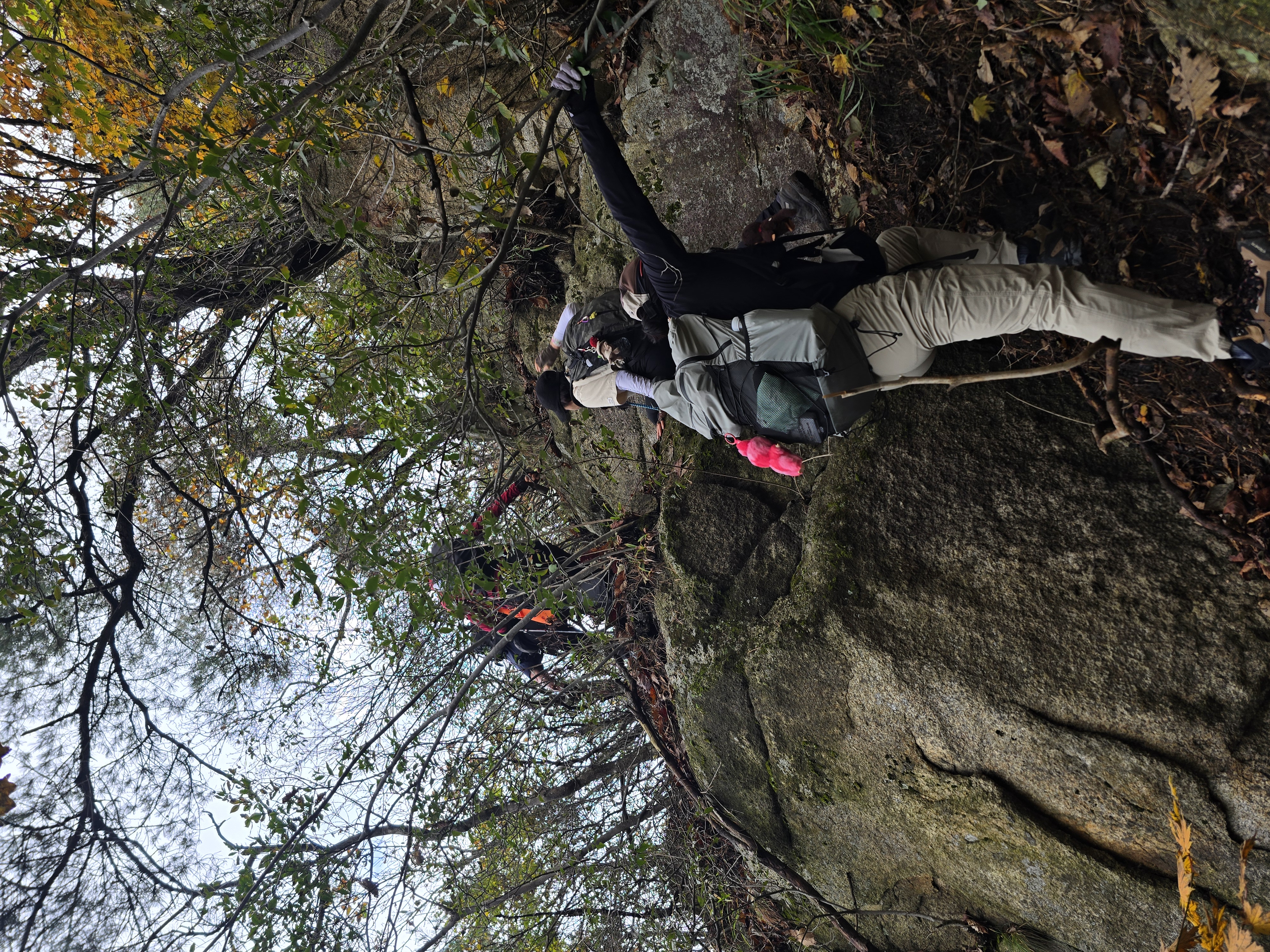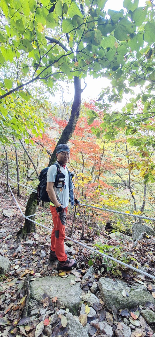 화려한 단풍이 하나 둘 보일 때쯤 길을 잘못 들어선다. 전일까지 계속 내렸던 비로 등산로가 미끄러운데, 위험한 비탐길을 한참이나 헤매고 오른다. 시원할 날씨에도 온몸에 땀이 흥건하다. 그래도 돌아갈 수 없다. 힘들게 조심조심 오르고 또 오른다. 십 년 감수한 끝에 능선길에 접어든다. 정상적인 등산로가 바로 우측 편에 있었던 모양이다. 일행 중 후미에서 꽤 뒤처져서 따라왔던 이들이 그쪽으로 올라오고 있는 게 보인다. 어쨌든 선두와 후미가 만나서 서봉을 향해 계속 산행을 이어 나간다. 애기봉의 아름다운 자태를 좌측 편으로 남겨두고 서봉에 오른다.