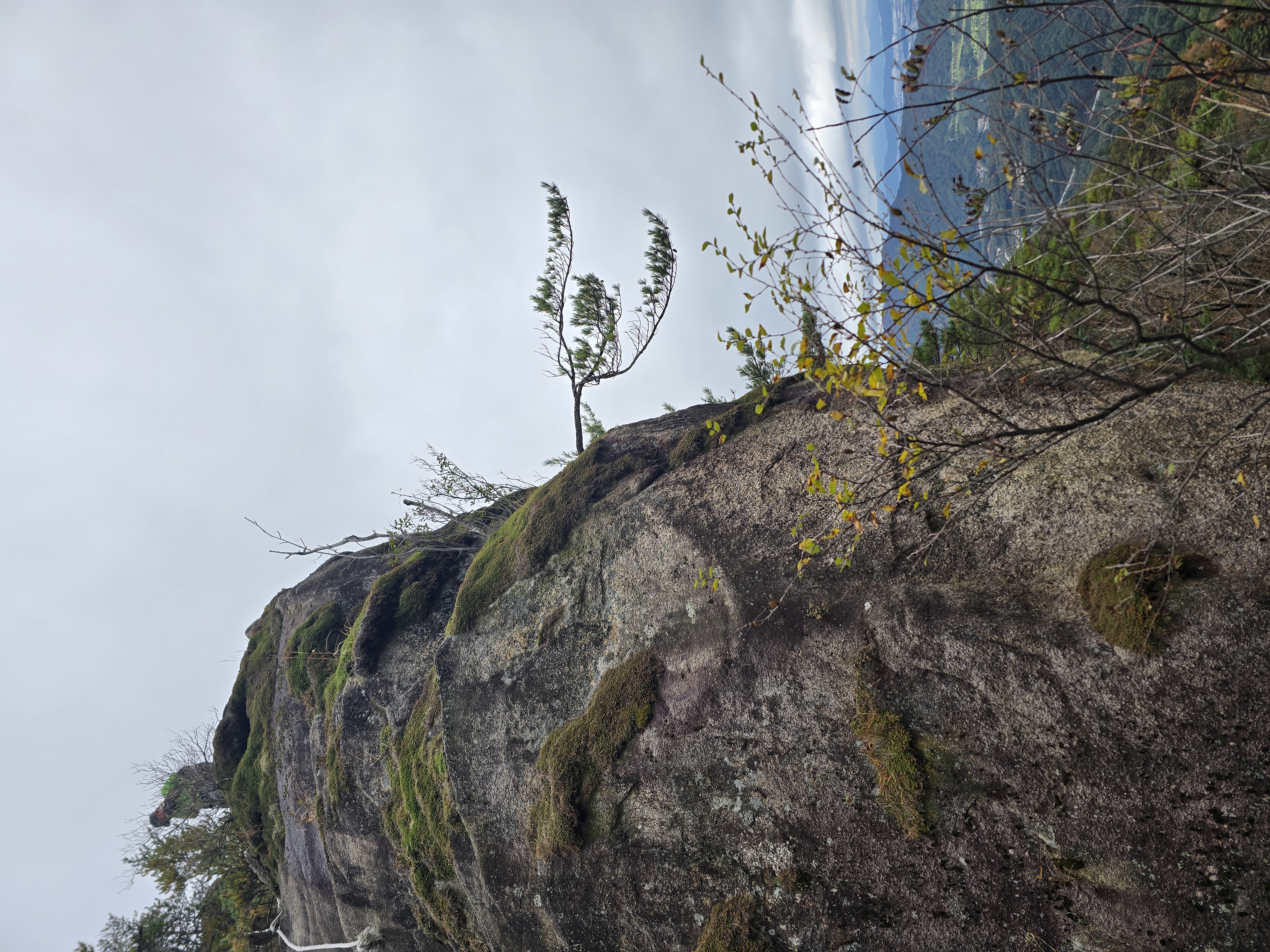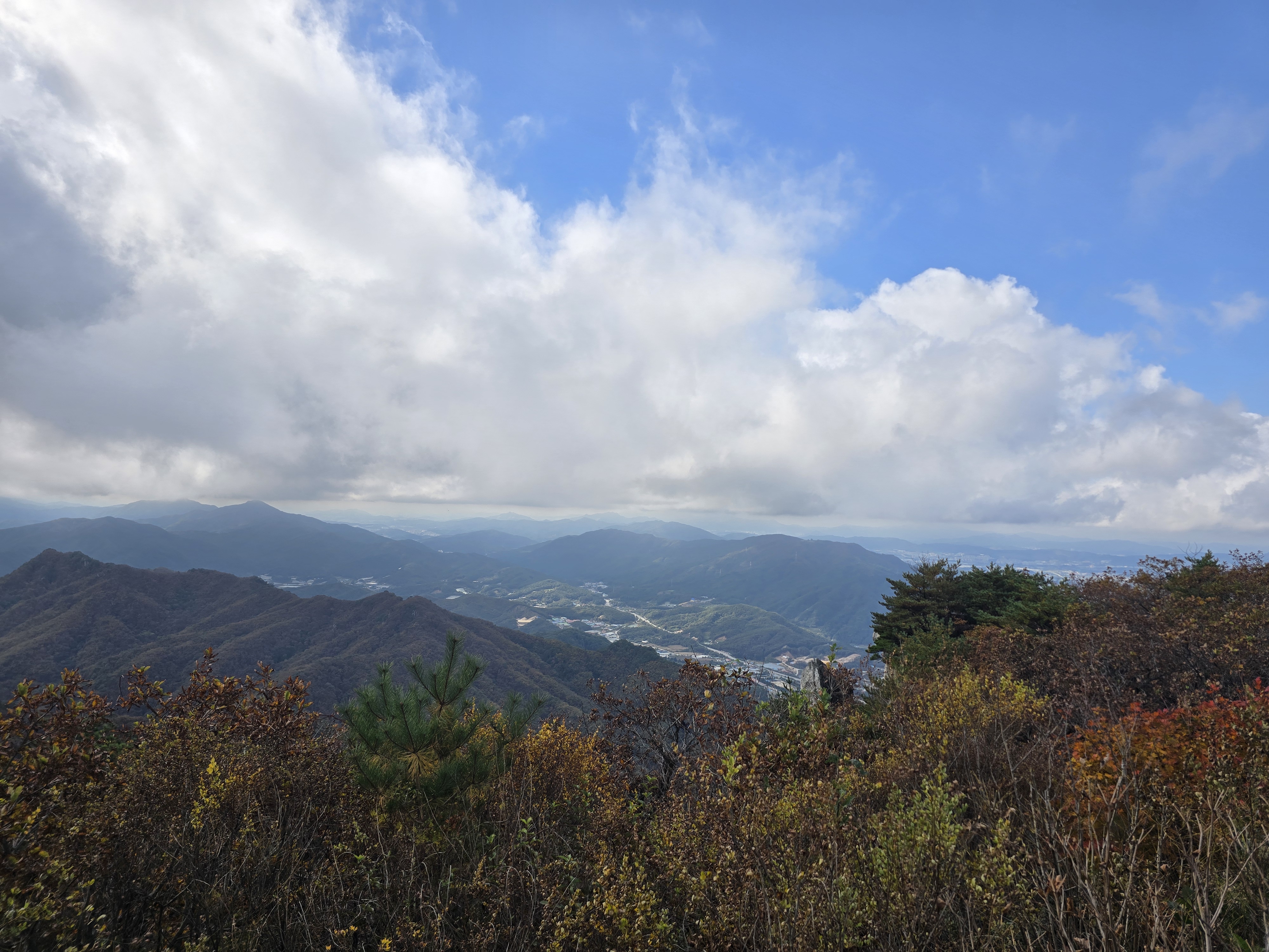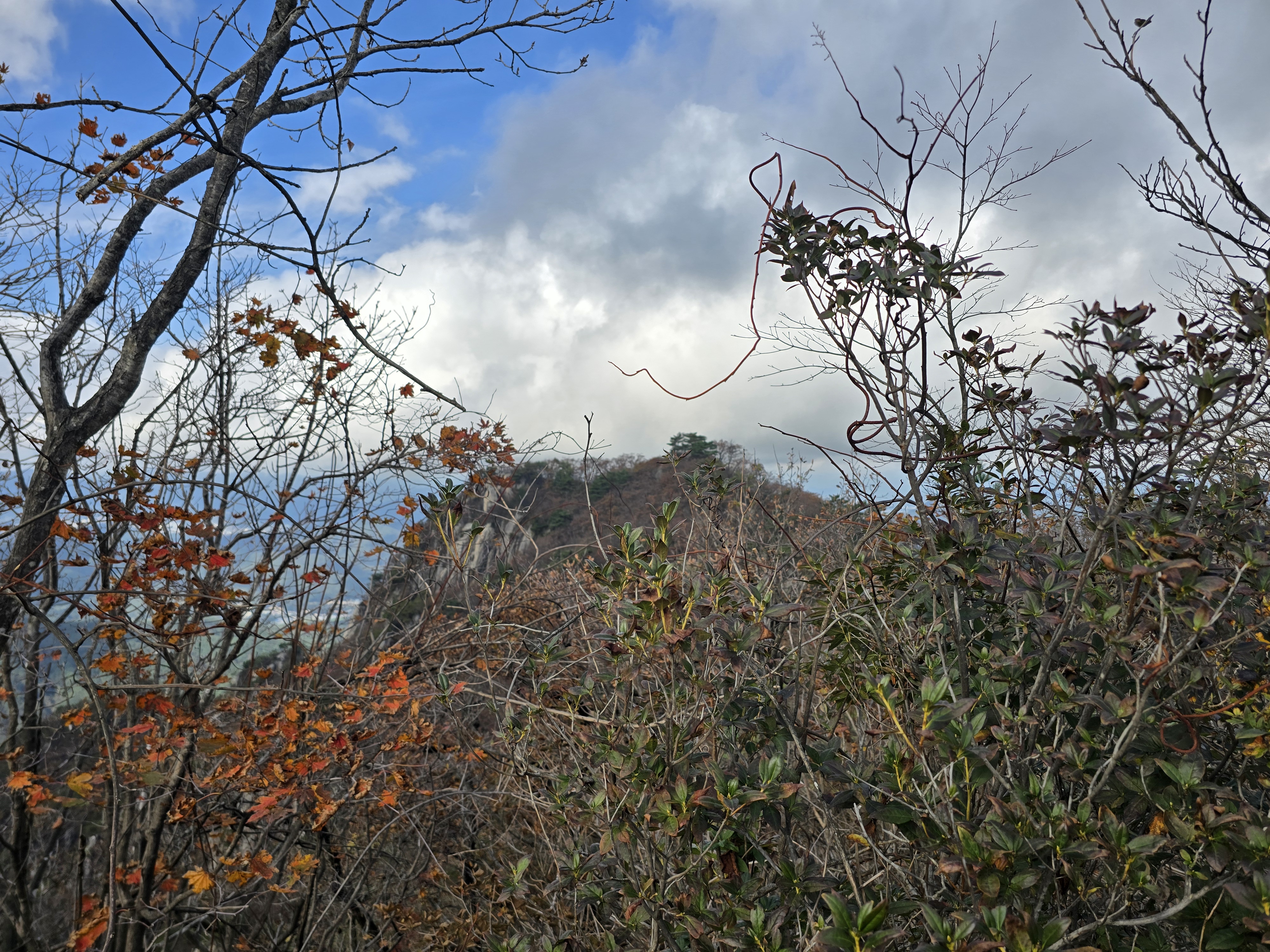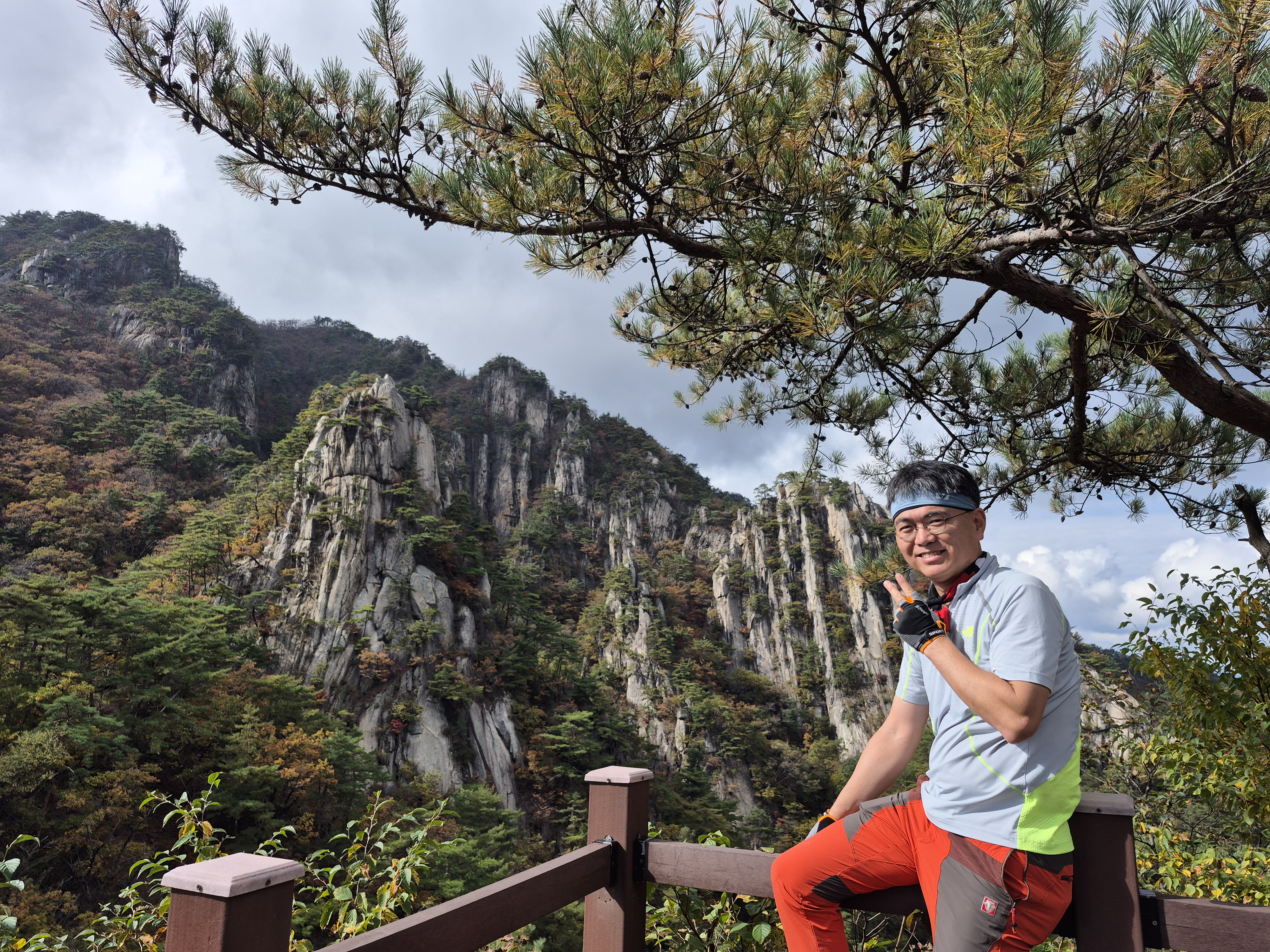 화려한 단풍이 하나 둘 보일 때쯤 길을 잘못 들어선다. 전일까지 계속 내렸던 비로 등산로가 미끄러운데, 위험한 비탐길을 한참이나 헤매고 오른다. 시원할 날씨에도 온몸에 땀이 흥건하다. 그래도 돌아갈 수 없다. 힘들게 조심조심 오르고 또 오른다. 십 년 감수한 끝에 능선길에 접어든다. 정상적인 등산로가 바로 우측 편에 있었던 모양이다. 일행 중 후미에서 꽤 뒤처져서 따라왔던 이들이 그쪽으로 올라오고 있는 게 보인다. 어쨌든 선두와 후미가 만나서 서봉을 향해 계속 산행을 이어 나간다. 애기봉의 아름다운 자태를 좌측 편으로 남겨두고 서봉에 오른다.