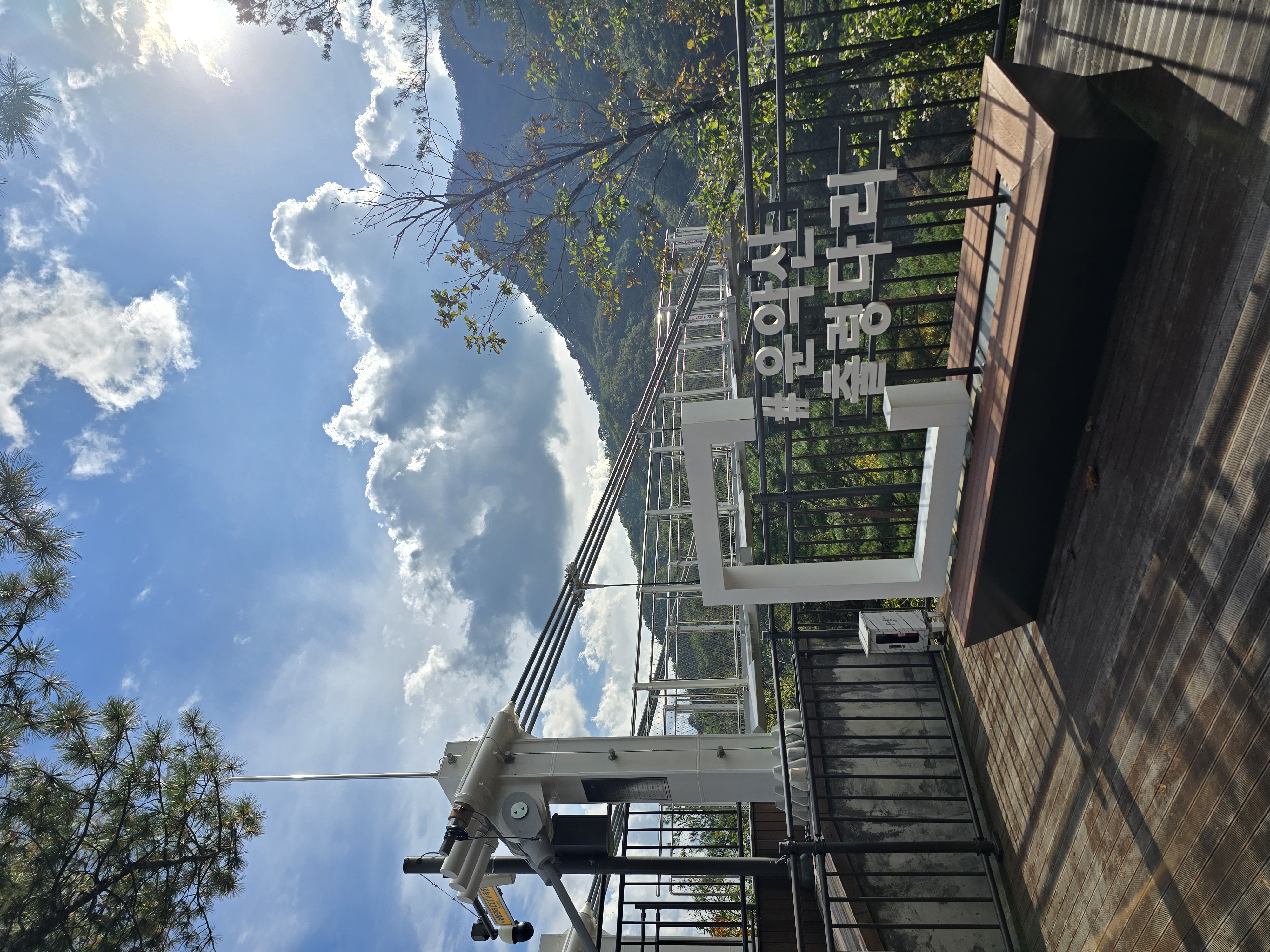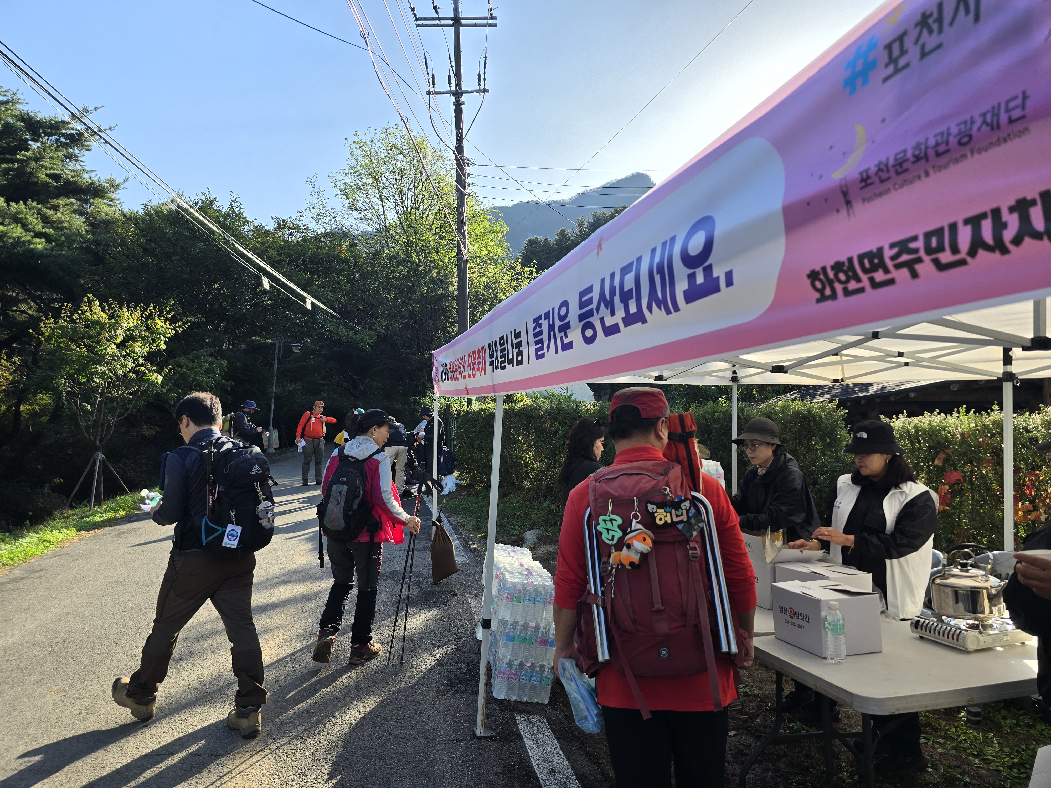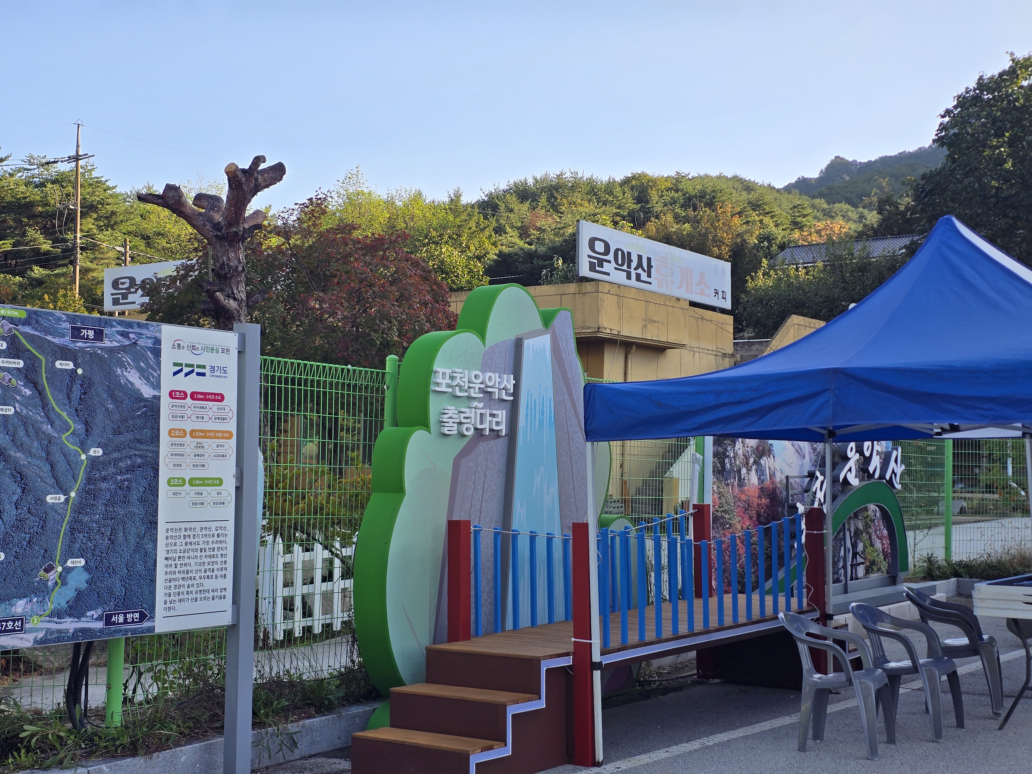 산악회 버스를 타고 운악산 휴게소에 도착하니, 주차장이 벌써 만차라 정신이 없다. 운악산 단풍축제 날(10월 19일)이라고 운악광장에는 무대를 설치하느라 한창 바쁘게들 움직인다. 휴양림으로 들어가는 입구에 운악산 단풍축제를 홍보하기 위해, 손수건과 생수 1통, 그리고 떡을 나눠주고 있다. 1 등산로 앞에서 간단하게 몸을 풀고 나서 계단을 통해 1 등산로 방향으로 산행을 시작한다. 산행하기 딱 좋은 날씨라 걷는데 힘이 난다. 무지치 폭포 전망대에서 울창한 숲에 가려 폭포가 제대로 보이지 않아 아쉽기만 하다.