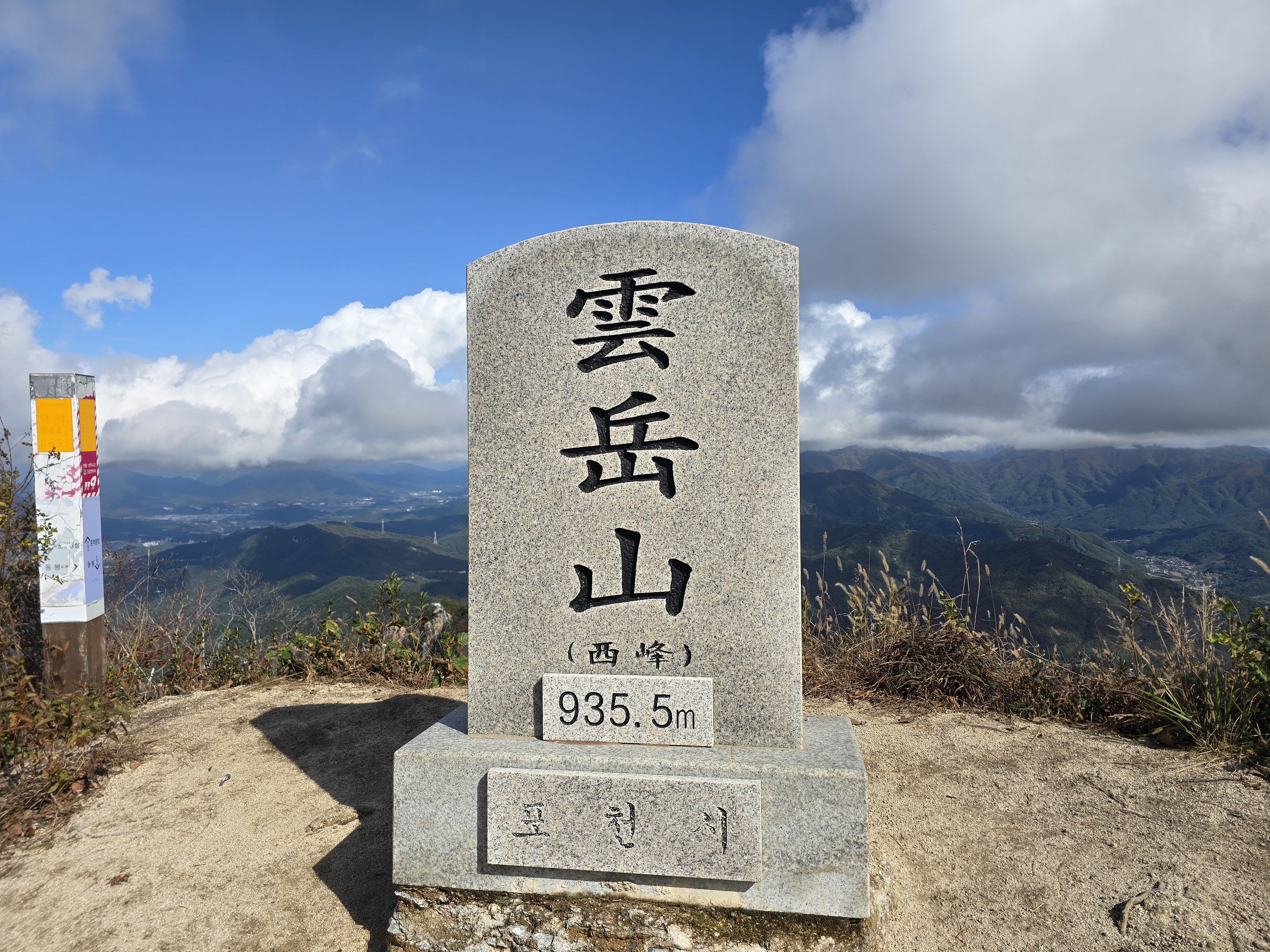 서봉은 포천 관할의 정상석이 서 있다. 이곳에서 기념사진을 한 장 찍고, 바로 옆 동봉으로 이동을 한다. 동봉은 가평군 관할의 정상석이 두 개나 있다. 여전히 아이스께끼 장수는 목청을 높이고 있다. 기념사진을 한 장 빠르게 찍고 나서 일행들과 식사를 한다. 비탐을 올랐던 무용담을 얘기하며 휴식을 취한다. 하산은 눈썹바위 방향이다. 운악산에서도 가장 전망이 좋은 코스가 바로 이 방향이다. 구름이 멋진 하늘을 배경 삼아 산그리메와 함께 사진에 연신 담아낸다.