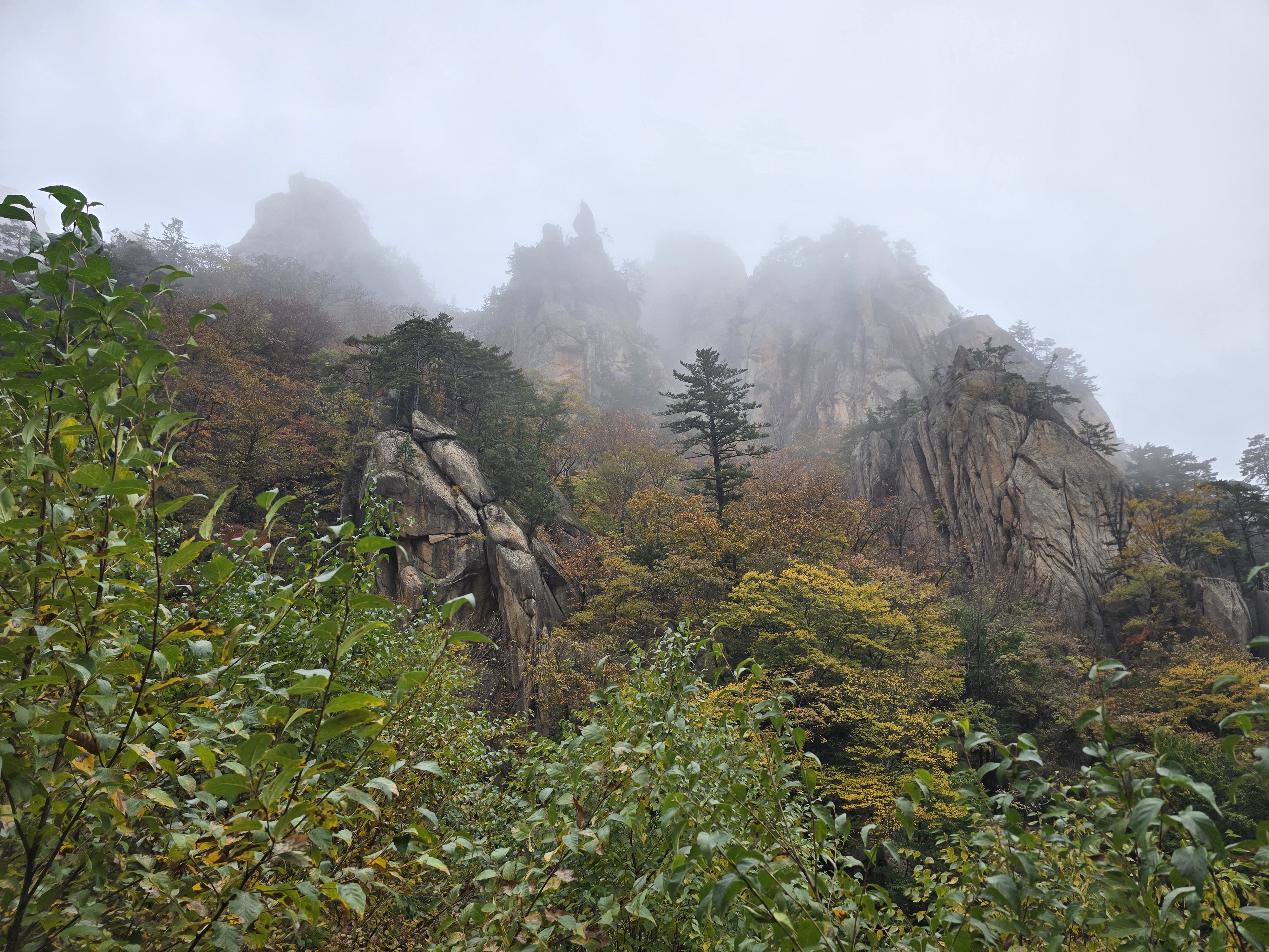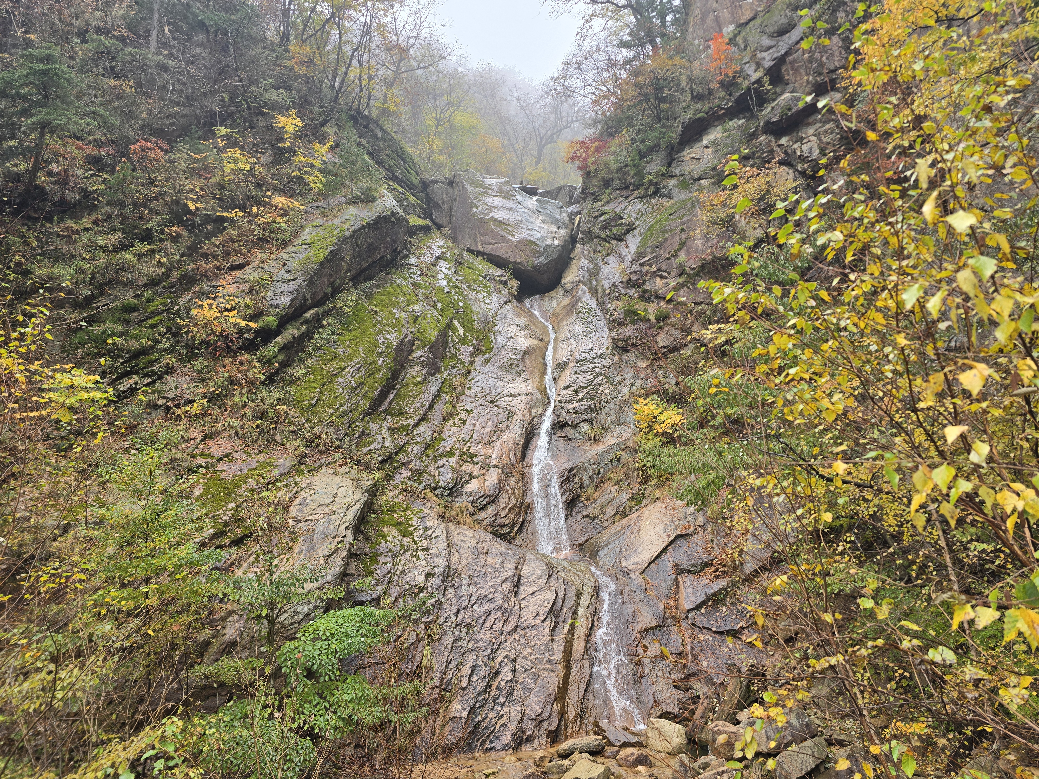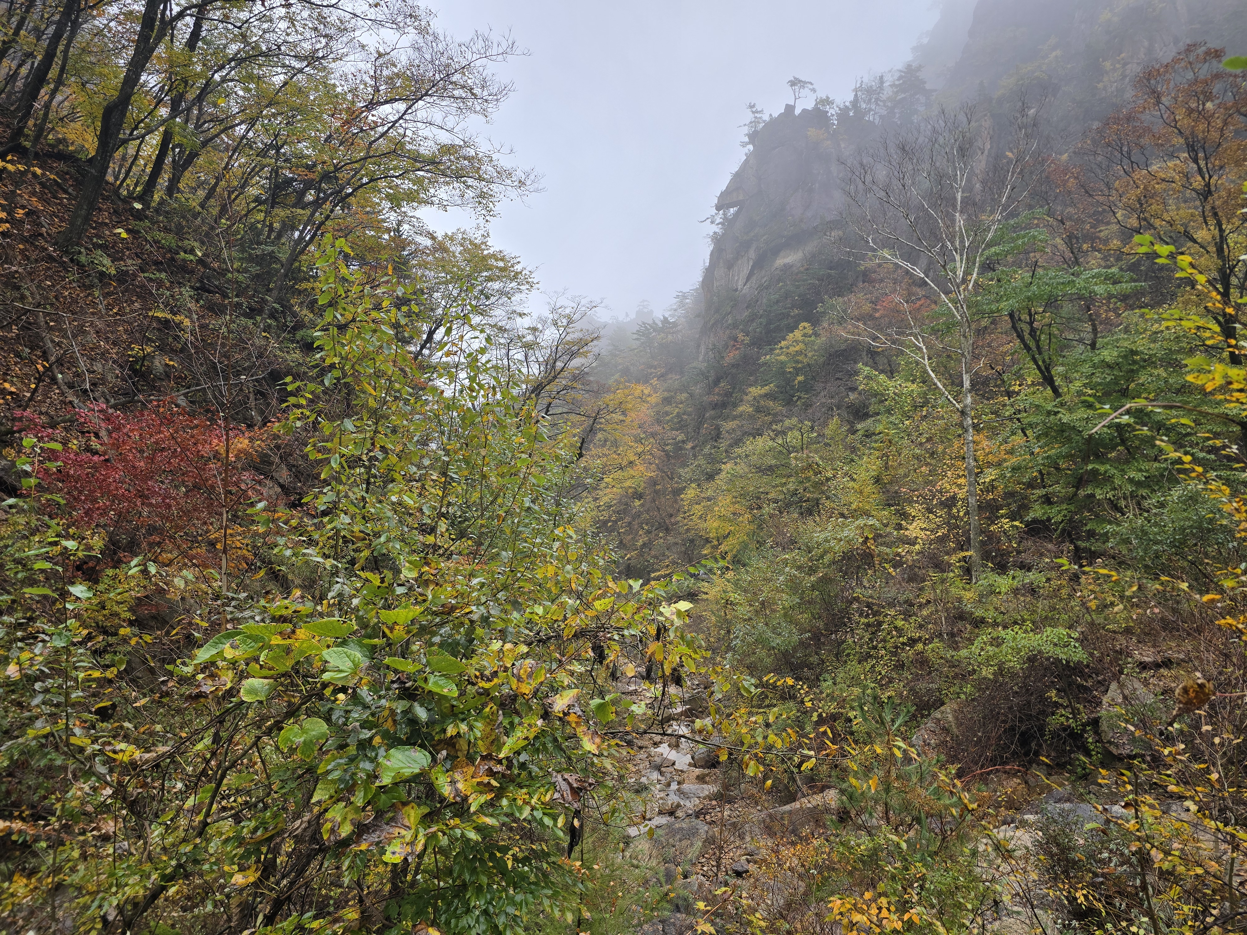 십이폭포를 지나며 절정의 감흥을 맛본다. 수량이 풍부한 폭포는 그 자체로 감동이다. 붉게 타오르는 단풍은 없지만, 안개 낀 날씨와 조화를 이루는 주전골의 구석구석은 감동을 주기에 충분하다. 용소삼거리를 지나고 선녀탕에 이르며 눈이 호강하는 협곡의 모습은 끝이 난다. 날머리인 오색약수터 탐방지원센터에 내려서며 올려본 설악산 주전골의 위용은 더할 나위 없다. 1년 전에 찾았던 숨겨진 맛집을 찾아 황태구이, 더덕구이 정식 하산식으로 1년 만의 설악산과의 재회를 자축한다.