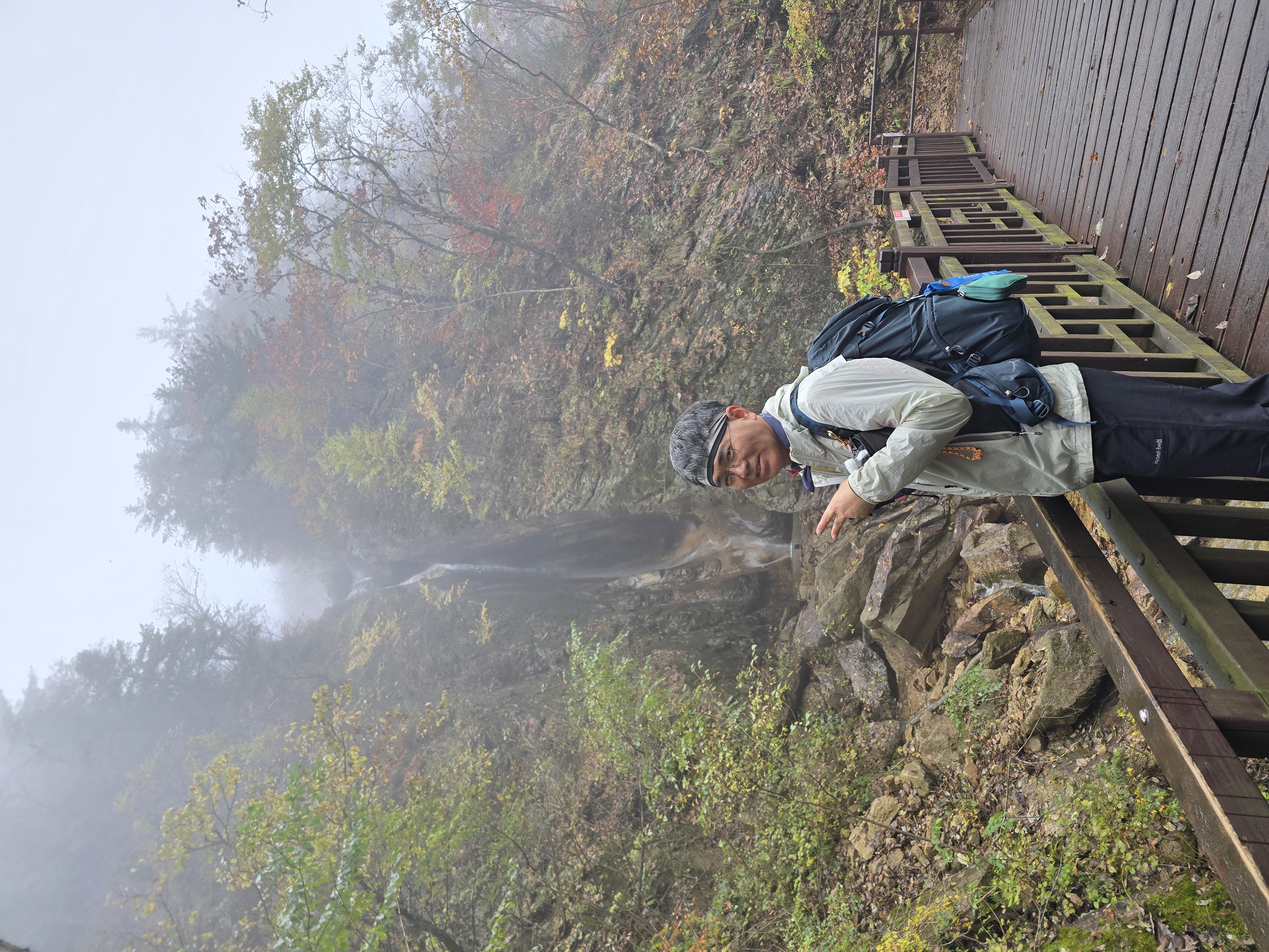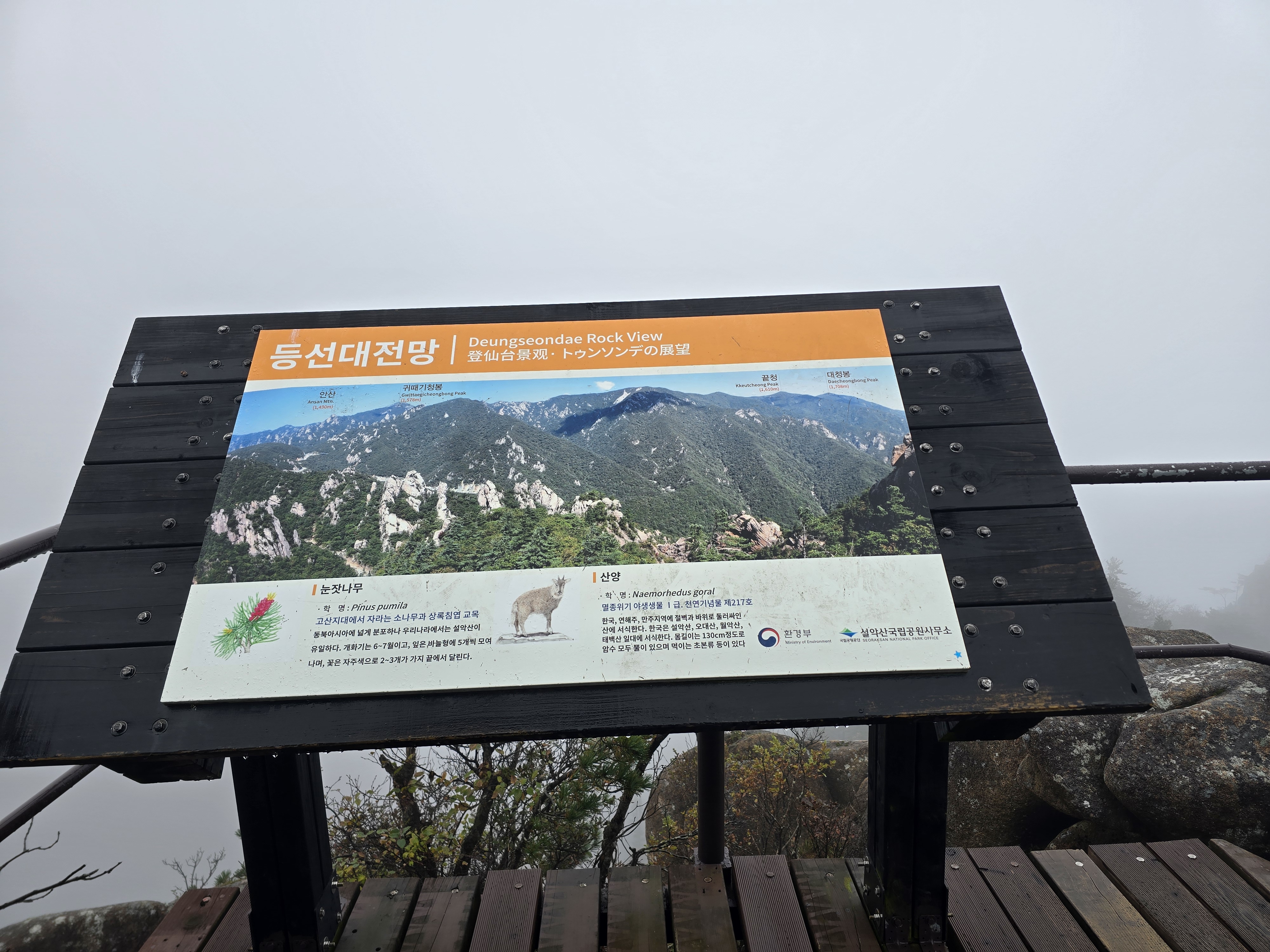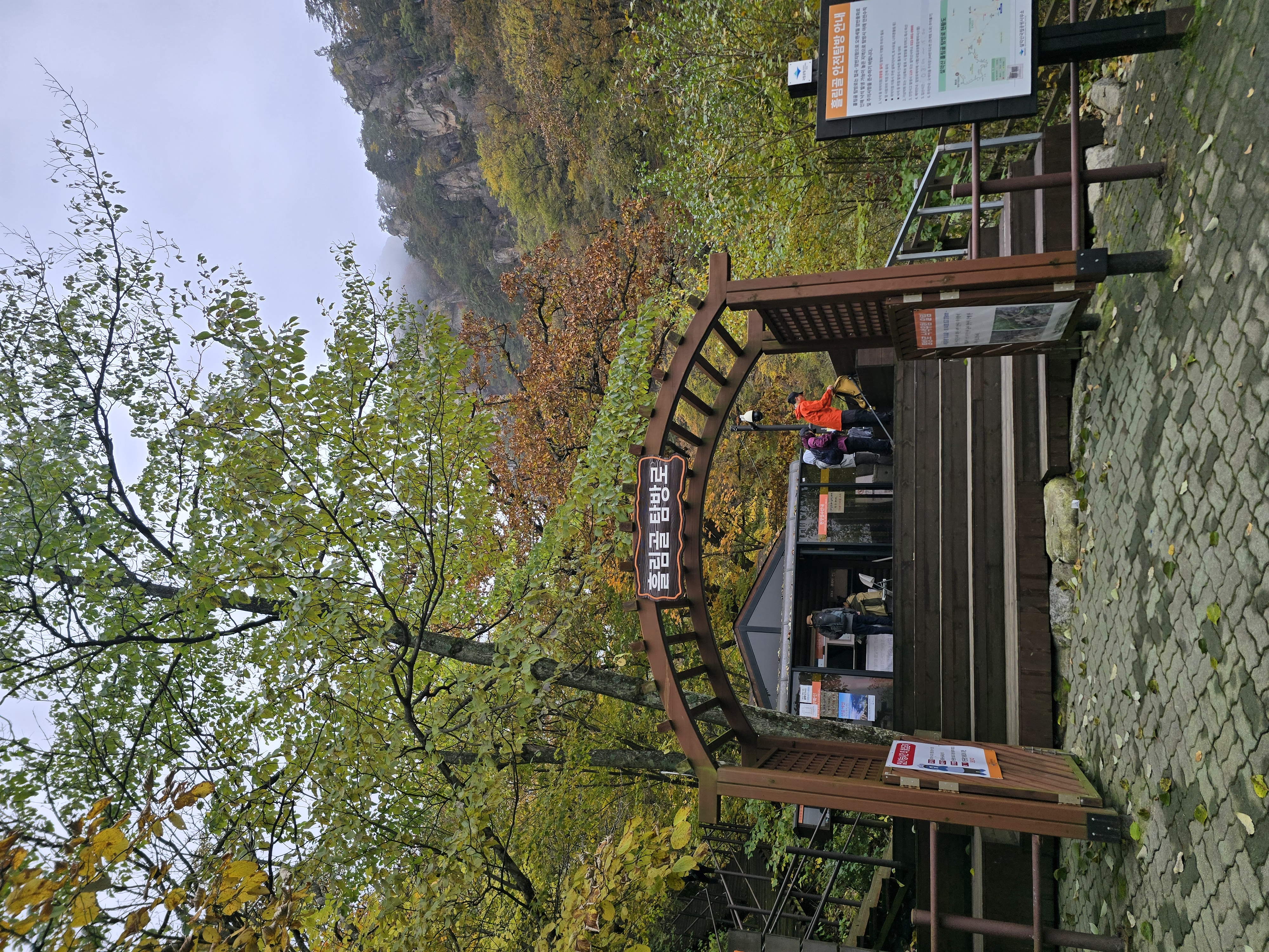 안내버스에서 내리며 날씨부터 챙긴다. 다행히 우려했던 비는 내리지 않고, 다만 안개가 뿌옇게 흐린 시야를 만든다. 올려다보는 흘림골의 봉우리들에서는 다소 아쉬운 단풍의 모습을 보여준다. 그래도 비가 안 오니 다행이라 생각하고 걷는다. 나무계단을 오르고 나서부터 계속해서 이어지는 오르막 구간이다. 1년 만에 찾아온 여심폭포의 위용(?)은 날씨 때문에 그다지 인상적이지 않다. 폭포에서 가파른 계단을 오르고 나서 맞이하는 등선대 안전쉼터의 모습이 반갑다. 앞이 거의 보이지 않는 곰탕(?) 조망에도 불구하고 등선대에 오른다. 사방의 조망이 전혀 볼거리를 주지 않는다. 아쉽지만 그래도 한번 더 찾은 것에 만족한다.