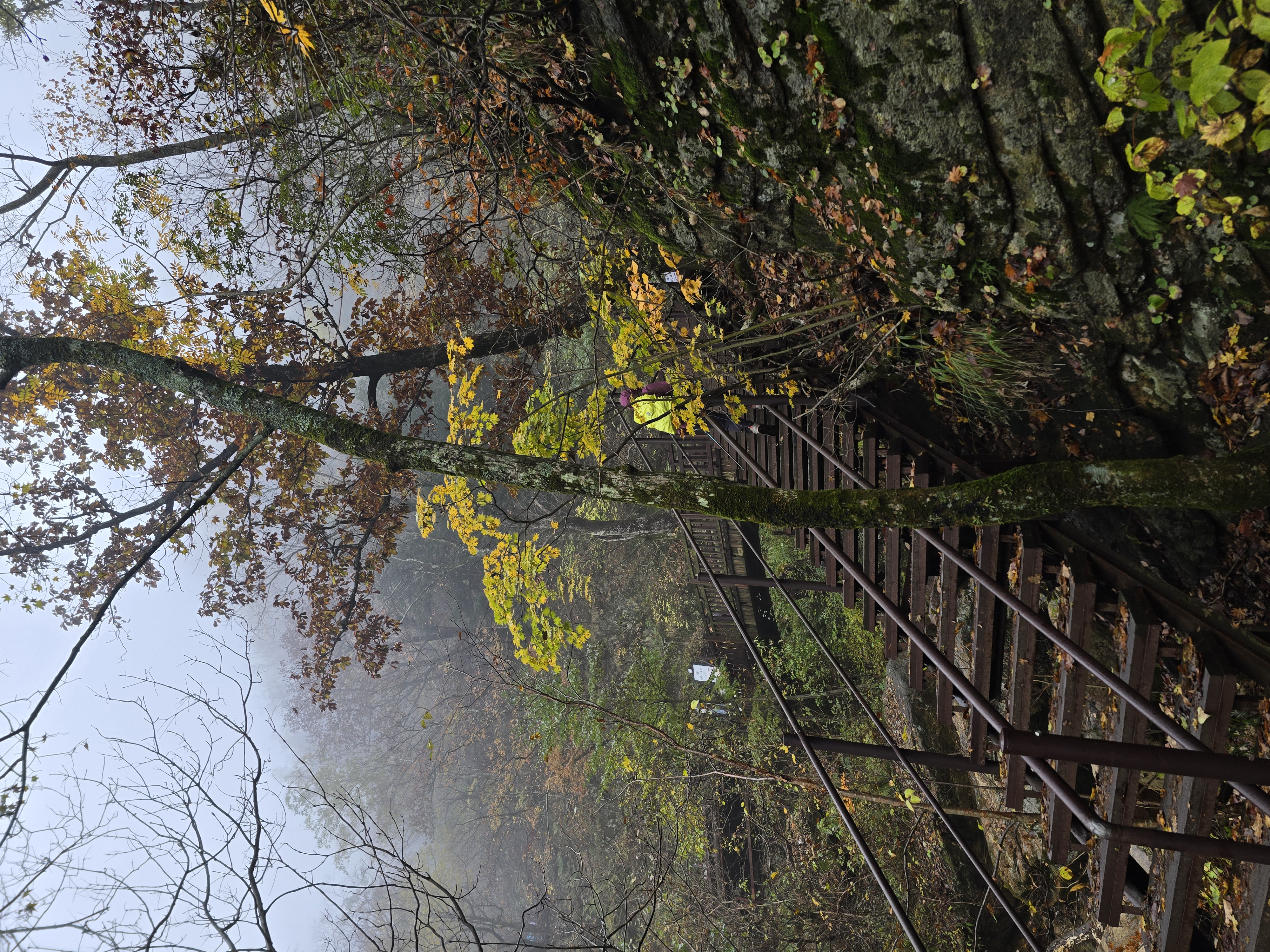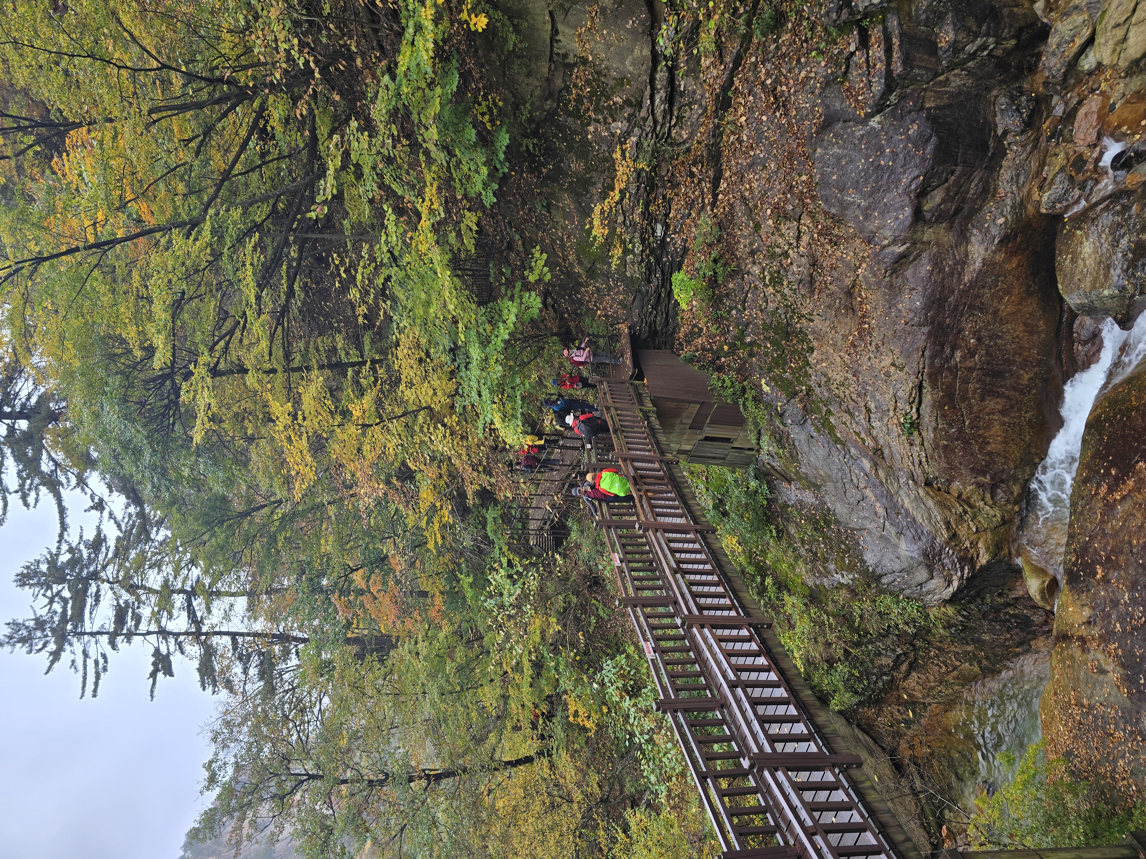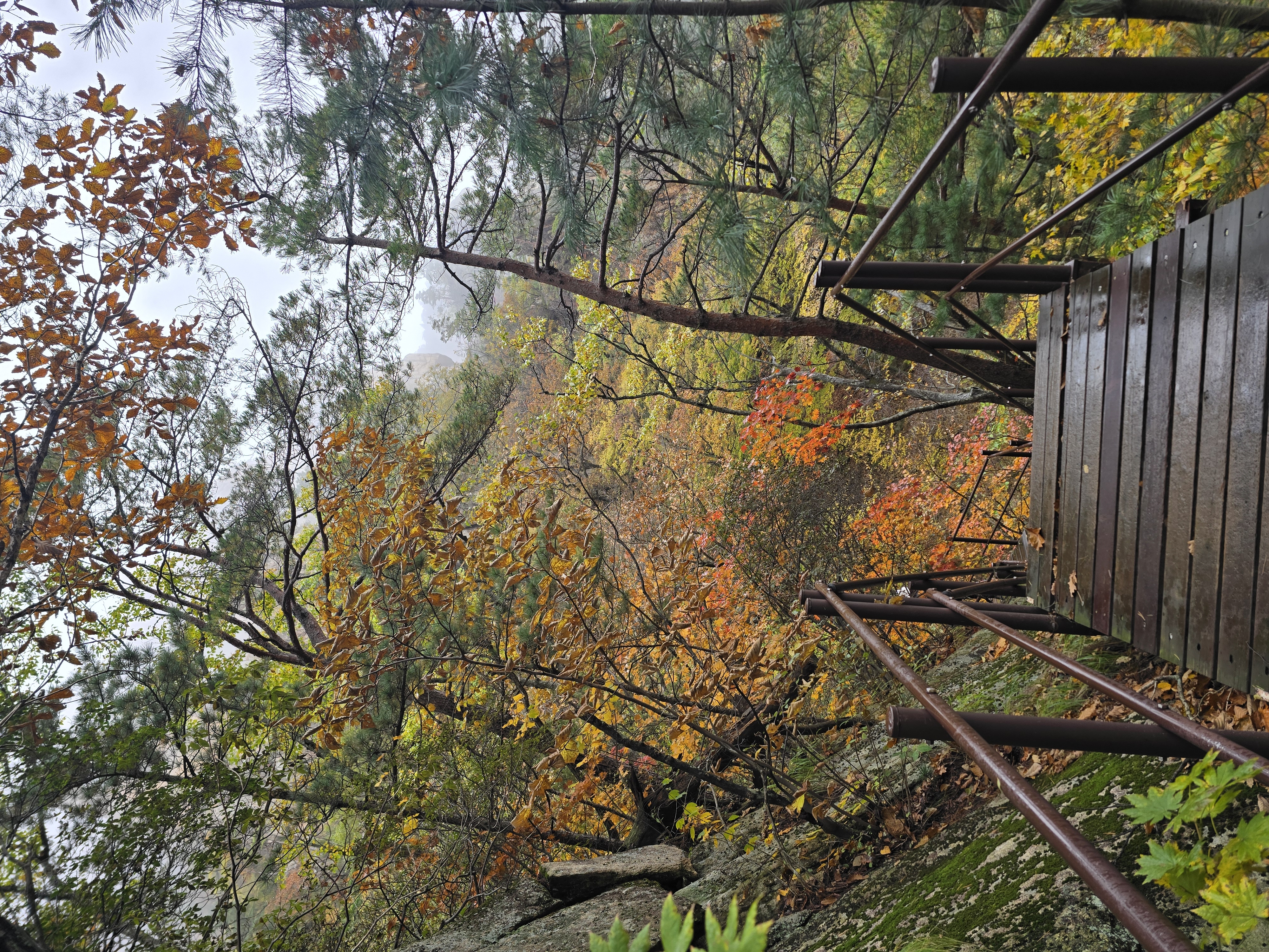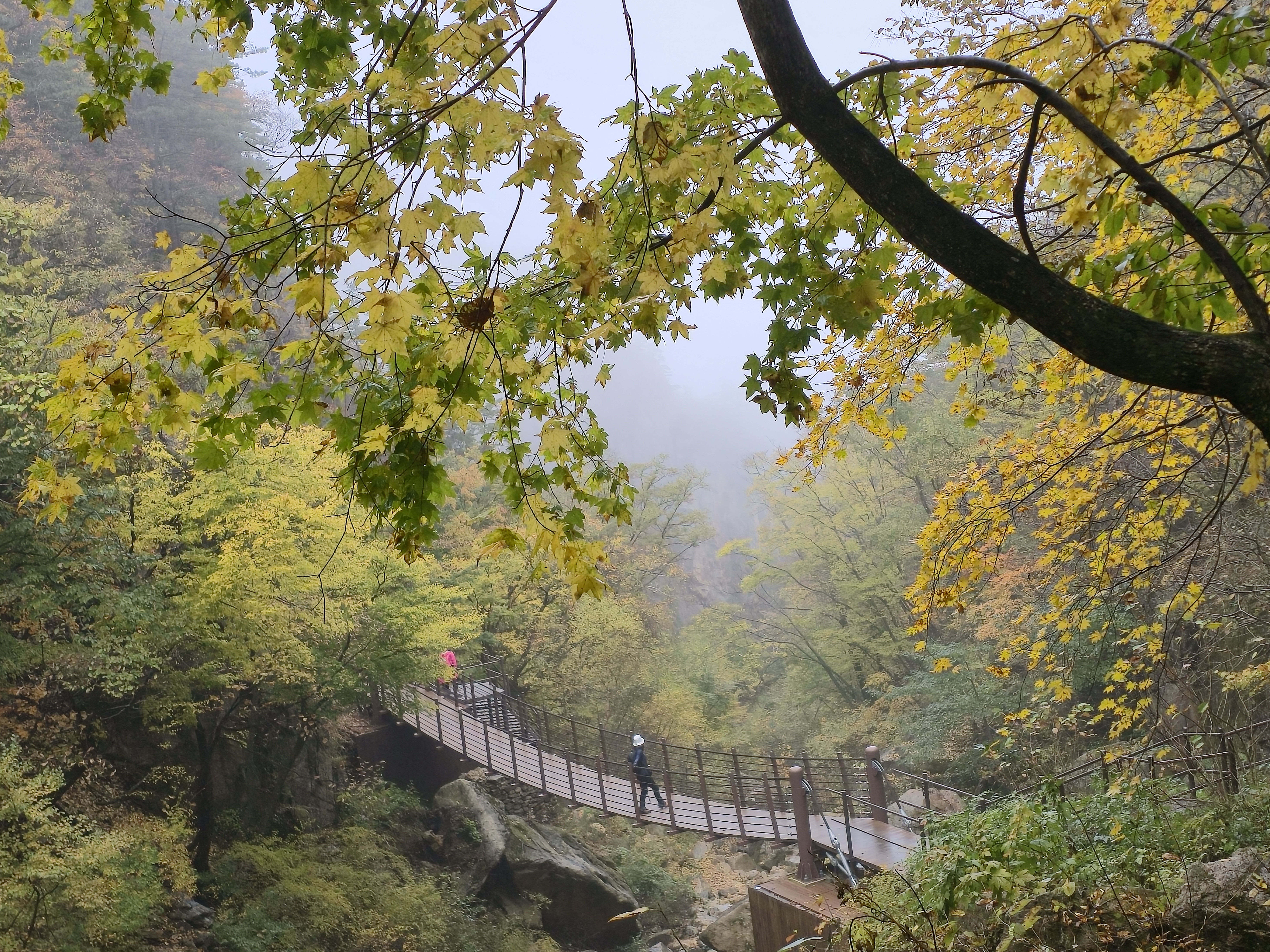 등선대에 올랐을 때 더해지던 흩날리던 안개비의 강도가 하산길에선 다소 잦아든다. 계단을 조심조심 내려가며 바라보는 조망은 가을의 낭만이 물씬 느껴진다. 등선폭포를 여유 있게 즐기고, 계속해서 주전골 계곡의 낭만을 만끽한다. 계단을 내려가고 운치 있는 다리를 건너며 발 디딜 때마다 낭만이 더해진다. 흩뿌리던 안개비도 이제는 더는 발길을 방해하지 않는다. 1년 전의 단풍과 거의 비슷한 모습이고, 다소 이른 느낌이지만, 그래도 눈 돌릴 때마다 감동의 순간을 제공한다. 한 마디로 힐링의 시간이다.