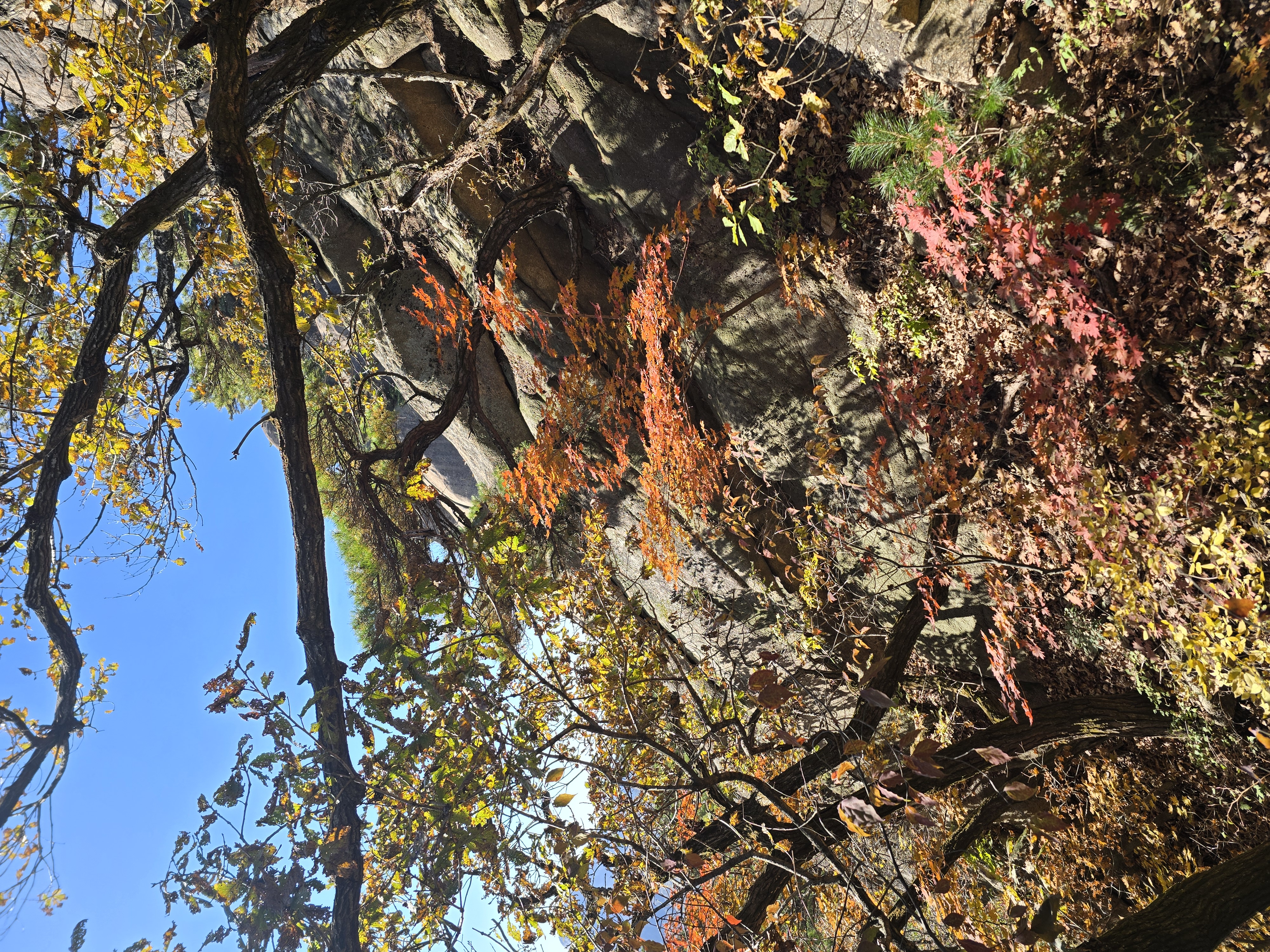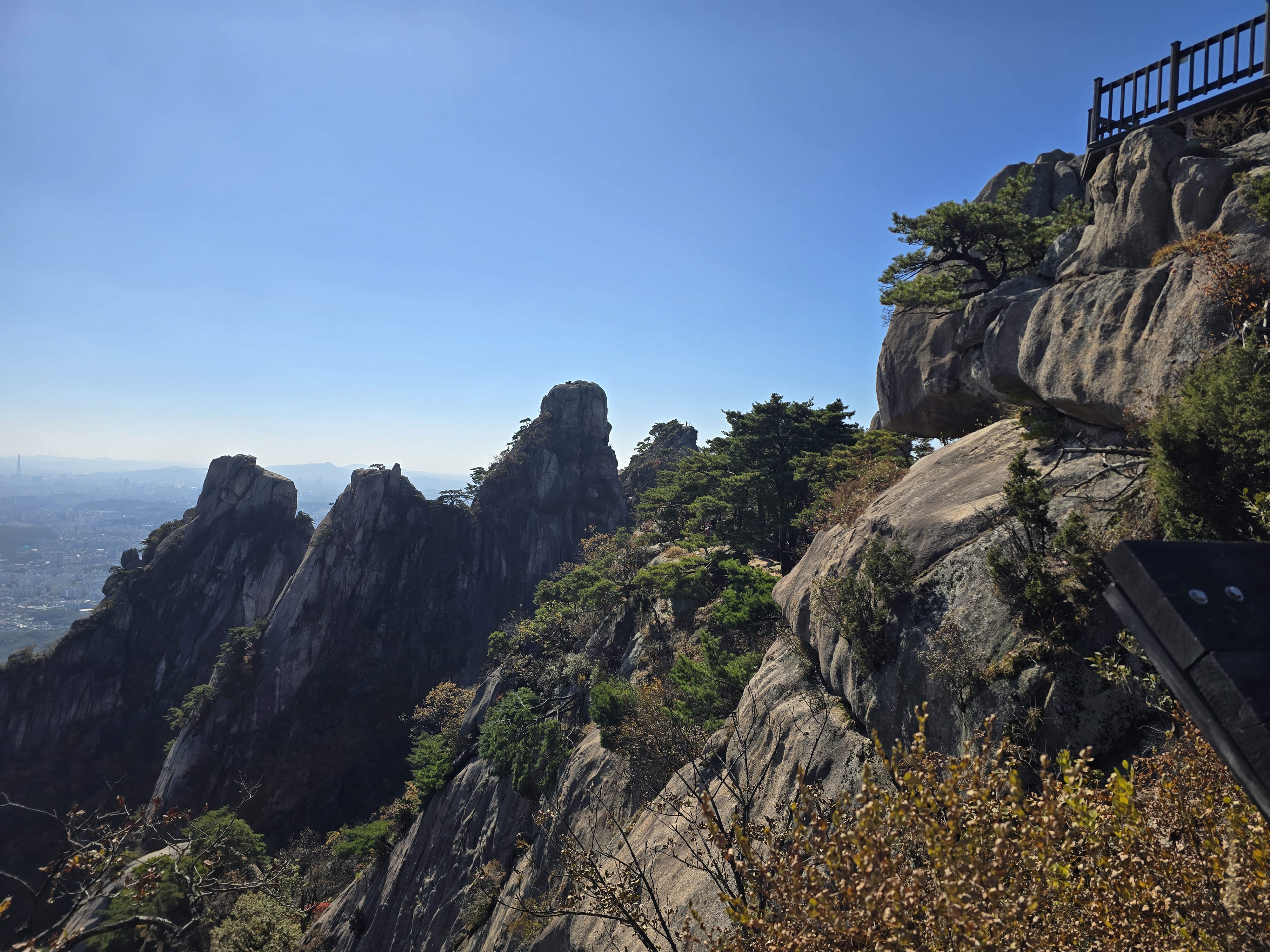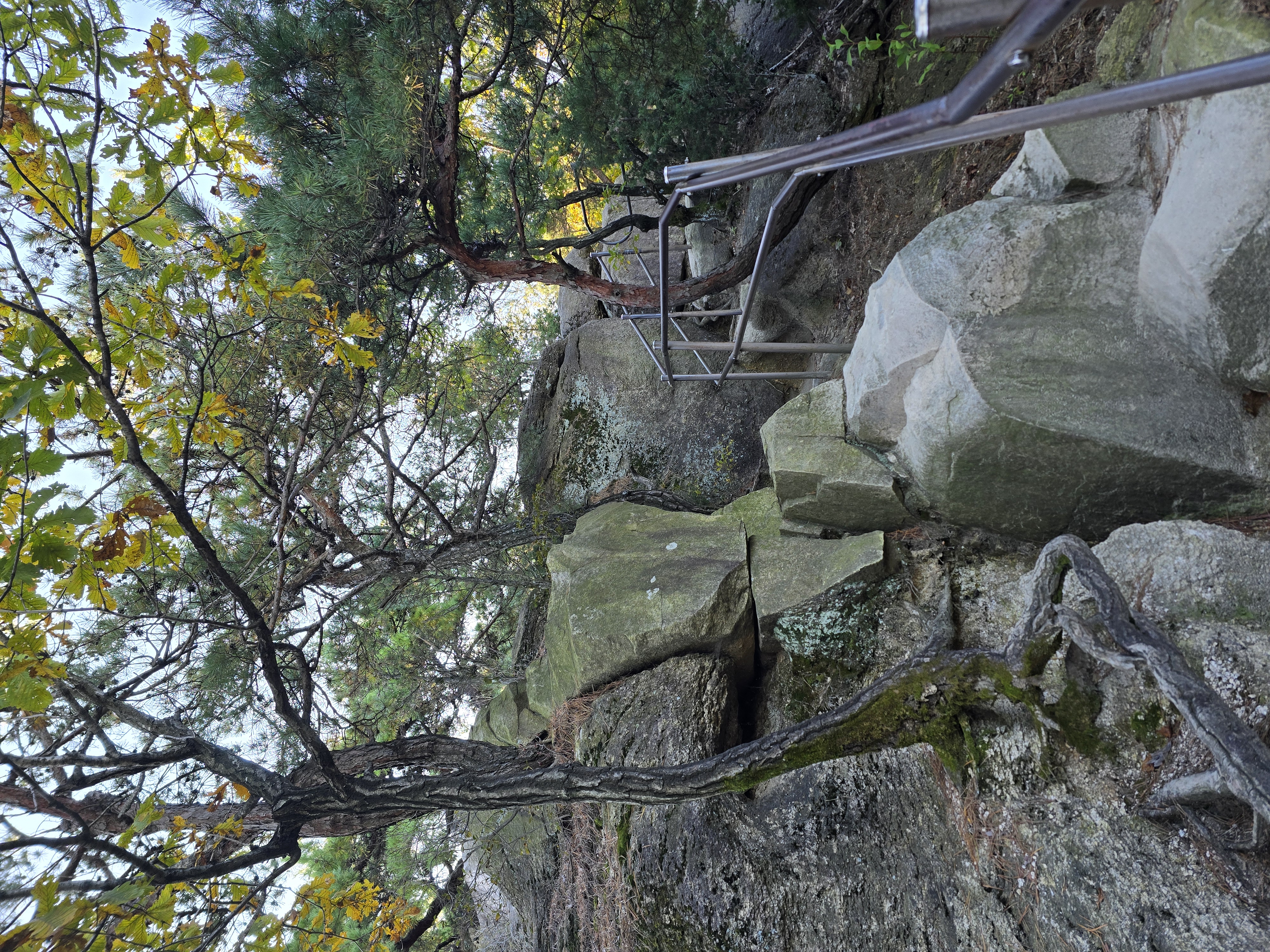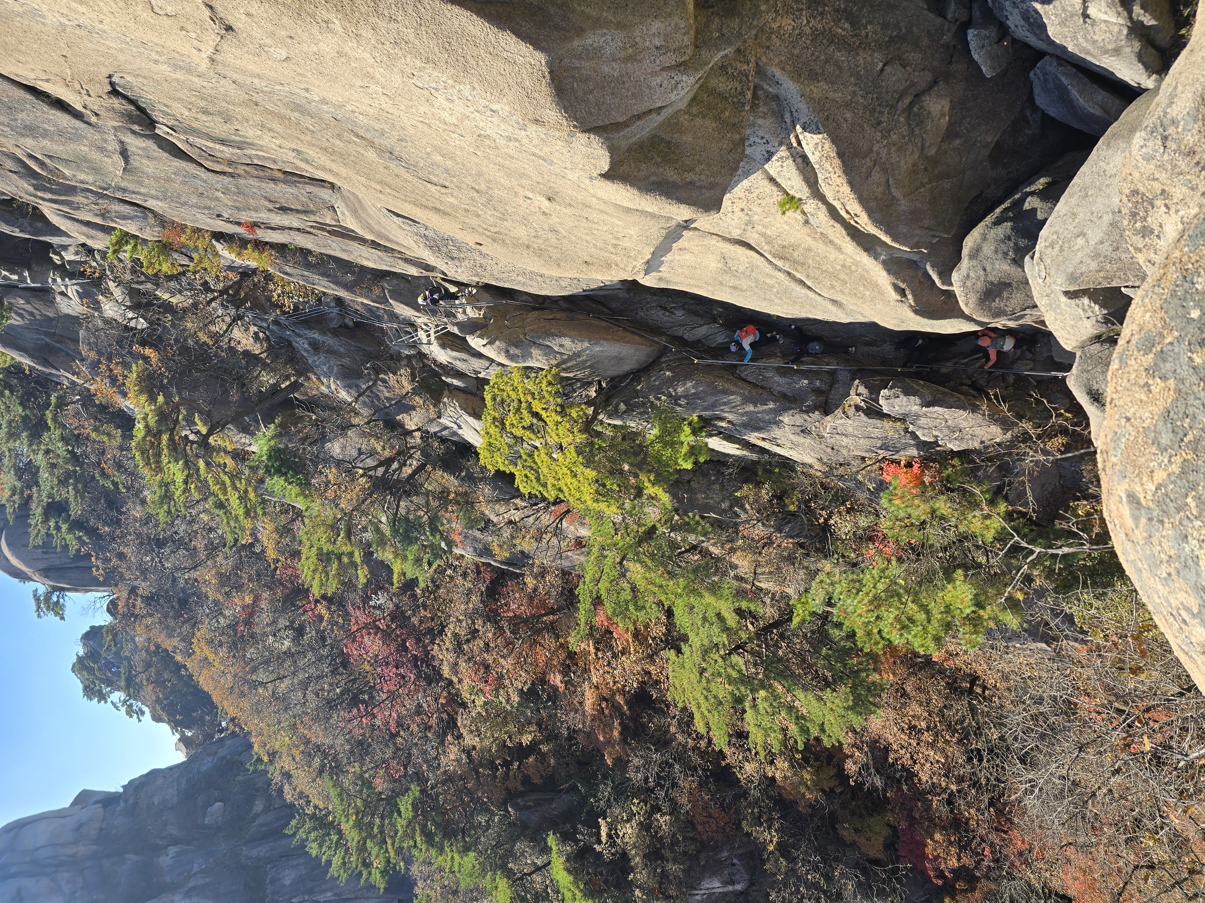 앞뒤로 엄청난 위용을 자랑하는 바위군들을 감상하며, 그 틈새로 계속해서 단풍을 찾기 위해 여기저기 살펴본다. 멀리 내려다보면 그래도 울긋불긋 색상이 나름 만족을 안겨준다. 원도봉 표지목이 있는 쉼터를 지나 Y계곡 앞에 선다. 올 때마다 아찔함이 느껴진다. 그래도 그 스릴은 중독성이 있기에 빼먹을 수 없다. 천천히 조심하며 Y계곡을 내려선다. 내려설 때보다 올라가는 구간이 오히려 더 짜릿하다. Y계곡 배경으로 사진을 한 장 담고 싶으나 혼산이다 보니 찍어줄 사람이 없다. 아쉬움을 만회하기 위해 여기저기 멋진 조망을 눈 속에 담아 본다.