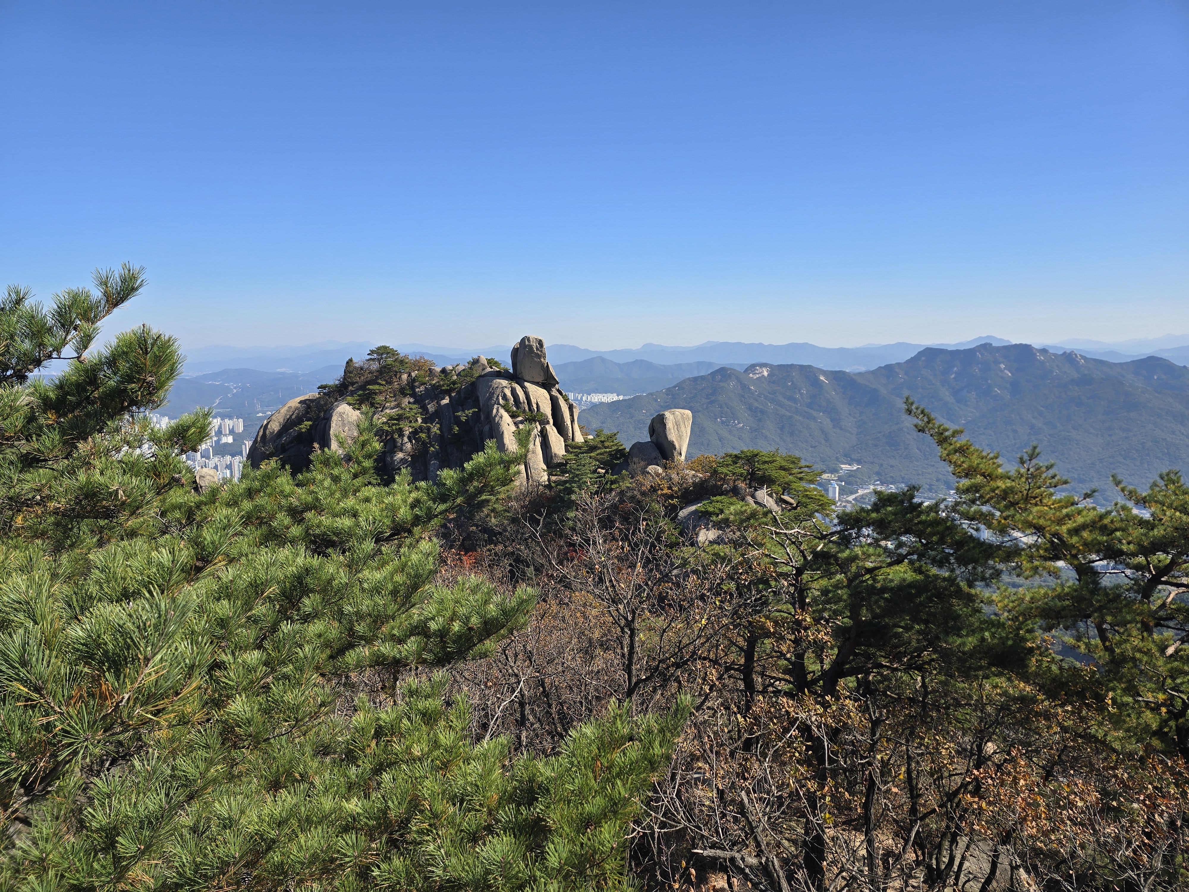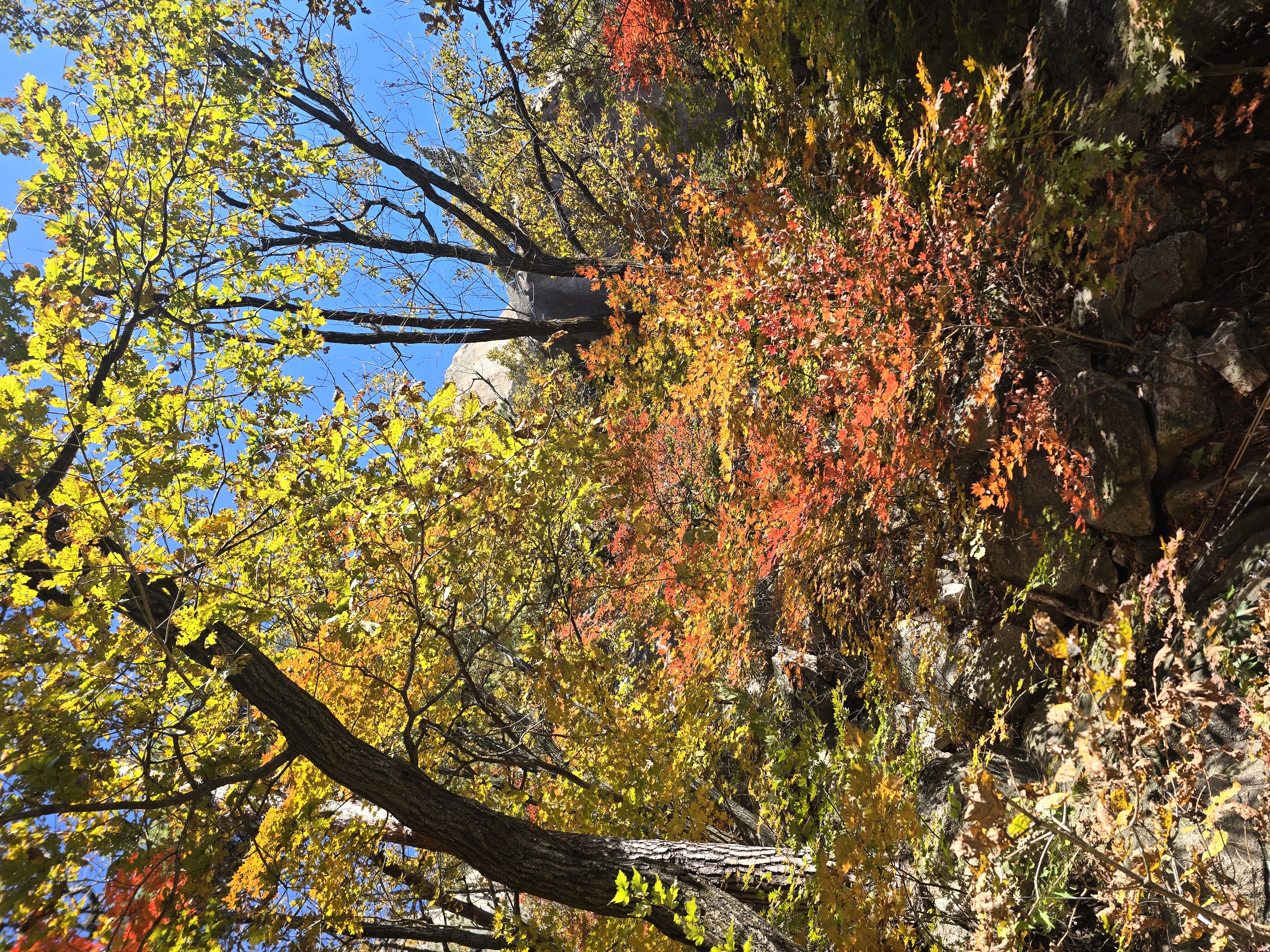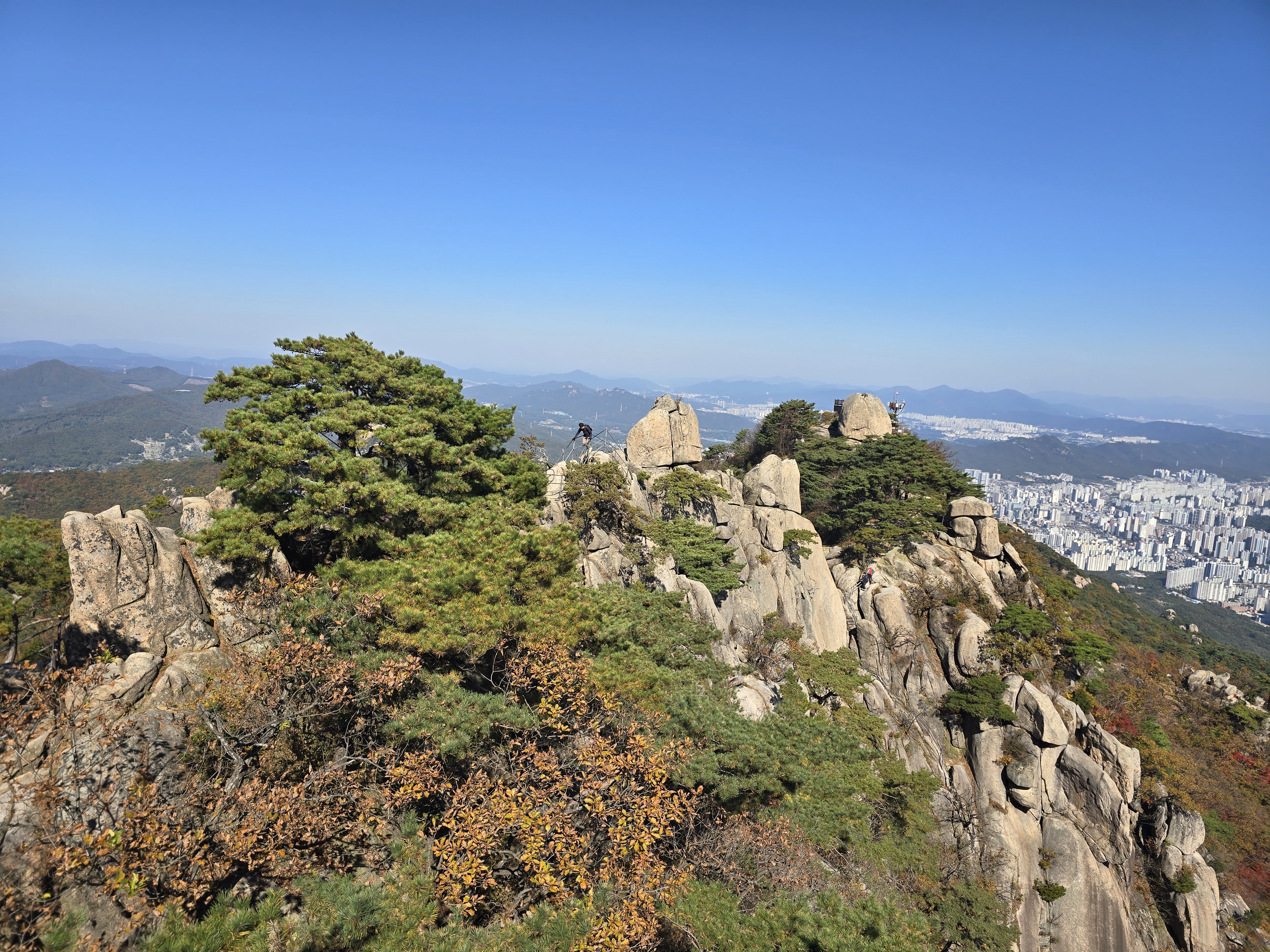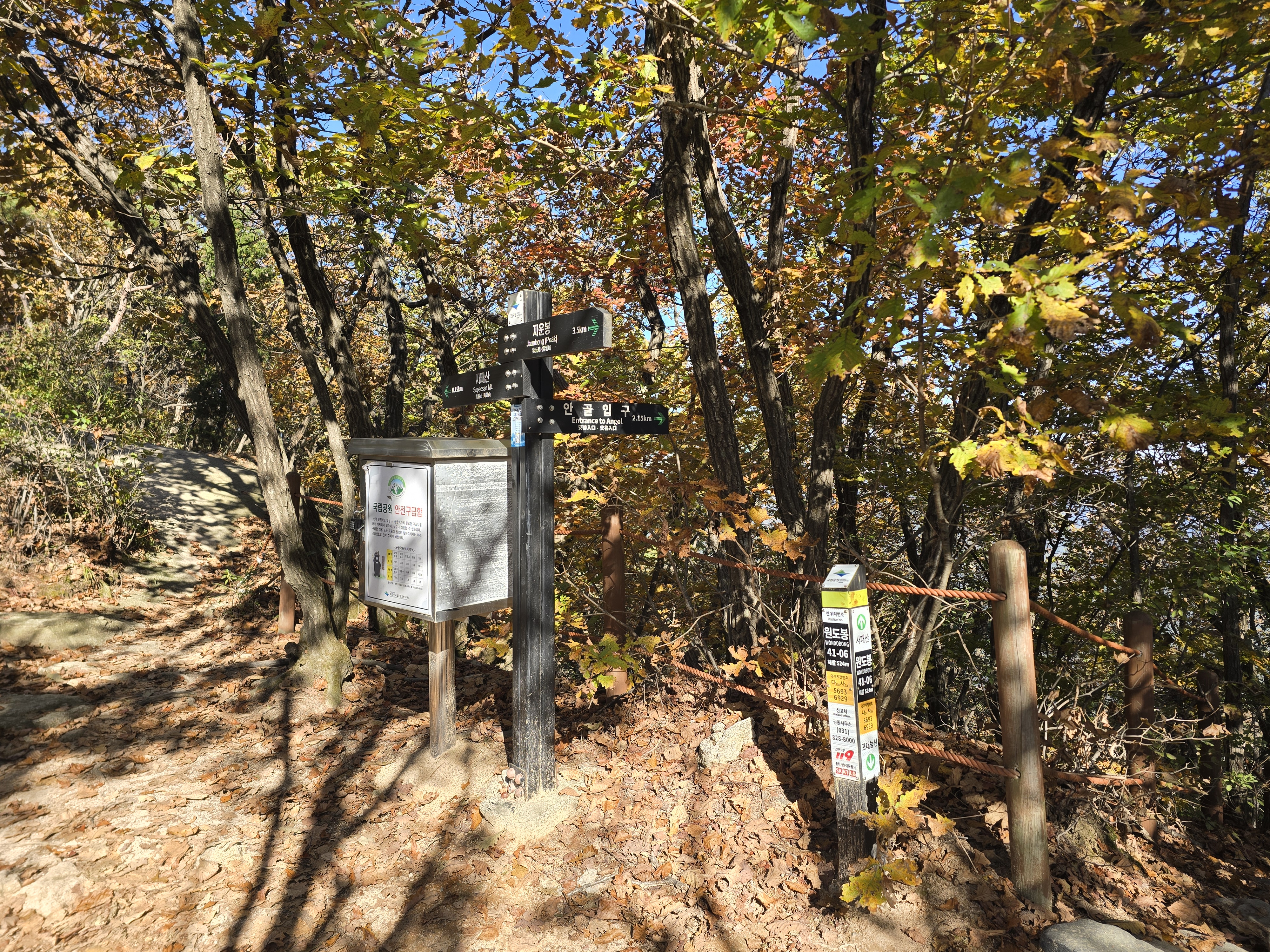 앞뒤로 엄청난 위용을 자랑하는 바위군들을 감상하며, 그 틈새로 계속해서 단풍을 찾기 위해 여기저기 살펴본다. 멀리 내려다보면 그래도 울긋불긋 색상이 나름 만족을 안겨준다. 원도봉 표지목이 있는 쉼터를 지나 Y계곡 앞에 선다. 올 때마다 아찔함이 느껴진다. 그래도 그 스릴은 중독성이 있기에 빼먹을 수 없다. 천천히 조심하며 Y계곡을 내려선다. 내려설 때보다 올라가는 구간이 오히려 더 짜릿하다. Y계곡 배경으로 사진을 한 장 담고 싶으나 혼산이다 보니 찍어줄 사람이 없다. 아쉬움을 만회하기 위해 여기저기 멋진 조망을 눈 속에 담아 본다.