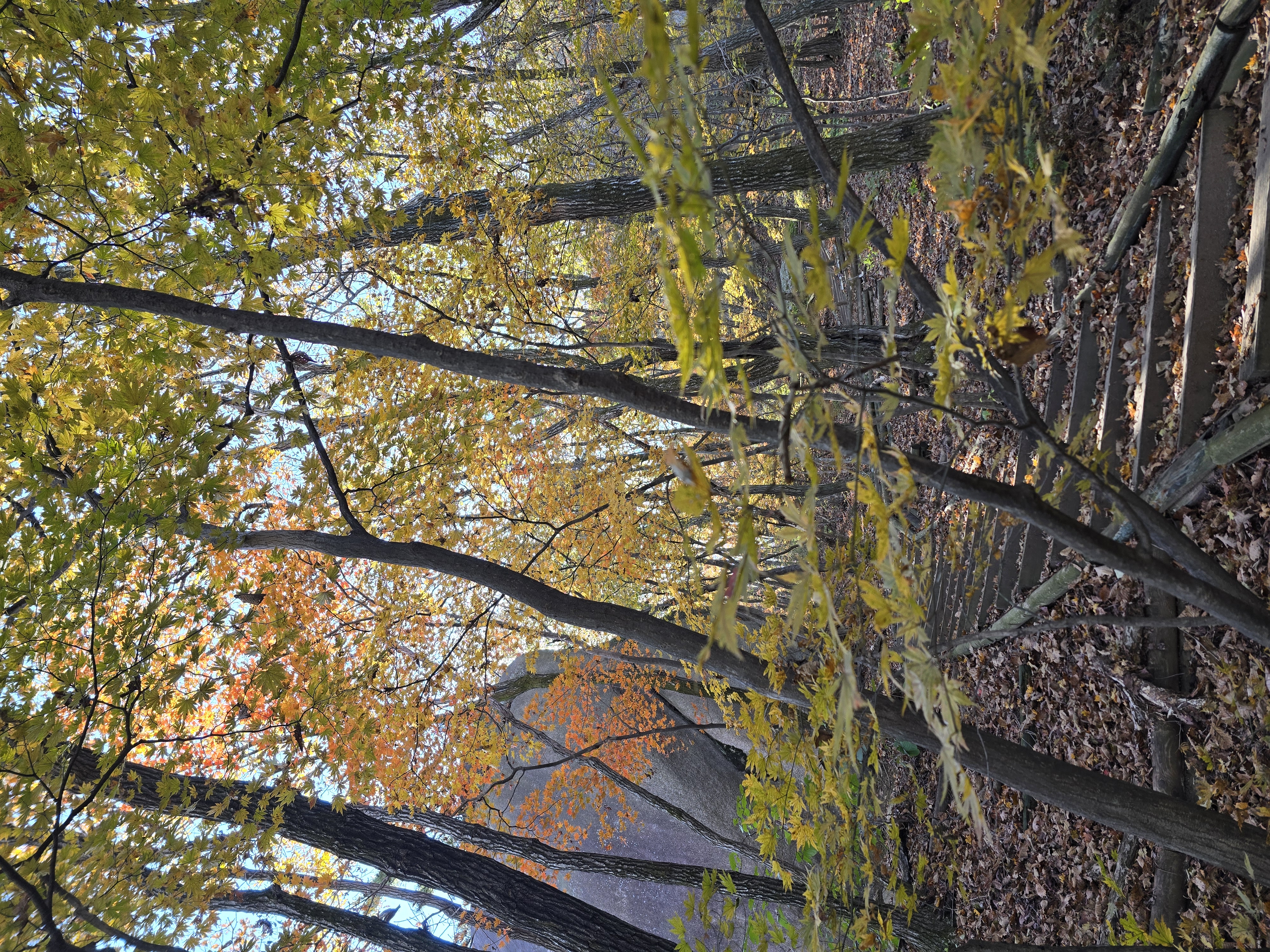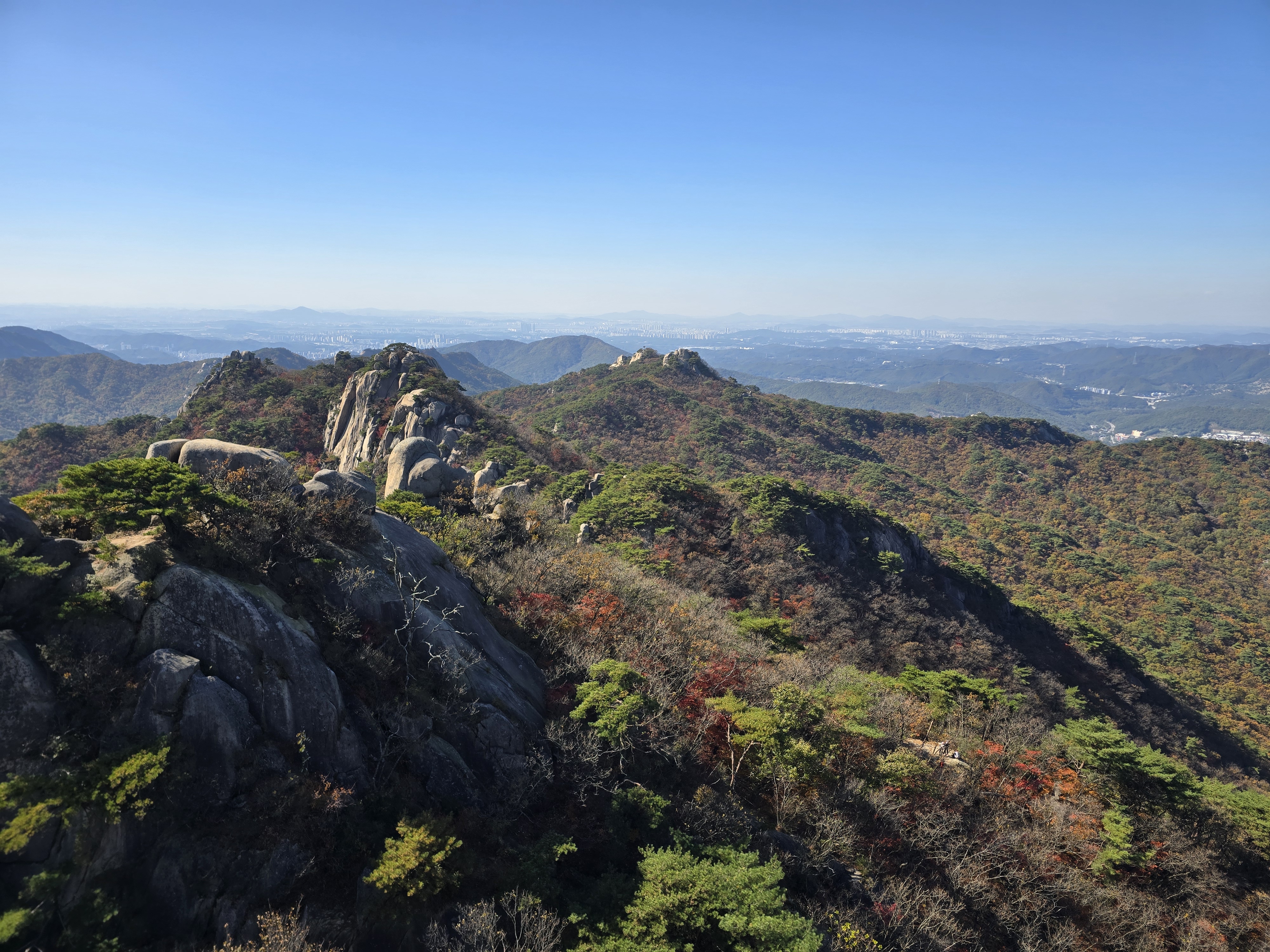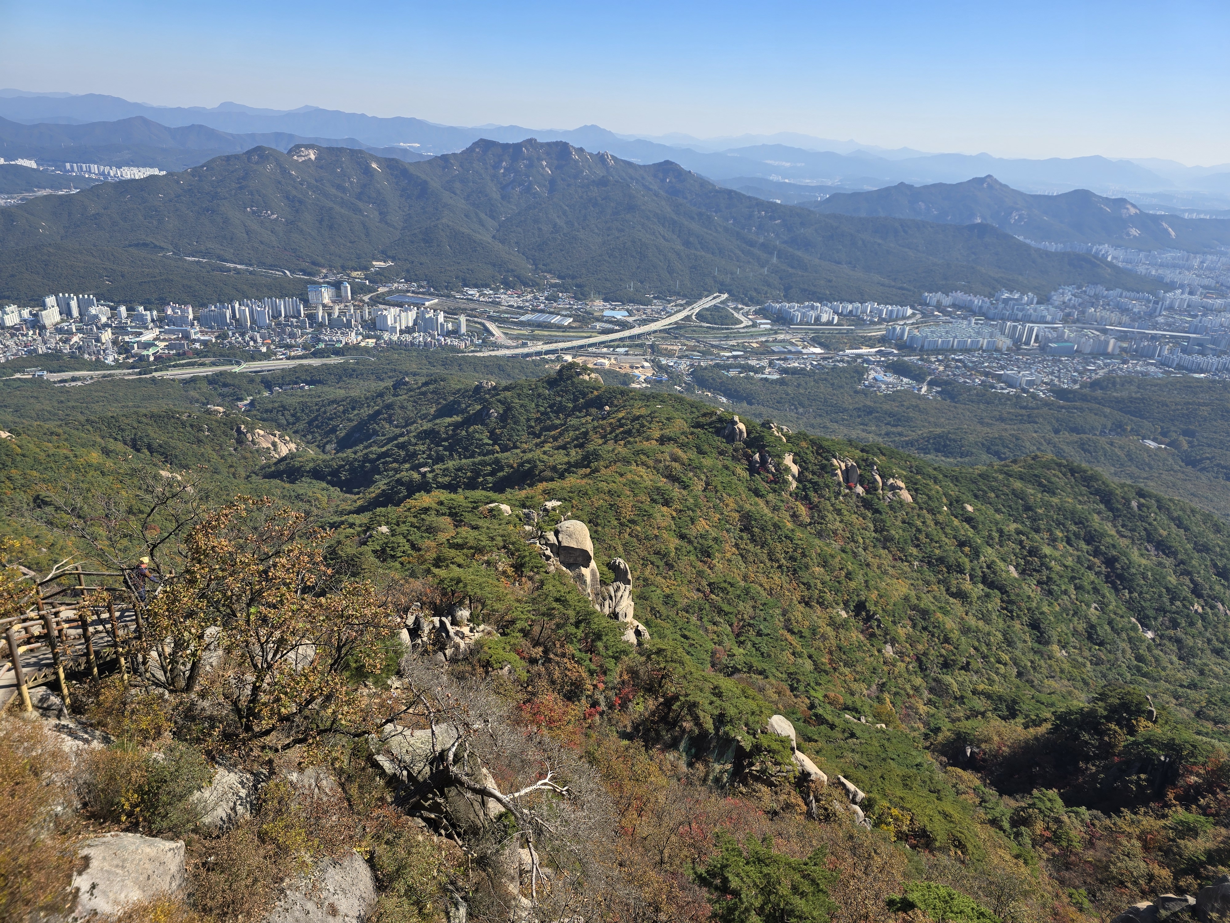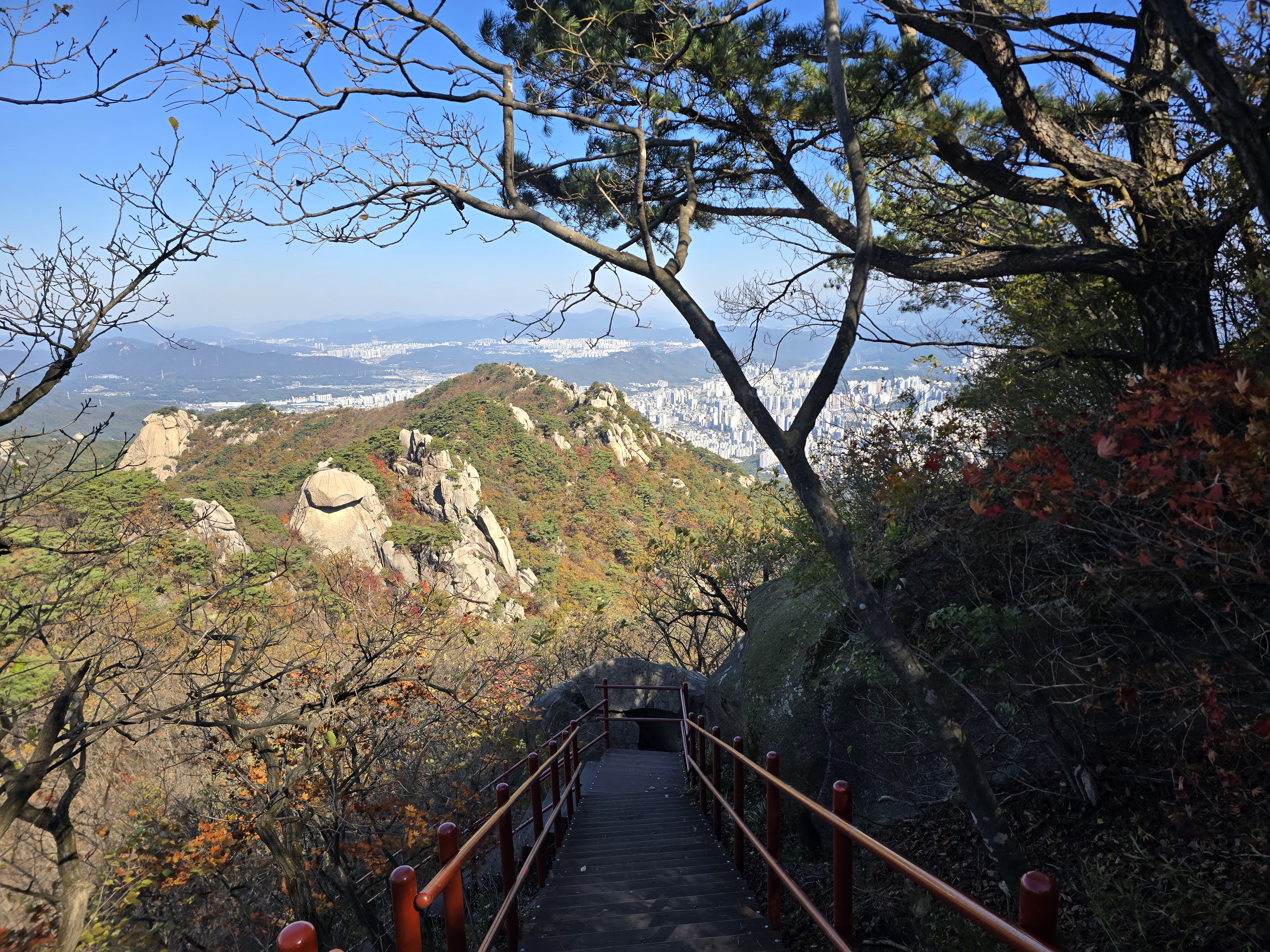 앞뒤로 엄청난 위용을 자랑하는 바위군들을 감상하며, 그 틈새로 계속해서 단풍을 찾기 위해 여기저기 살펴본다. 멀리 내려다보면 그래도 울긋불긋 색상이 나름 만족을 안겨준다. 원도봉 표지목이 있는 쉼터를 지나 Y계곡 앞에 선다. 올 때마다 아찔함이 느껴진다. 그래도 그 스릴은 중독성이 있기에 빼먹을 수 없다. 천천히 조심하며 Y계곡을 내려선다. 내려설 때보다 올라가는 구간이 오히려 더 짜릿하다. Y계곡 배경으로 사진을 한 장 담고 싶으나 혼산이다 보니 찍어줄 사람이 없다. 아쉬움을 만회하기 위해 여기저기 멋진 조망을 눈 속에 담아 본다.