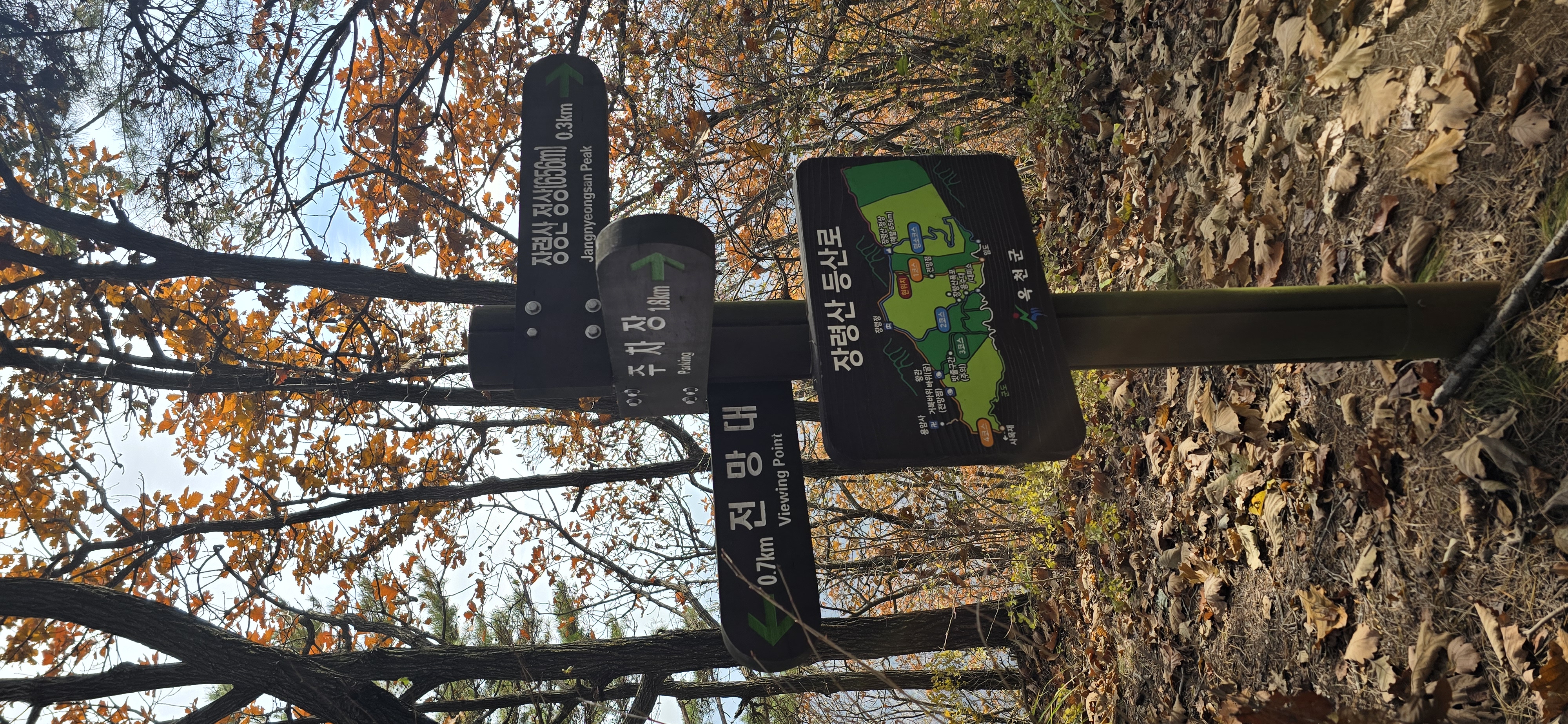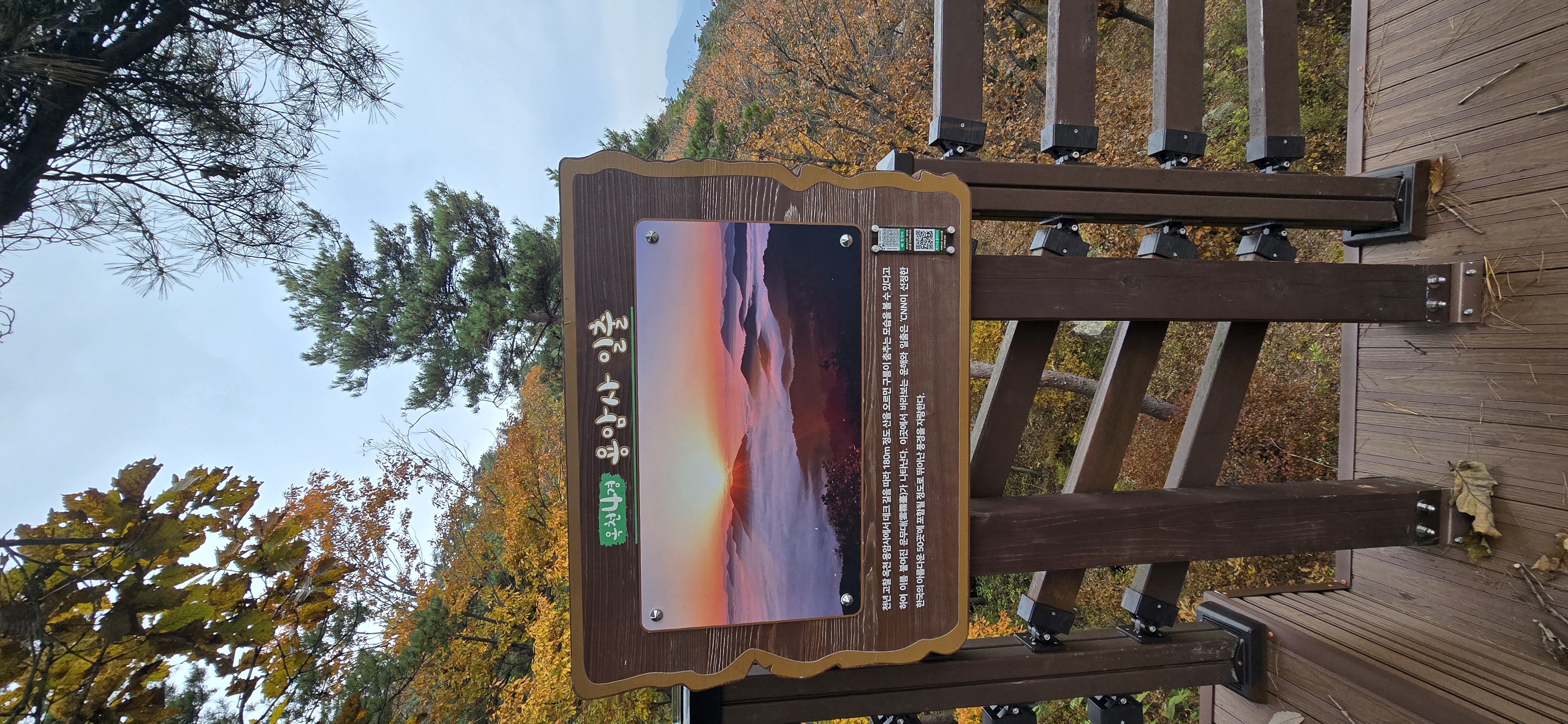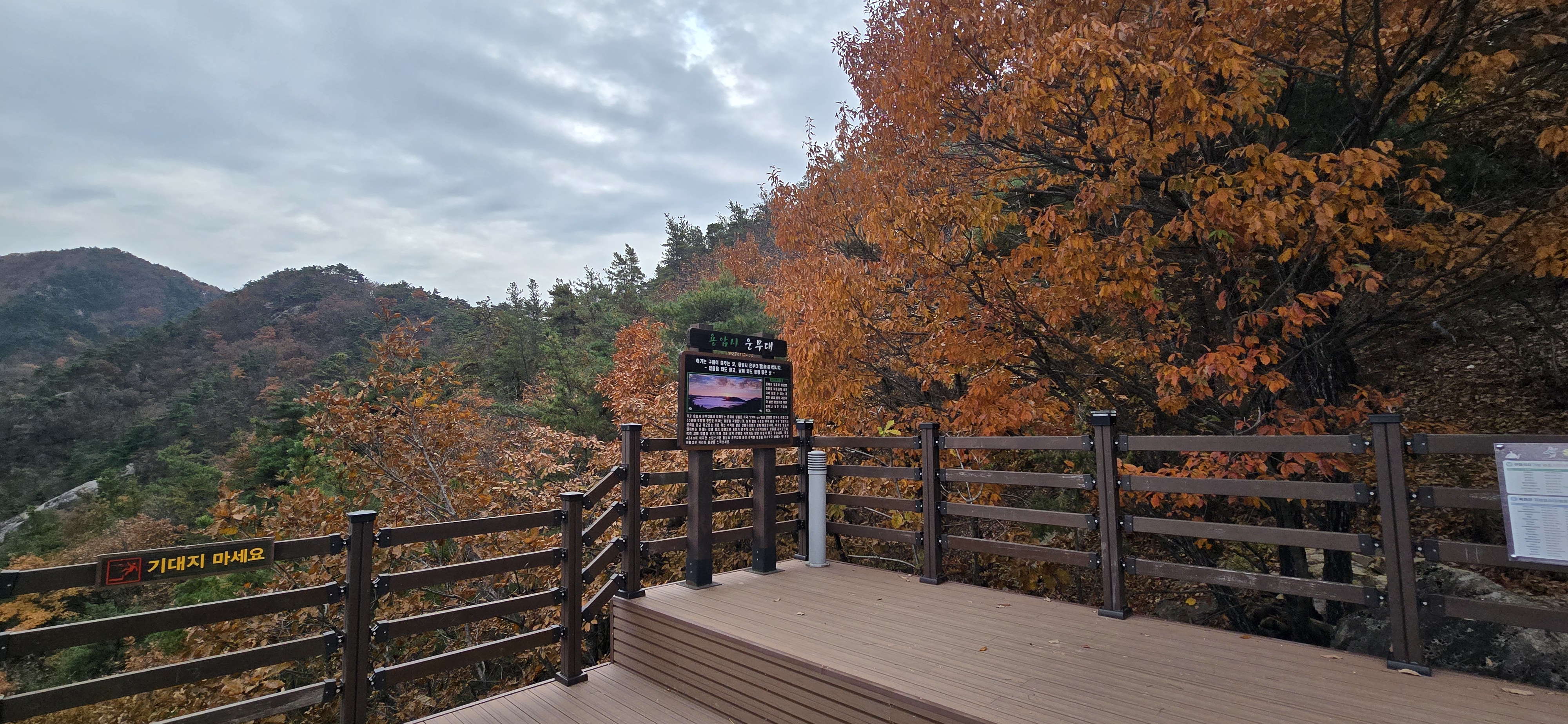 좁은 길을 따라 한참을 올라간다. 용암사 바로 아랫 편에 주차장이 잘 조성돼 있다. 주차 후 복장을 점검 후 배낭을 둘러매고 용암사 계단을 오른다. 암벽에 새겨진 불상을 감상한 후 계속해서 계단을 오른다. 어렵지 않게 제3 전망대를 만난다. 이곳이 일출의 명소라 하는 운무대로 옥천 4경에 속한다 한다. 표지판의 일출과 운해의 모습은 장관이다. 바로 윗편의 제2 전망대에서도, 제1 전망대에서도 멋진 조망을 즐길 수 있다. 흐린 날씨로 화창한 조망을 보지 못함은 아쉽지만 만추의 풍경을 느끼기엔 부족하지 않다.
