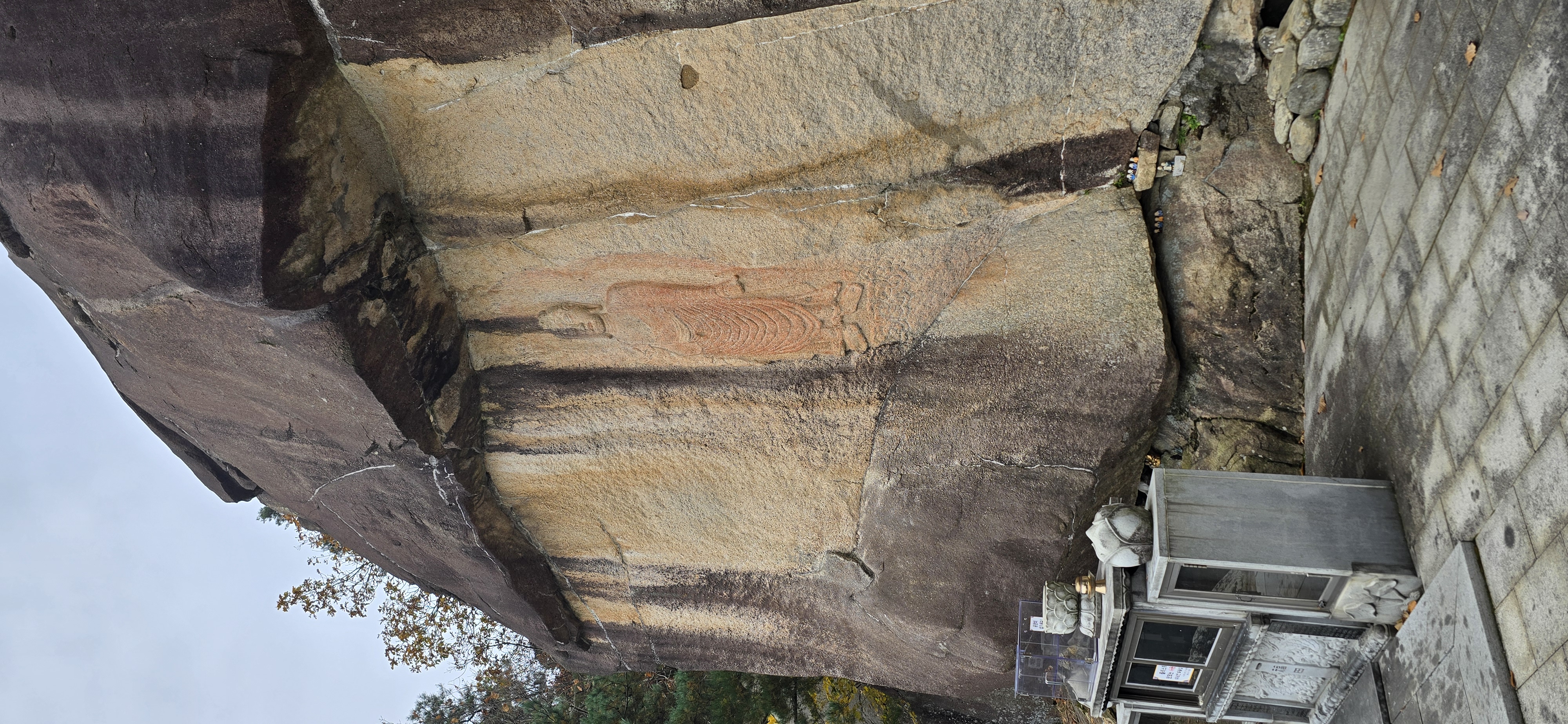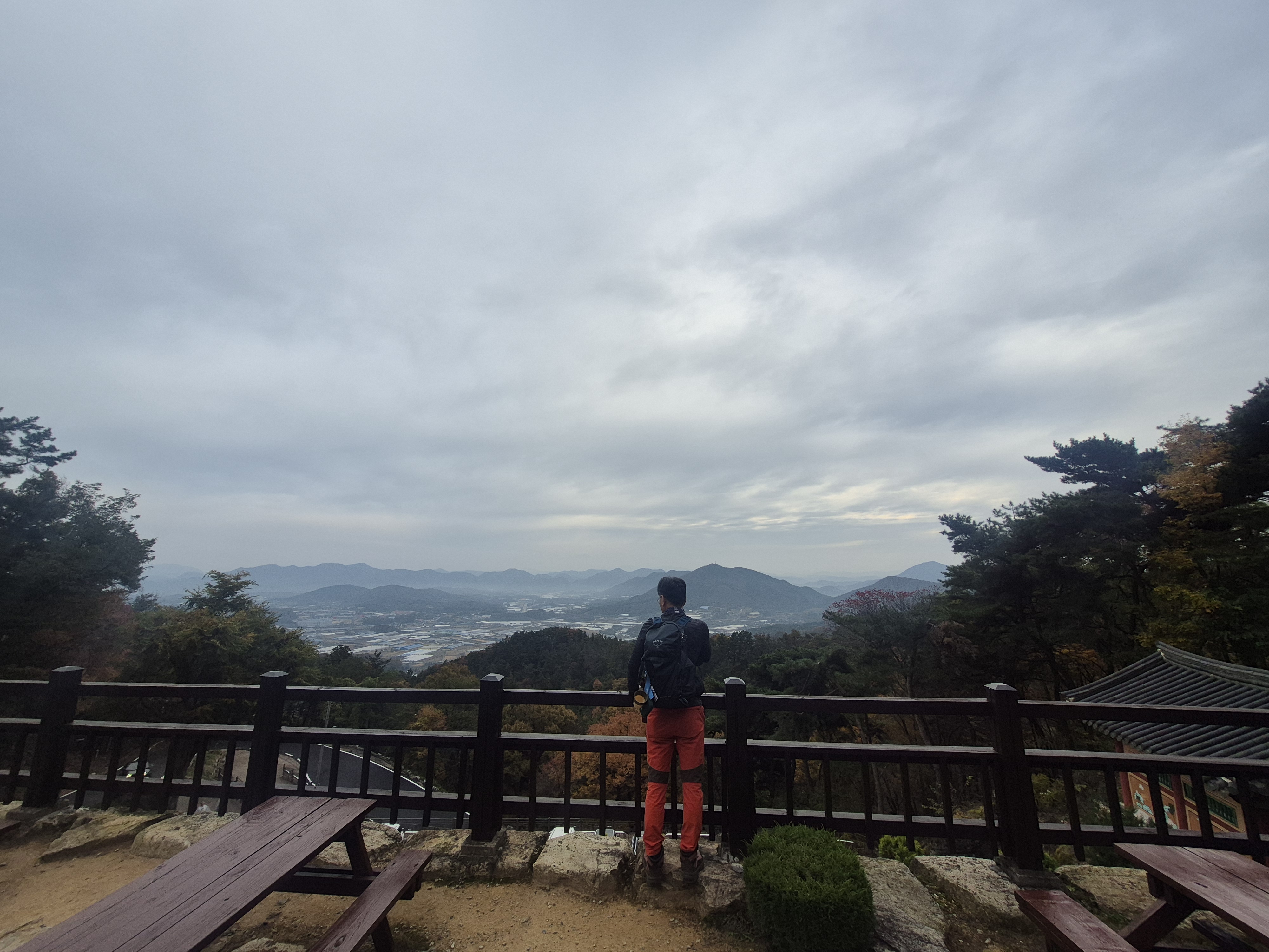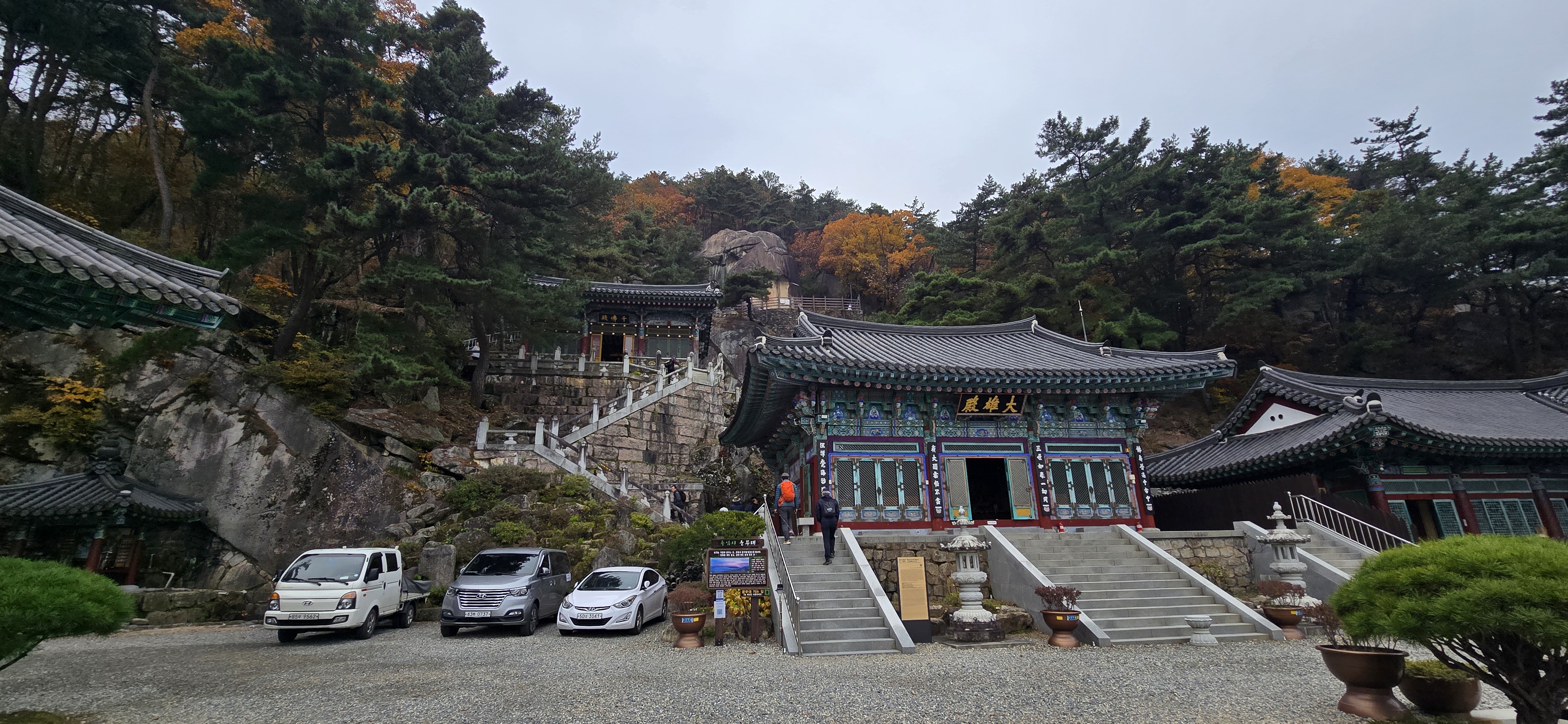 좁은 길을 따라 한참을 올라간다. 용암사 바로 아랫 편에 주차장이 잘 조성돼 있다. 주차 후 복장을 점검 후 배낭을 둘러매고 용암사 계단을 오른다. 암벽에 새겨진 불상을 감상한 후 계속해서 계단을 오른다. 어렵지 않게 제3 전망대를 만난다. 이곳이 일출의 명소라 하는 운무대로 옥천 4경에 속한다 한다. 표지판의 일출과 운해의 모습은 장관이다. 바로 윗편의 제2 전망대에서도, 제1 전망대에서도 멋진 조망을 즐길 수 있다. 흐린 날씨로 화창한 조망을 보지 못함은 아쉽지만 만추의 풍경을 느끼기엔 부족하지 않다.