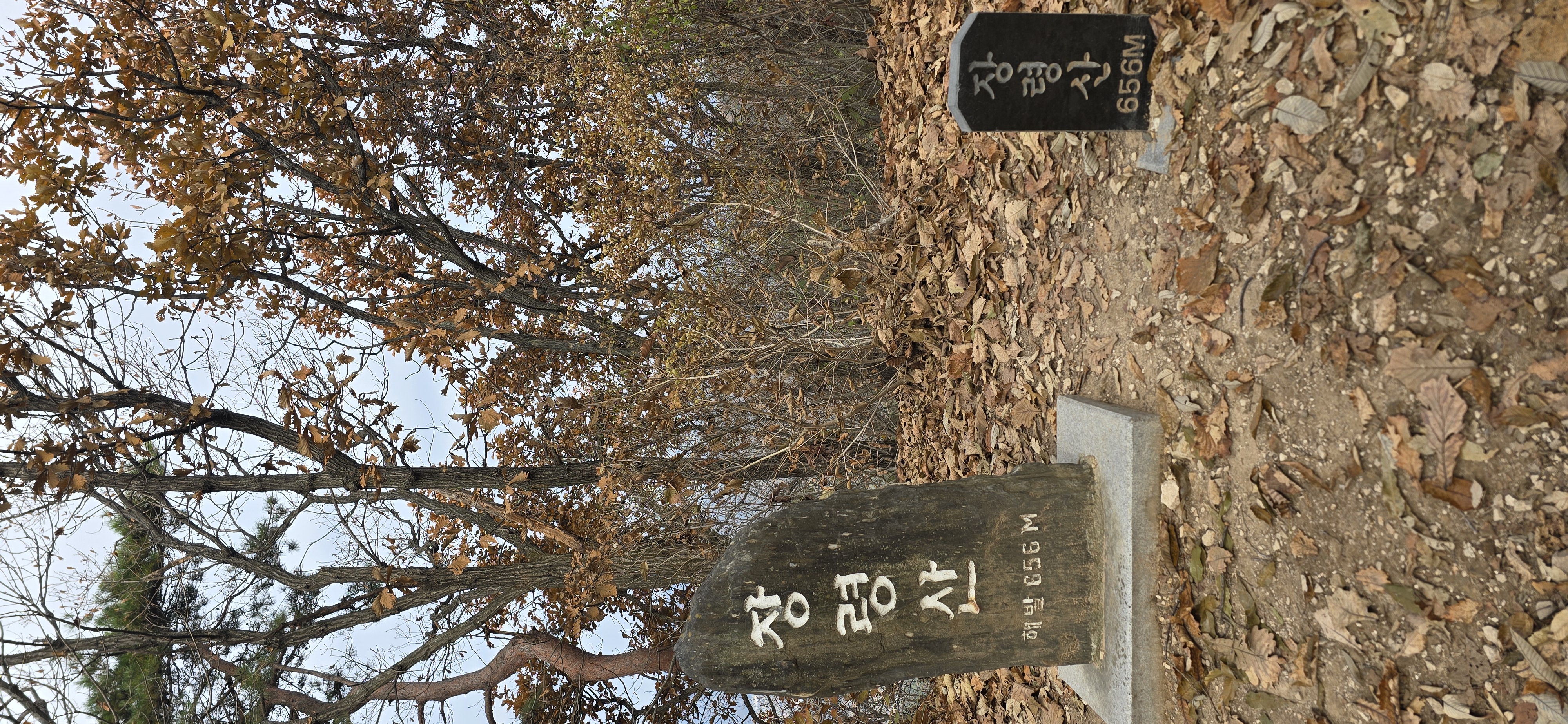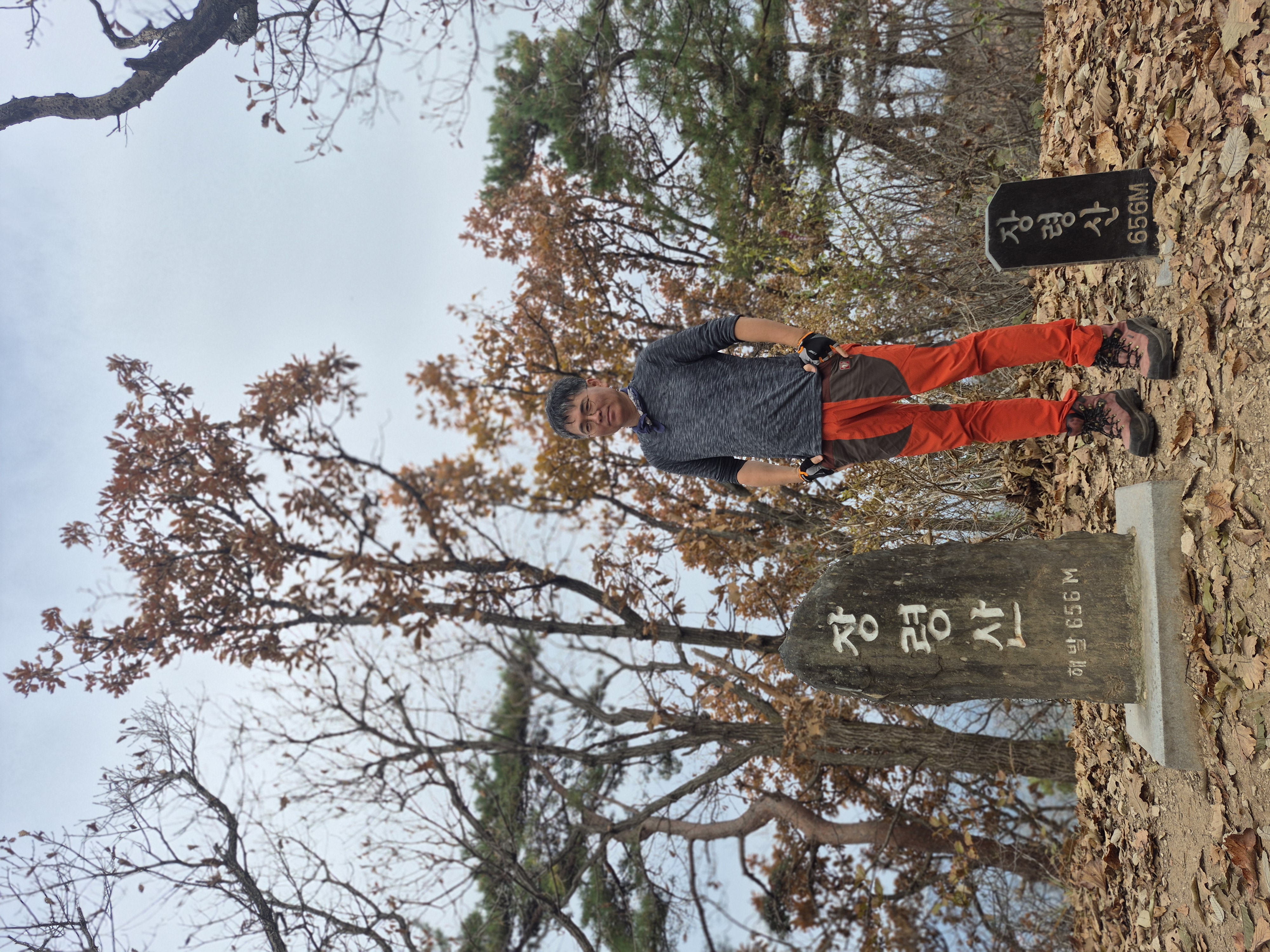 장령정에서 짧은 이동 후에 좁은 분기점이 나온다. 그래도 올라가는 길이 맞는 듯하여 왼쪽 편으로 향한다. 예상 못한 이정표와 그 밑에 깔려 있는 삼길봉이라는 수기로 쓴 비석을 만난다. 비석을 들어서 포즈를 취해 보기도 한다. 다시 걸음을 옮긴다. 낙엽이 두터이 쌓인 등산로는 꽤나 미끄럽다. 바로 옆 장령산 정상까지 오르막이기에 그나마 수월하게 올라간다. 하산길은 더욱 조심해야 할 것 같다. 장령산 정상에는 두 개의 정상석이 있다. 듬직한 크기의 멋진 정상석과 그 옆으로 작은 규모의 정상석이 있다. 그 가운데 들어가서 포즈를 취한다. 오랜만의 블랙야크 100 플러스 인증이다.