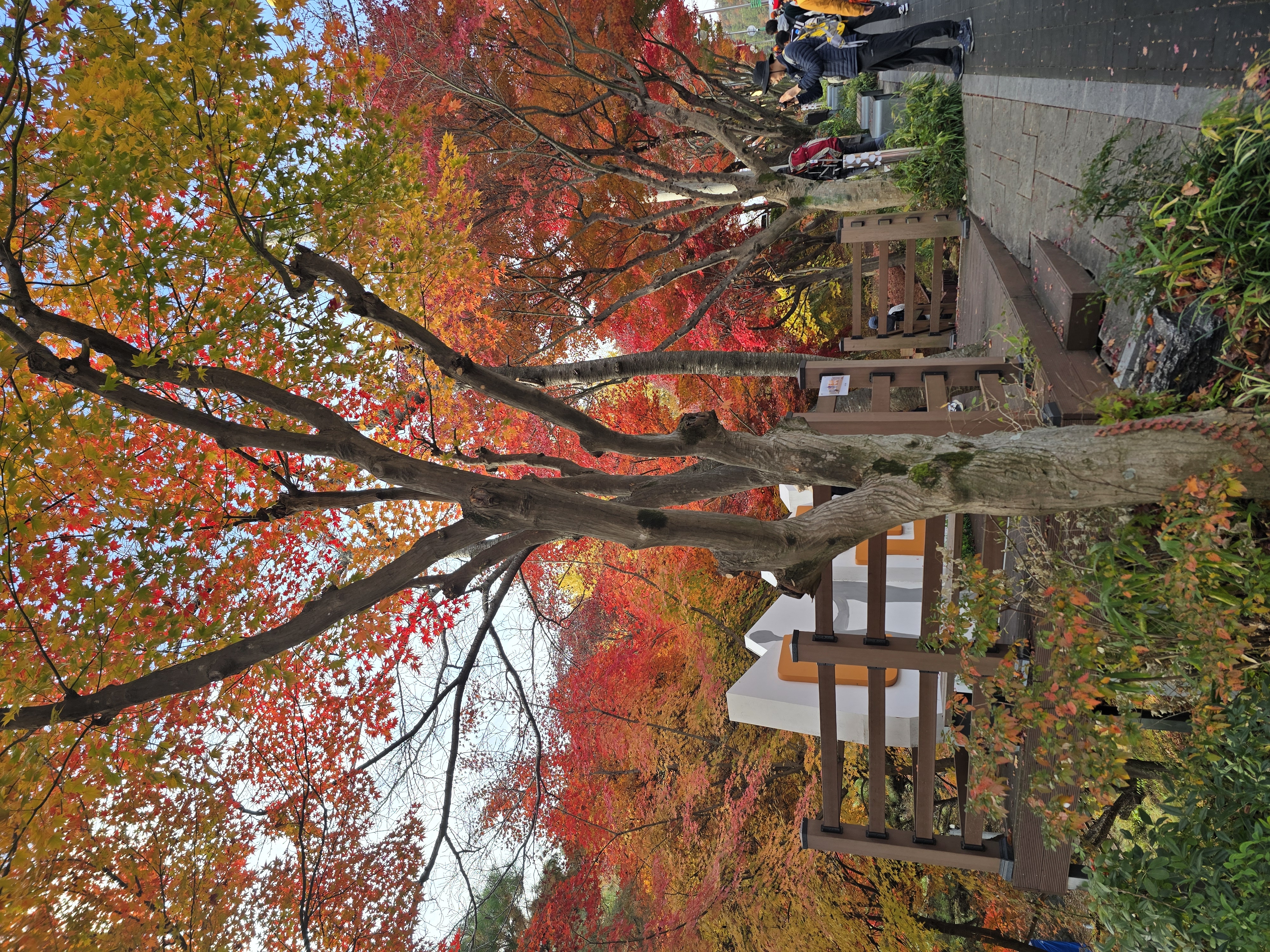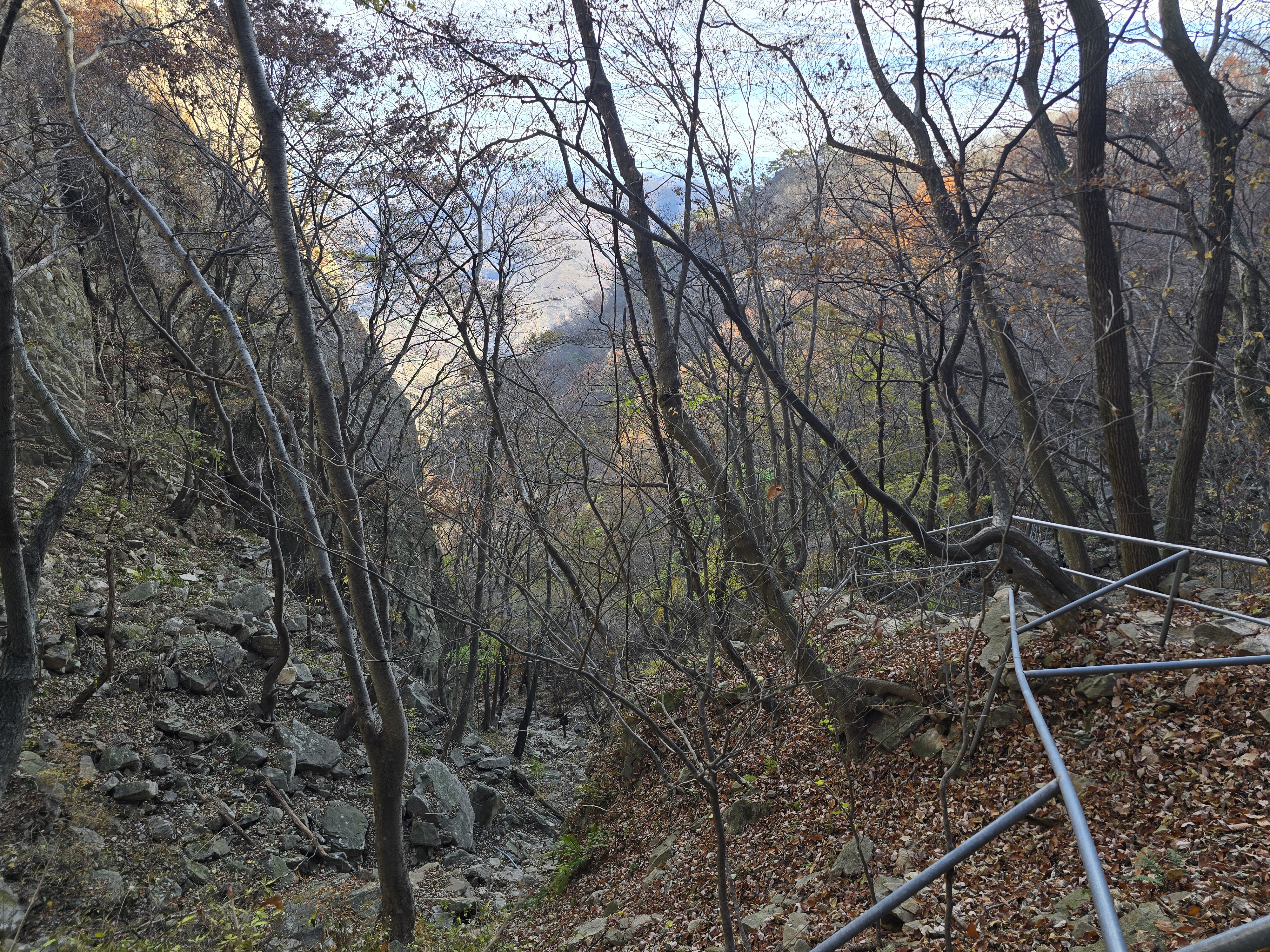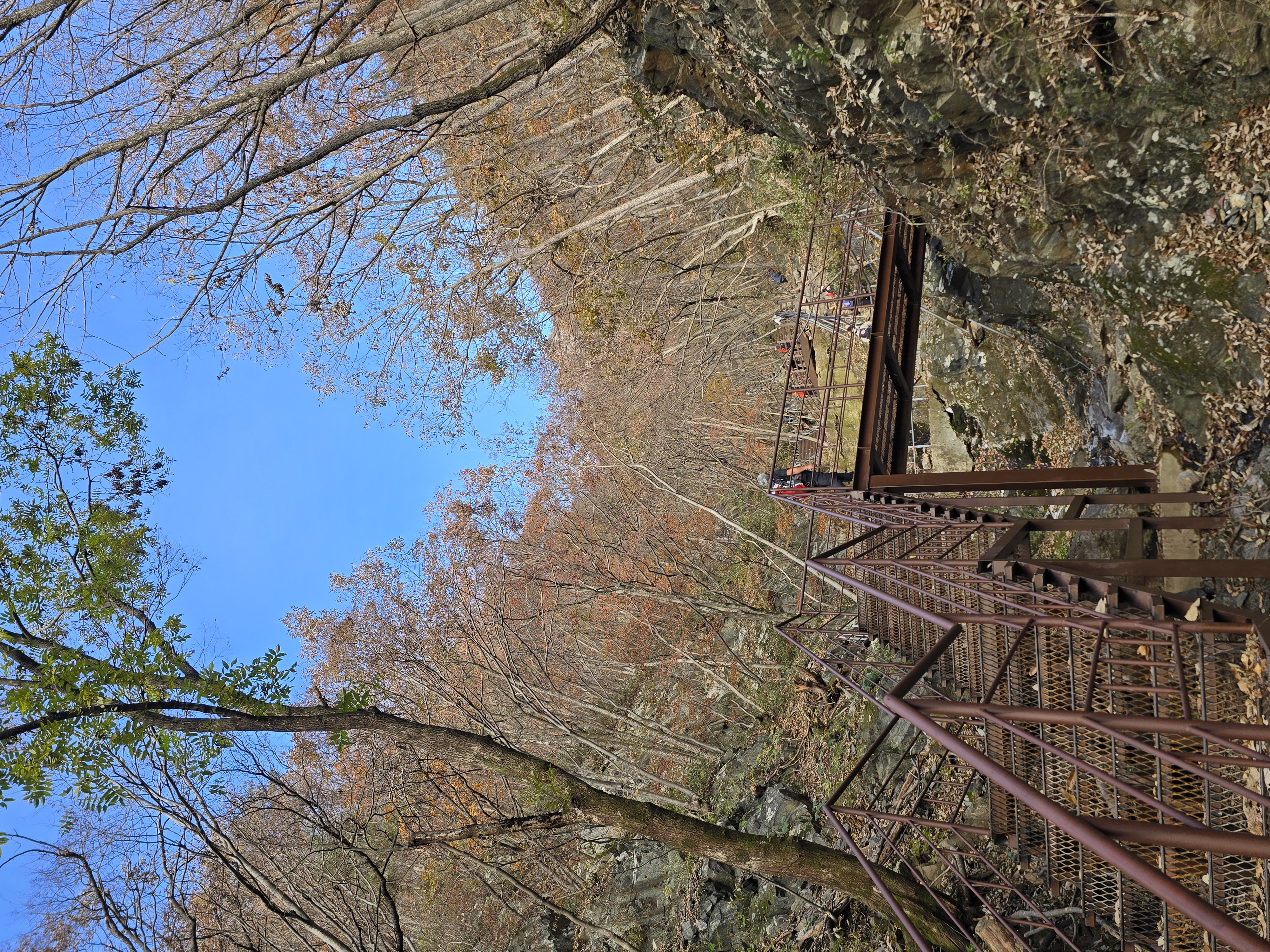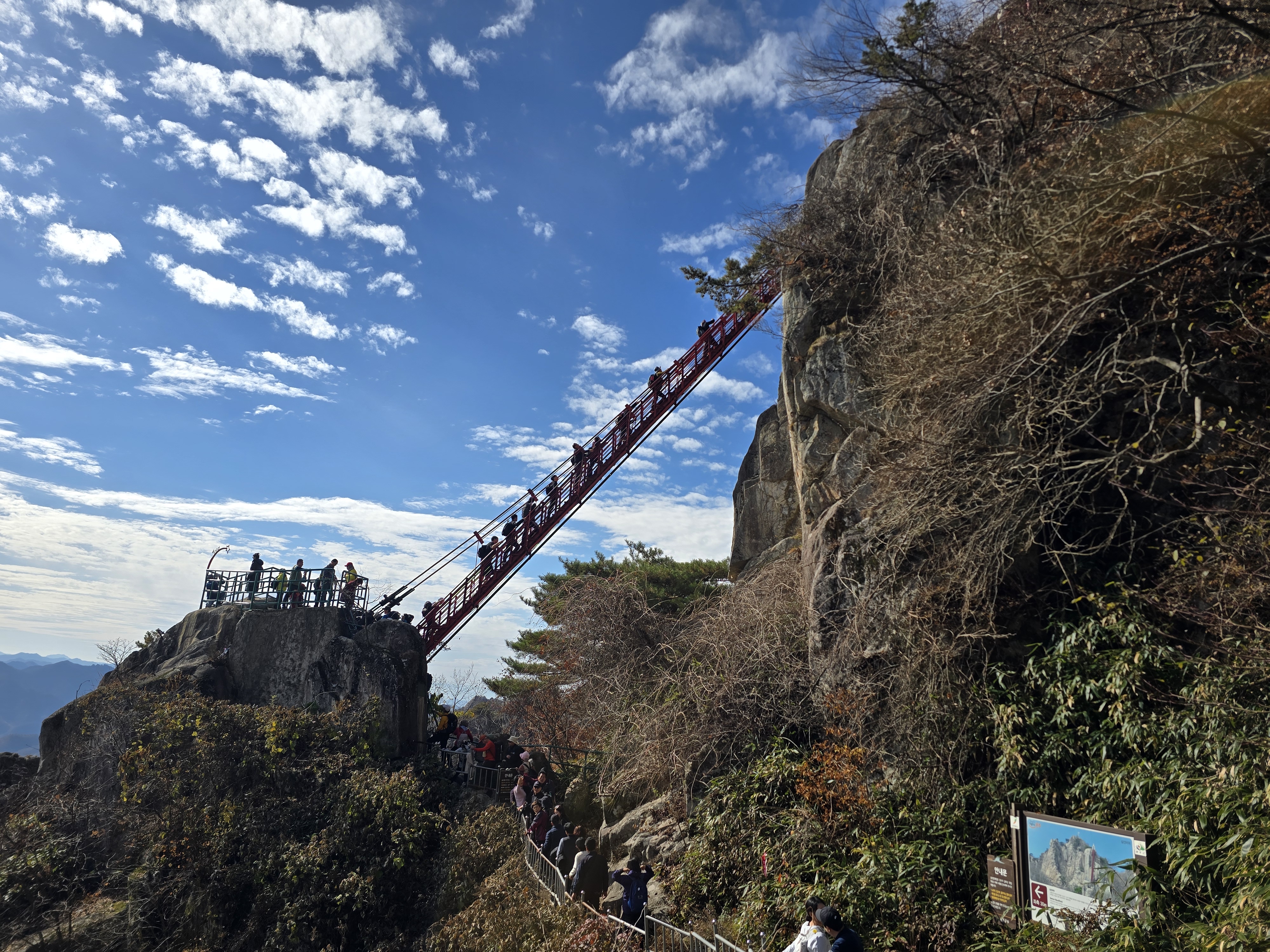주차장 입구에서부터 양 옆으로 단풍이 절정이다. 화려한 빨간색의 단풍잎이 피로를 잊게 한다. 이미 단풍이 지나갔을 것으로 생각해 기대를 안 했는데 예상 밖 소확행의 시간을 준다. 천천히 케이블카 승강장을 지나, 오르막 계곡길에 들어선다. 길지는 않지만, 가파른 오르막이라 지난 여름엔 땀꽤나 흘리며 고생했었던 기억이 있다. 단풍의 향연은 대둔산 하단부에만 잠깐 머물러 있고, 중간부부터는 이미 낙엽으로 바뀌어 있다. 발밑의 돌길을 조심하며 케이블카 상부 승강장에 도착한다. 잠시 숨을 돌리며 삼선계단 쪽을 올려다본다. 많은 관광객들이 삼선계단을 오르고 있는 모습이 보인다.