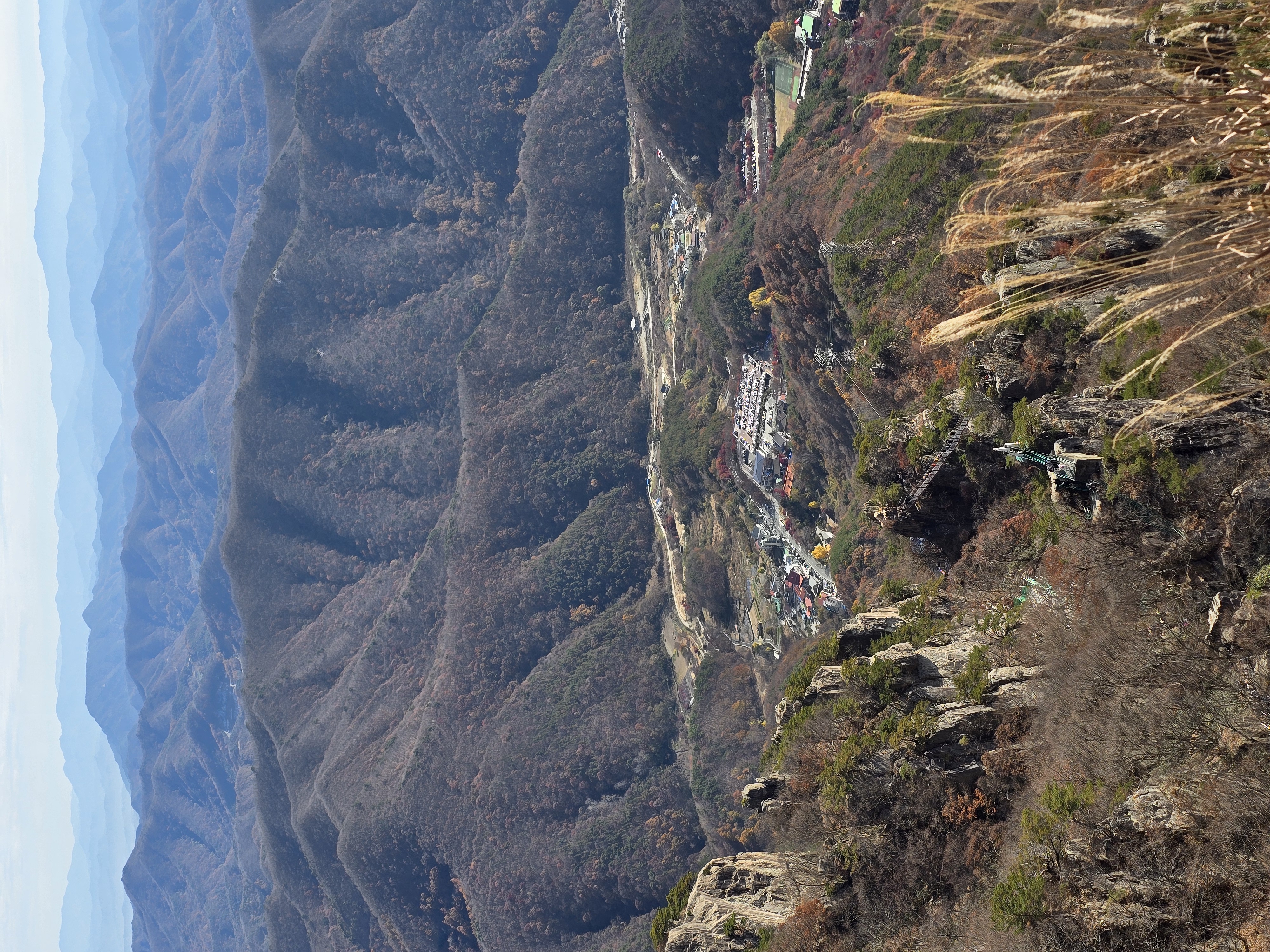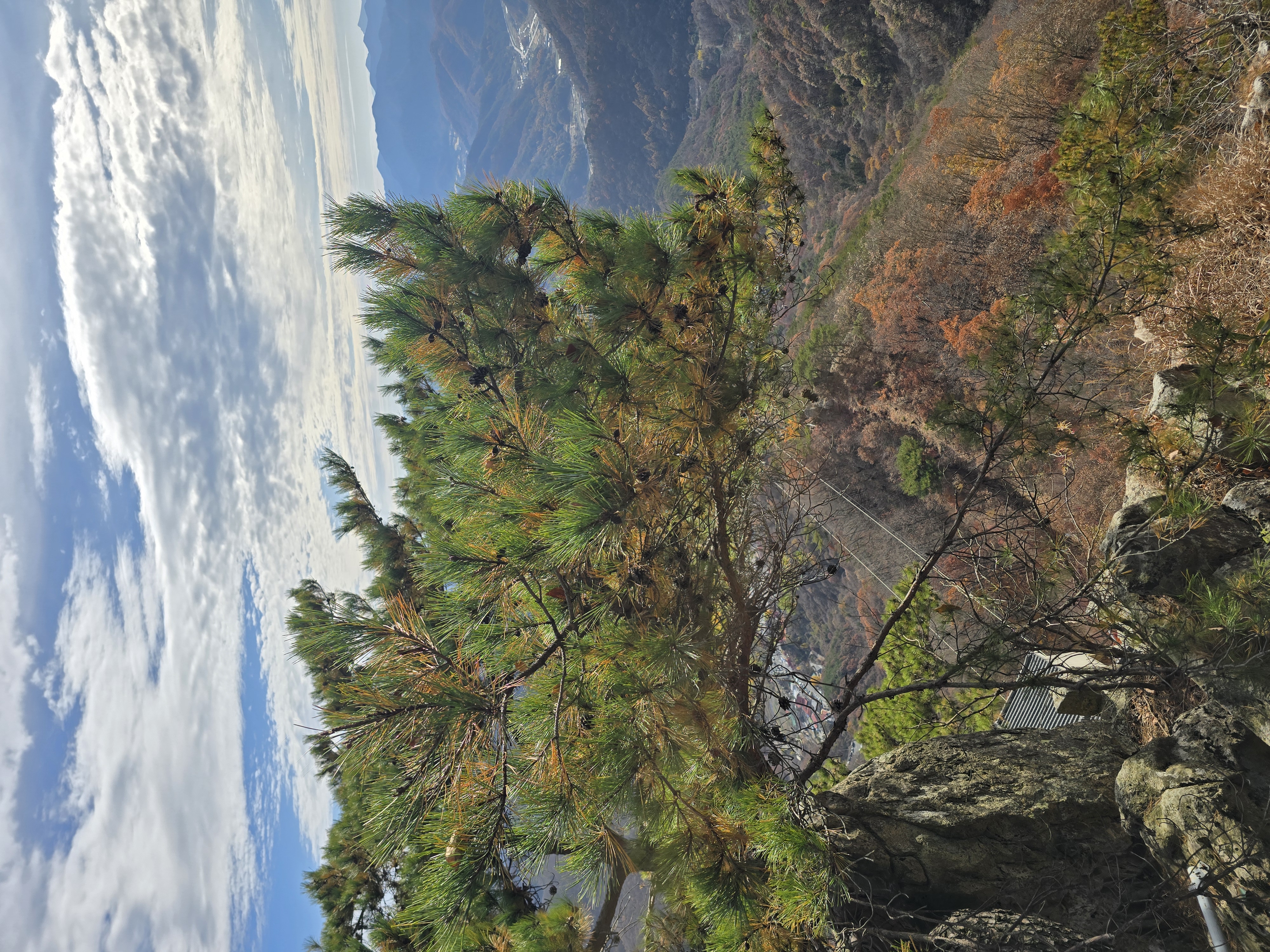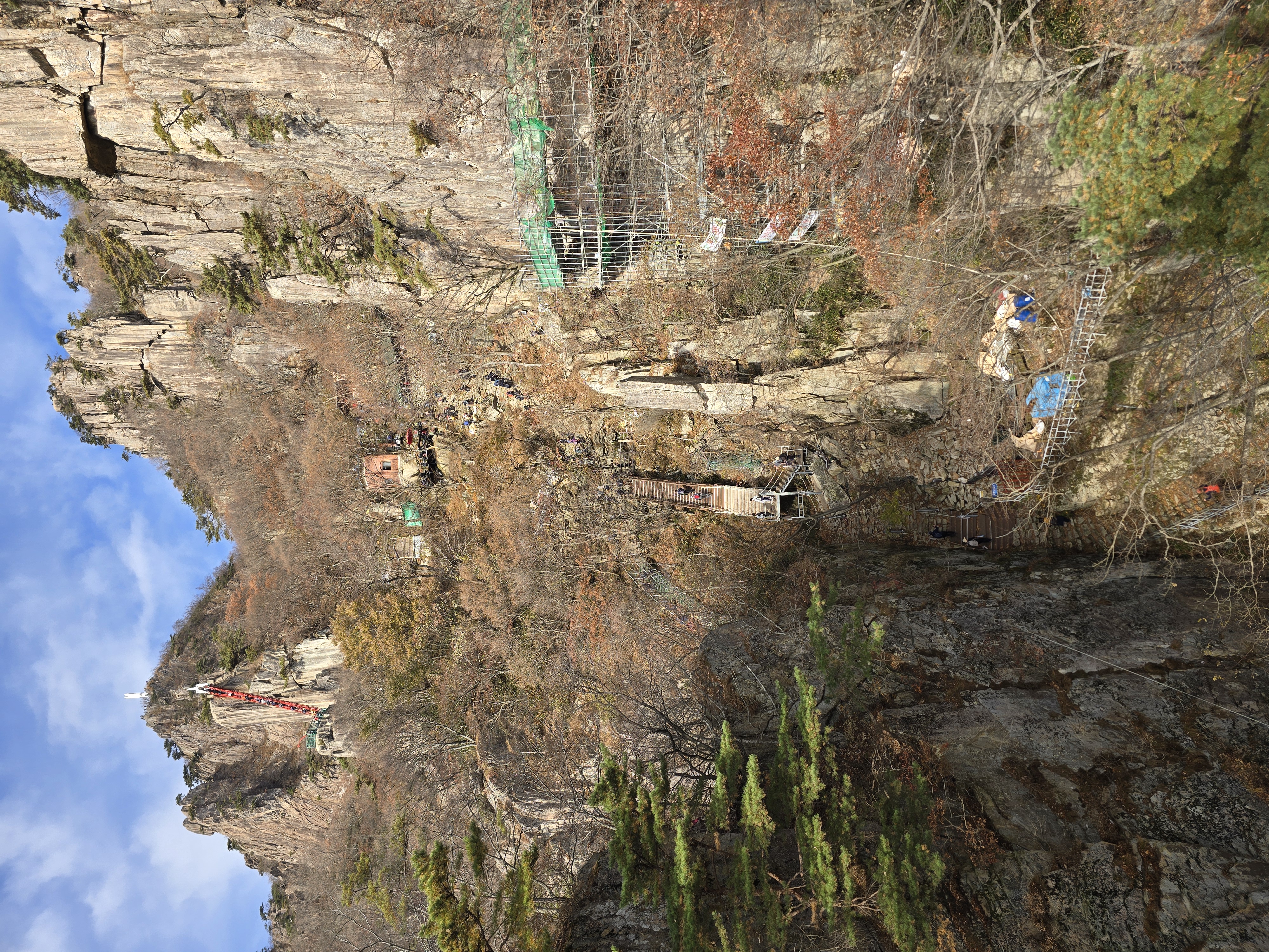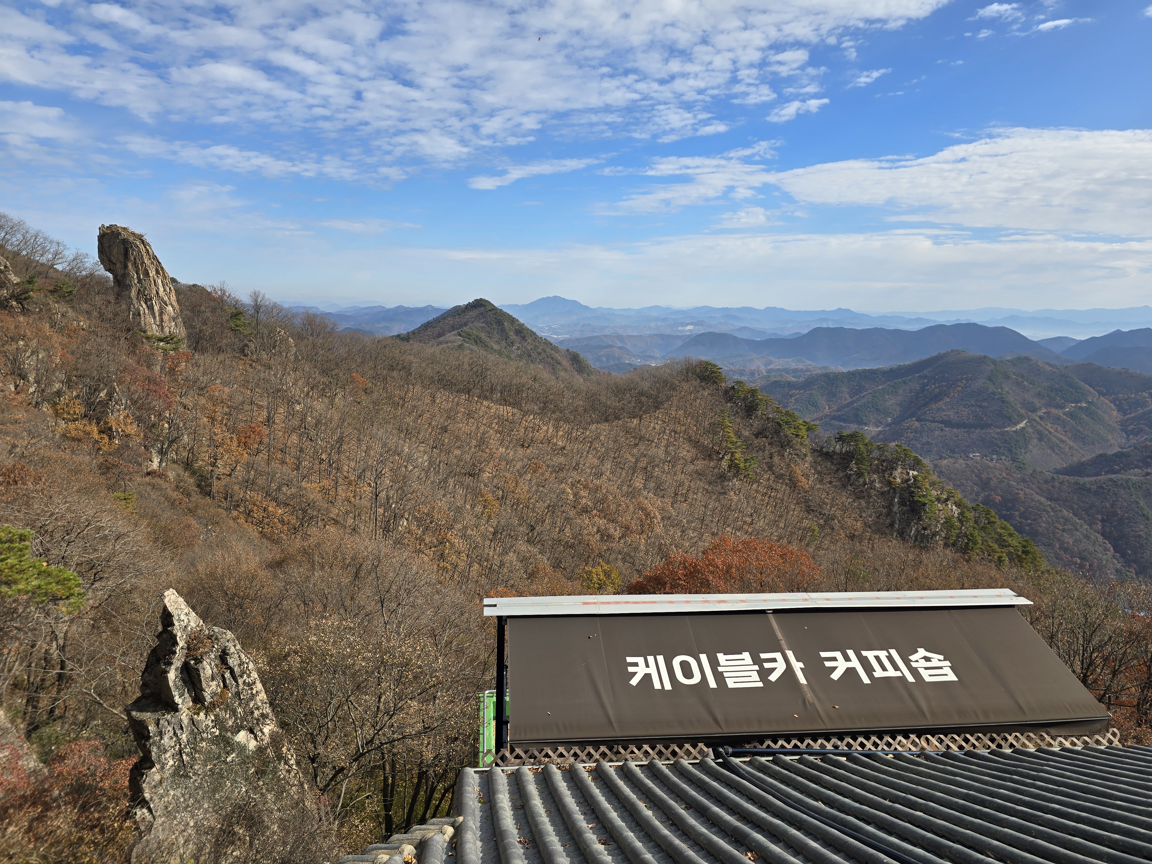 주차장 입구에서부터 양 옆으로 단풍이 절정이다. 화려한 빨간색의 단풍잎이 피로를 잊게 한다. 이미 단풍이 지나갔을 것으로 생각해 기대를 안 했는데 예상 밖 소확행의 시간을 준다. 천천히 케이블카 승강장을 지나, 오르막 계곡길에 들어선다. 길지는 않지만, 가파른 오르막이라 지난 여름엔 땀꽤나 흘리며 고생했었던 기억이 있다. 단풍의 향연은 대둔산 하단부에만 잠깐 머물러 있고, 중간부부터는 이미 낙엽으로 바뀌어 있다. 발밑의 돌길을 조심하며 케이블카 상부 승강장에 도착한다. 잠시 숨을 돌리며 삼선계단 쪽을 올려다본다. 많은 관광객들이 삼선계단을 오르고 있는 모습이 보인다.