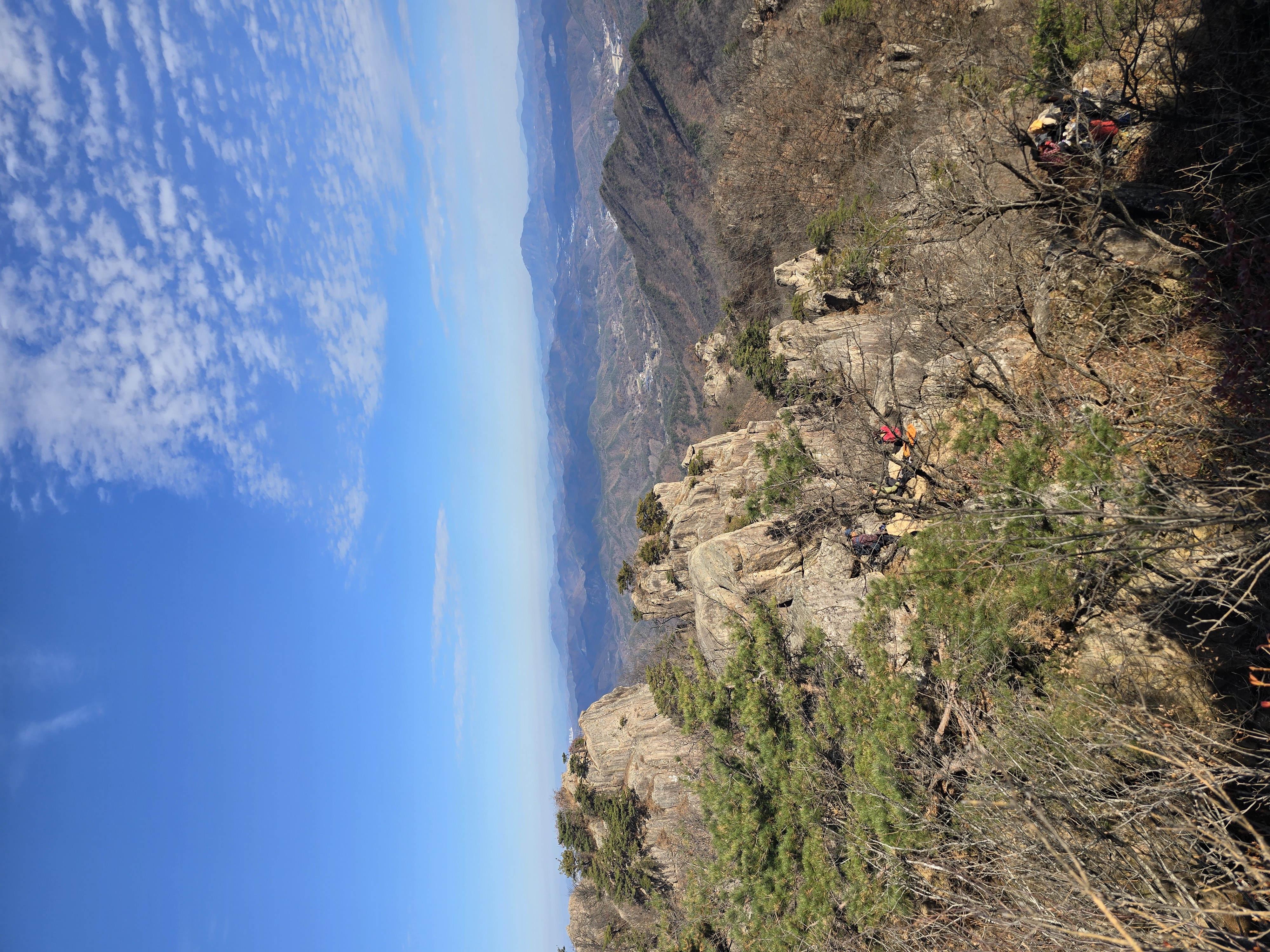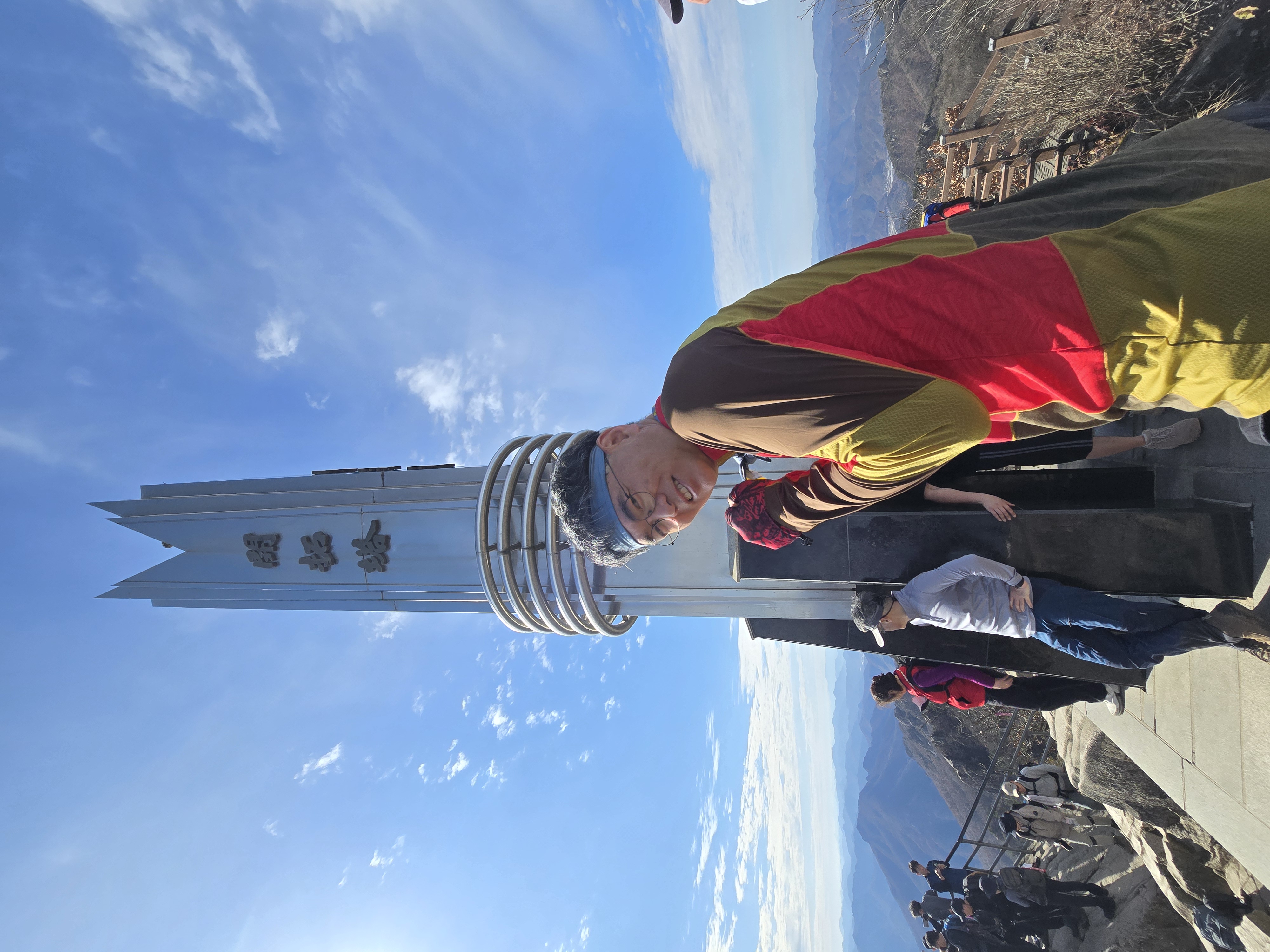 대둔산 정상인 마천대에 들어선다. 당연히 마천대에도 사람들이 많이 보인다. 정상적으로 인증사진 찍기는 쉽지 않다. 마천대에서 바라보는 구름다리와 삼선계단의 모습은 언제 봐도 인상적이다. 마천대 주위를 둘러보며 멋진 산그리메를 감상한다. 산행 내내 외국인들의 모습도 많이 보인다. 내장산에서는 중국인들이 많이 보이던데, 이제 유명한 산행지들은 글로벌화 되었다고 할 수 있다. 산악회 일행들과 식사 장소를 찾다가 정상 부근에서는 해결 못하고, 결국 용문골 삼거리 못 미쳐 전망 좋은 바위 위에 자리를 잡는다. 멋진 조망을 보면서, 맛난 음식들과 좋은 사람들이 함께 하니 무릉도원이 따로 없다.