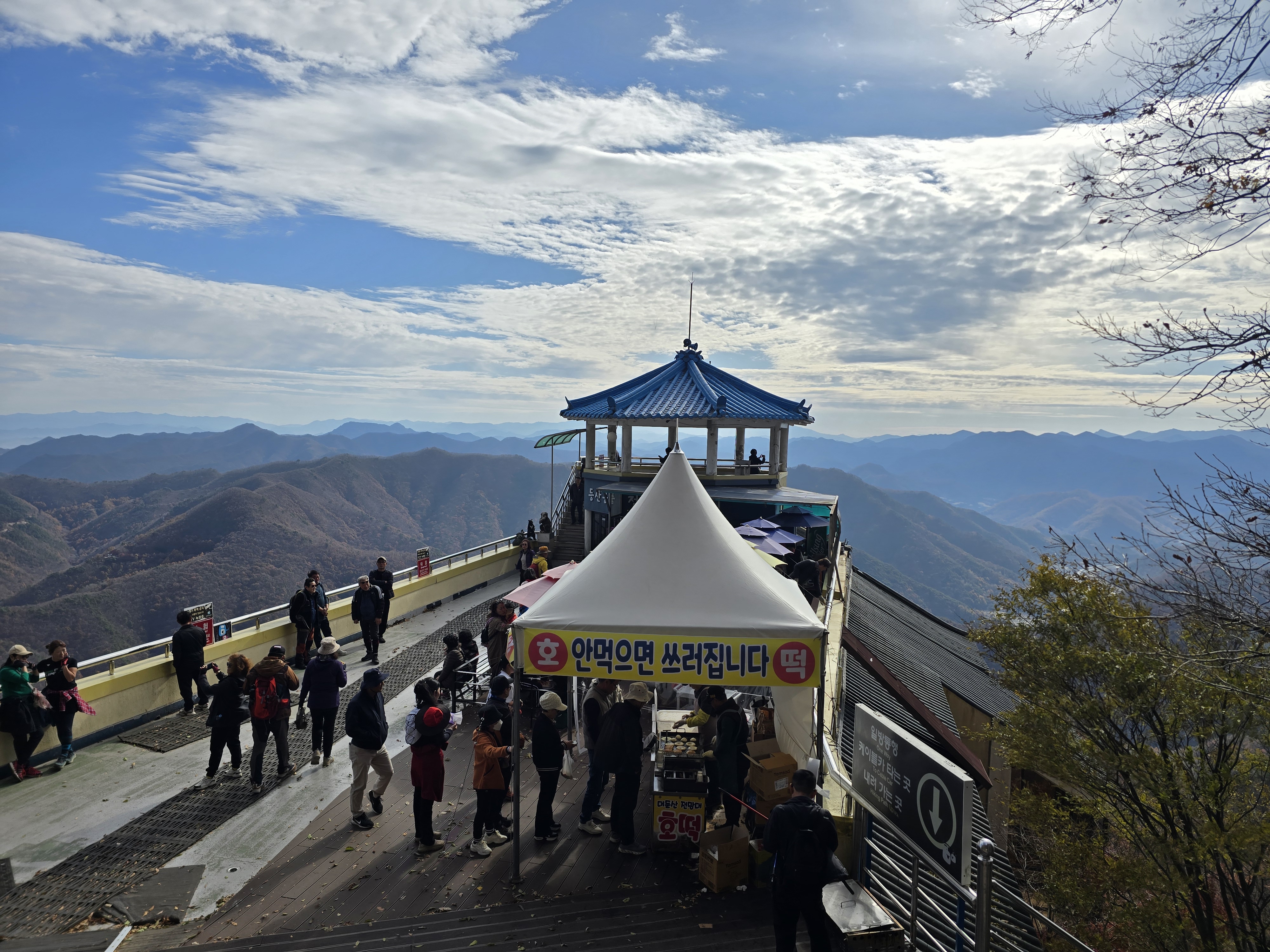 금강구름다리 위에는 사람들이 꽉 차 있다. 덕분에 구름다리가 출렁거리는 움직임이 예사롭지 않다. 고소공포증이 있는 사람들은 비명을 지르기도 한다. 군데군데 조형물에서 사진을 찍어야 하는데 발 디딜 틈조차 없을 정도로 대기줄이 길어서 쉽게 포기한다. 대둔산의 하이라이트라 할 수 있는 삼선계단을 오르기 위해 줄을 섰다가 한참이나 나아가지 않는 대기행렬로 인해 다시 포기하고 우회길로 계단을 따라 오른다. 정상 진입 전 삼거리에 이를 때까지 가파른 오르막 돌길을 쉬지 않고 간다. 삼거리 평상에는 휴식을 취하며 식사를 즐기는 산객들로 북적인다.