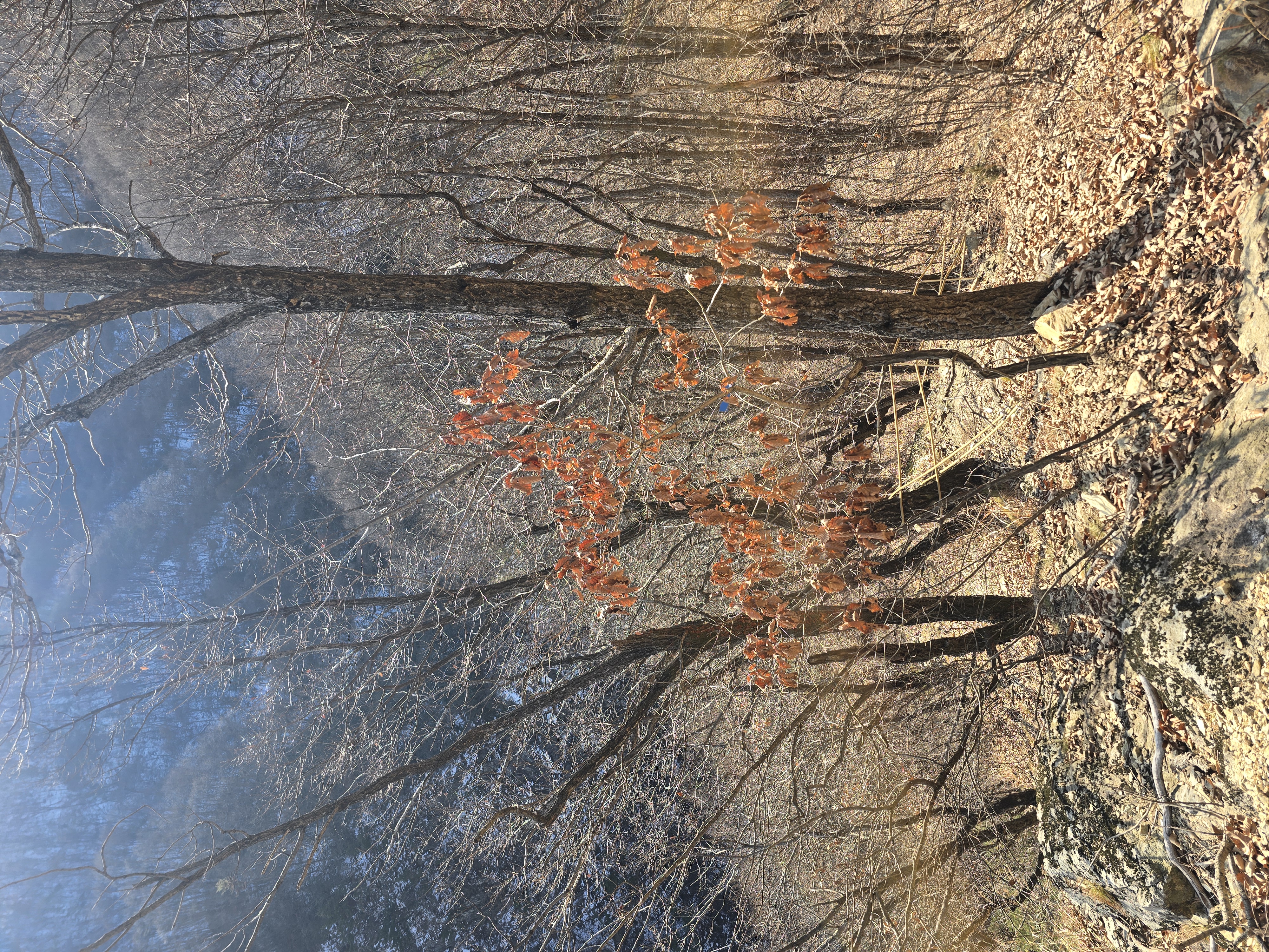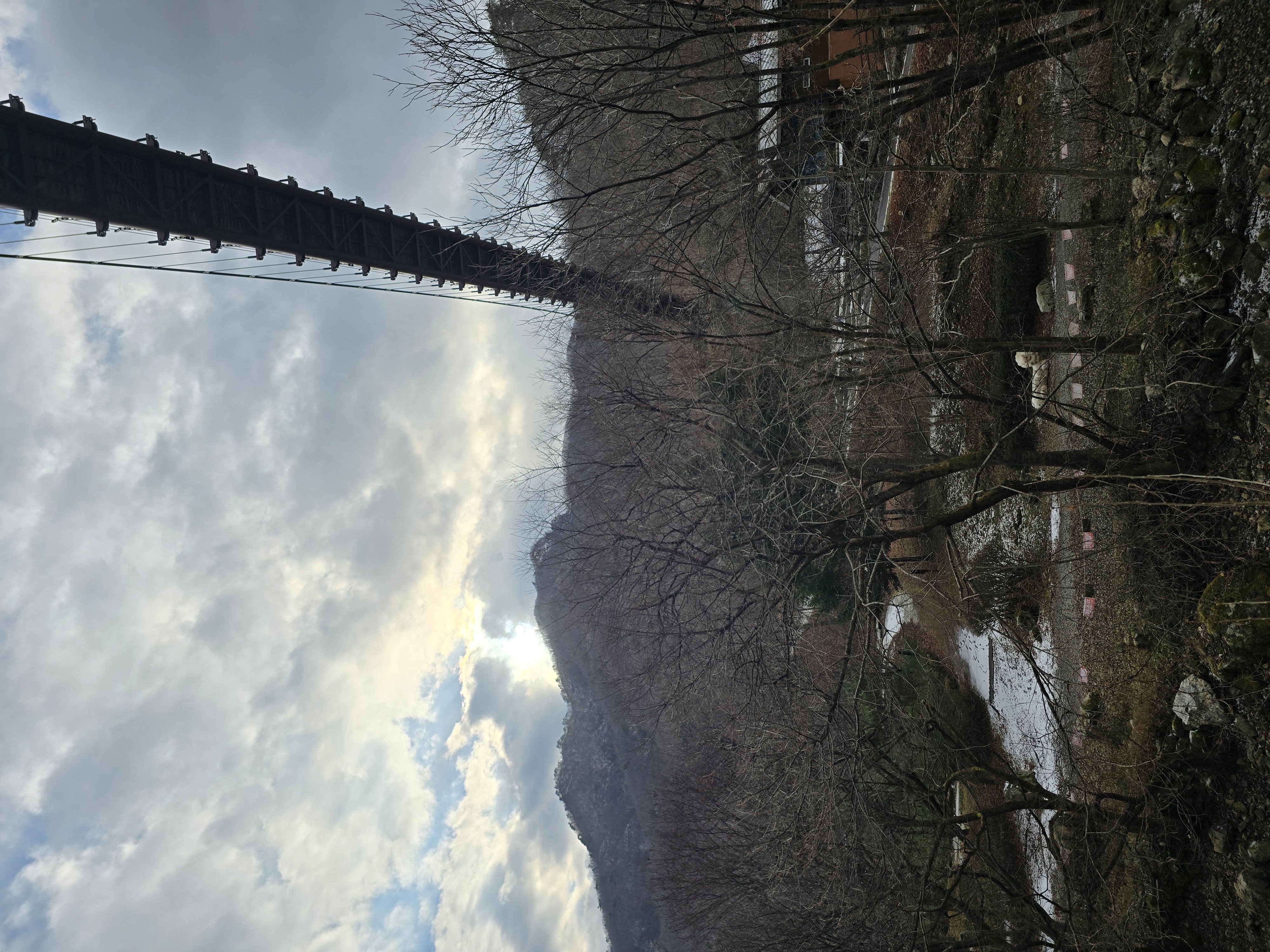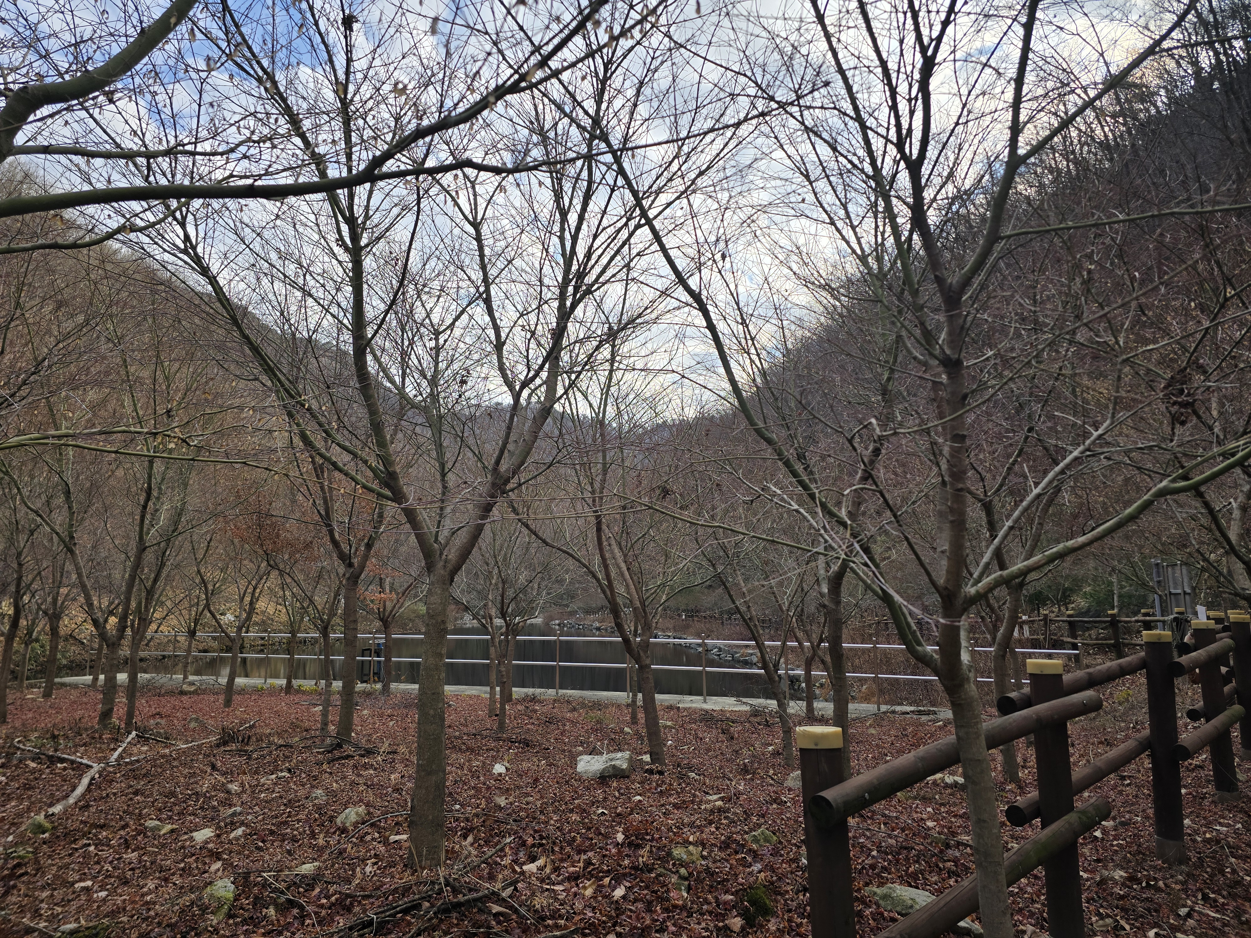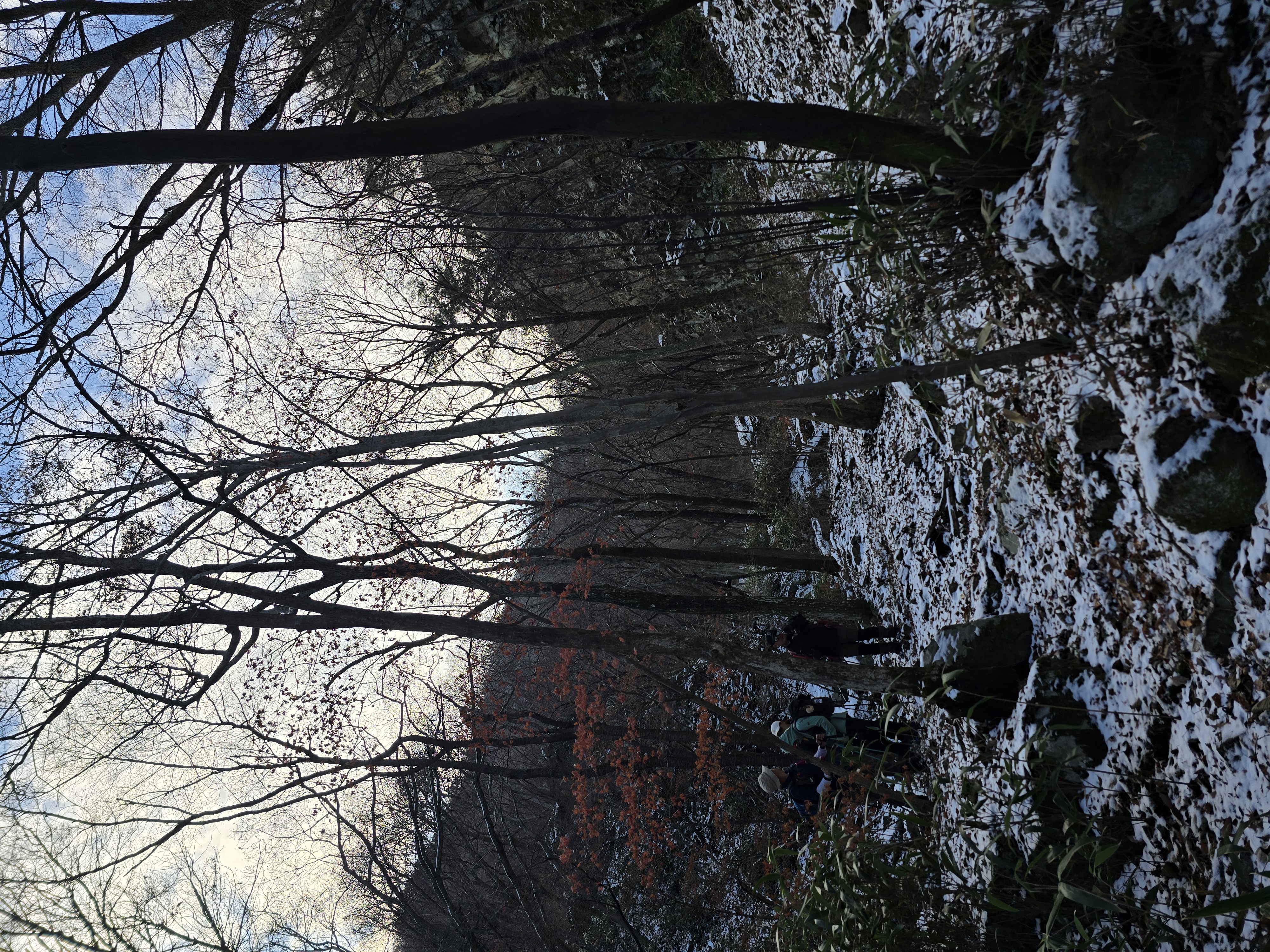 준비한 식사를 마치고, 본격적인 험한 산행이 기다리고 있다. 신선봉에서 샤방댐으로 내려가는 길이 아주 가파른 데다가, 두텁게 쌓인 낙엽과 녹지 않은 눈으로 인해 예상외의 난코스가 되고 있다. 일행들 중에서 미끄러지는 이들이 나오기 시작한다. 더욱 조심하며 발을 내딛는다. 거의 급경사의 내리막을 내려선 지점에 고드름이 달려 있는 오십폭포가 나타난다. 색다른 모습은 탄성을 일으키기 충분하다. 산행의 피로를 제대로 풀어준다. 샤방댐에 이르면 임도를 따라 내려가는 길만 남는다. 아이젠을 벗고 여유 있게 산행을 마무리하며 주차장에 이른다. 25년 겨울의 의미 있는 첫 눈산행을 마치고, 차에 올라탄다.