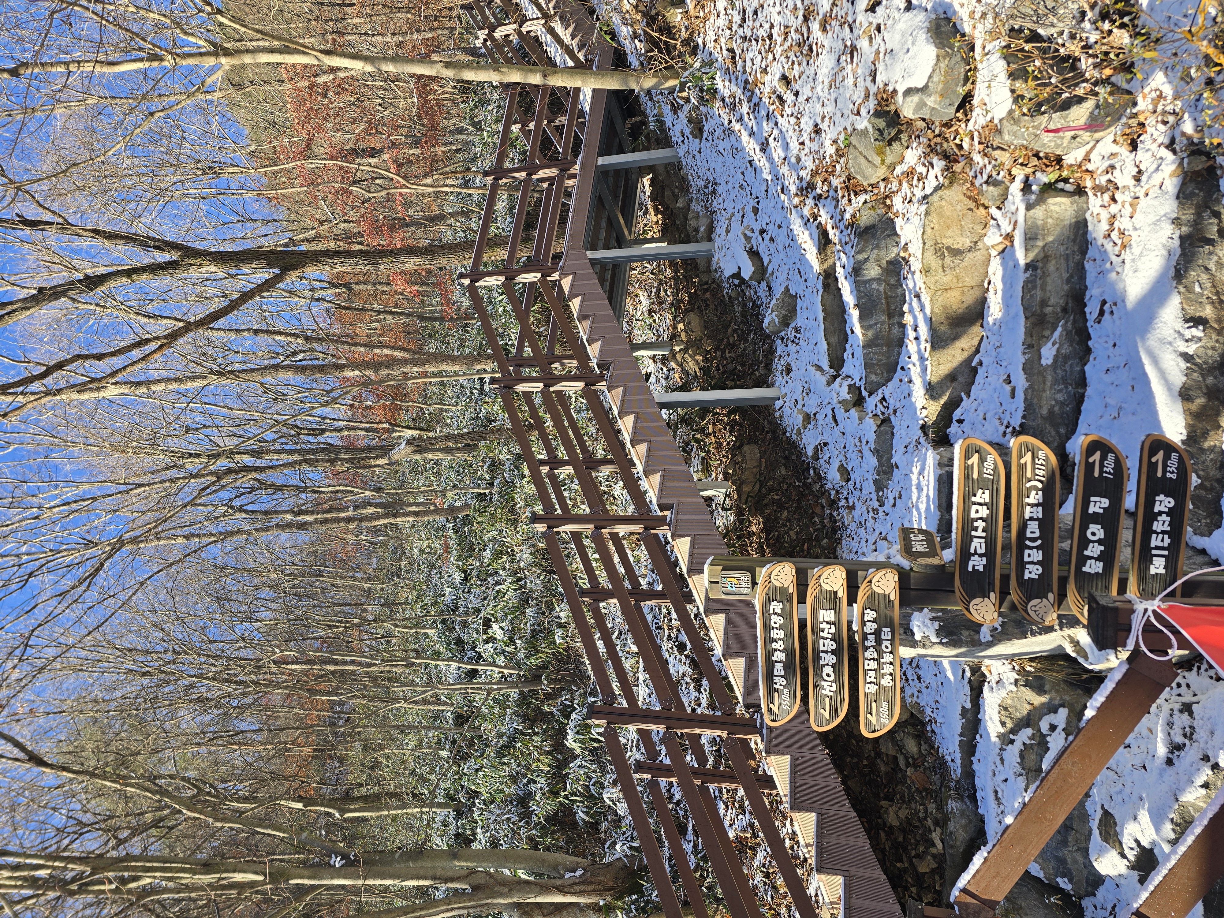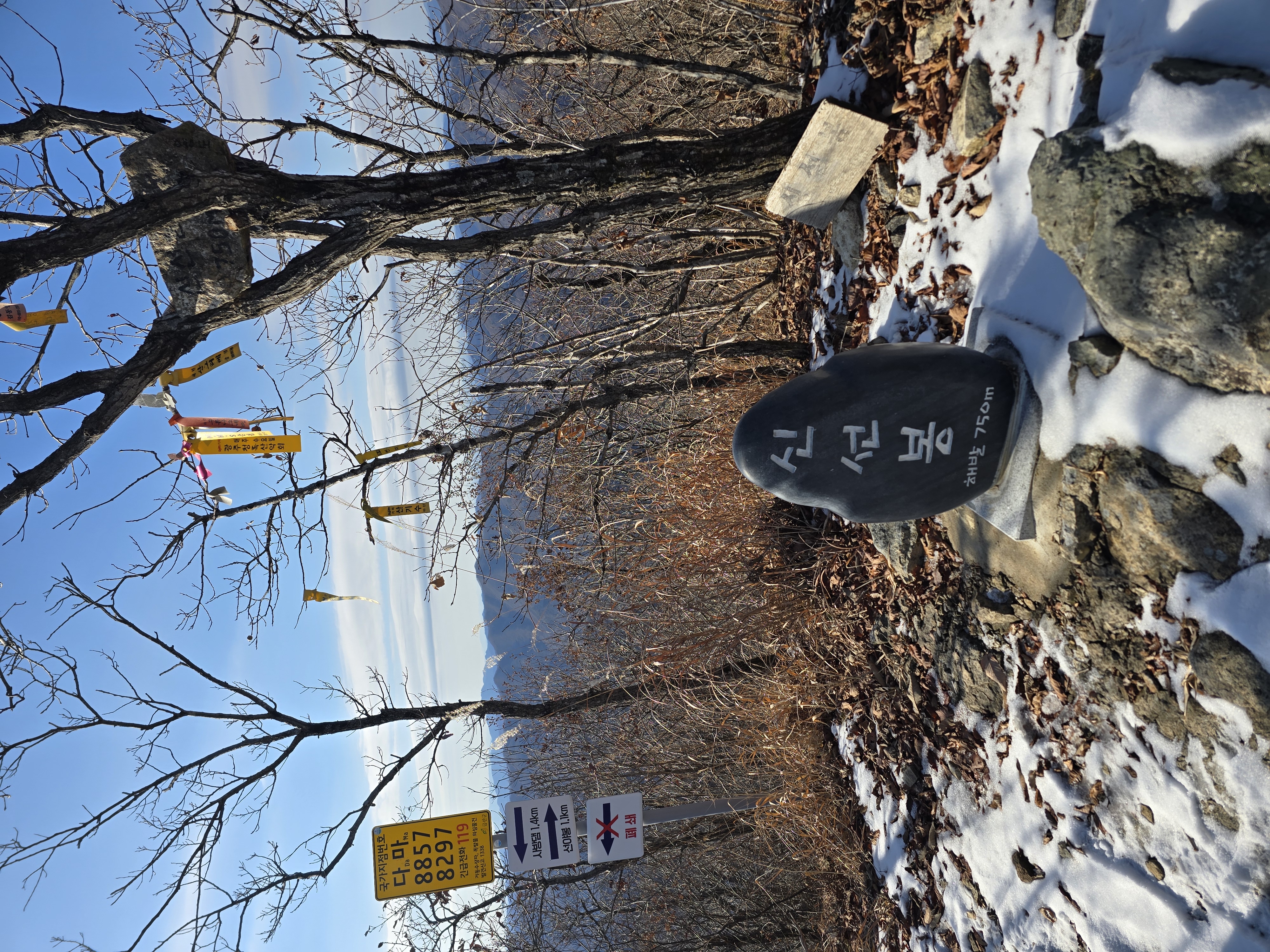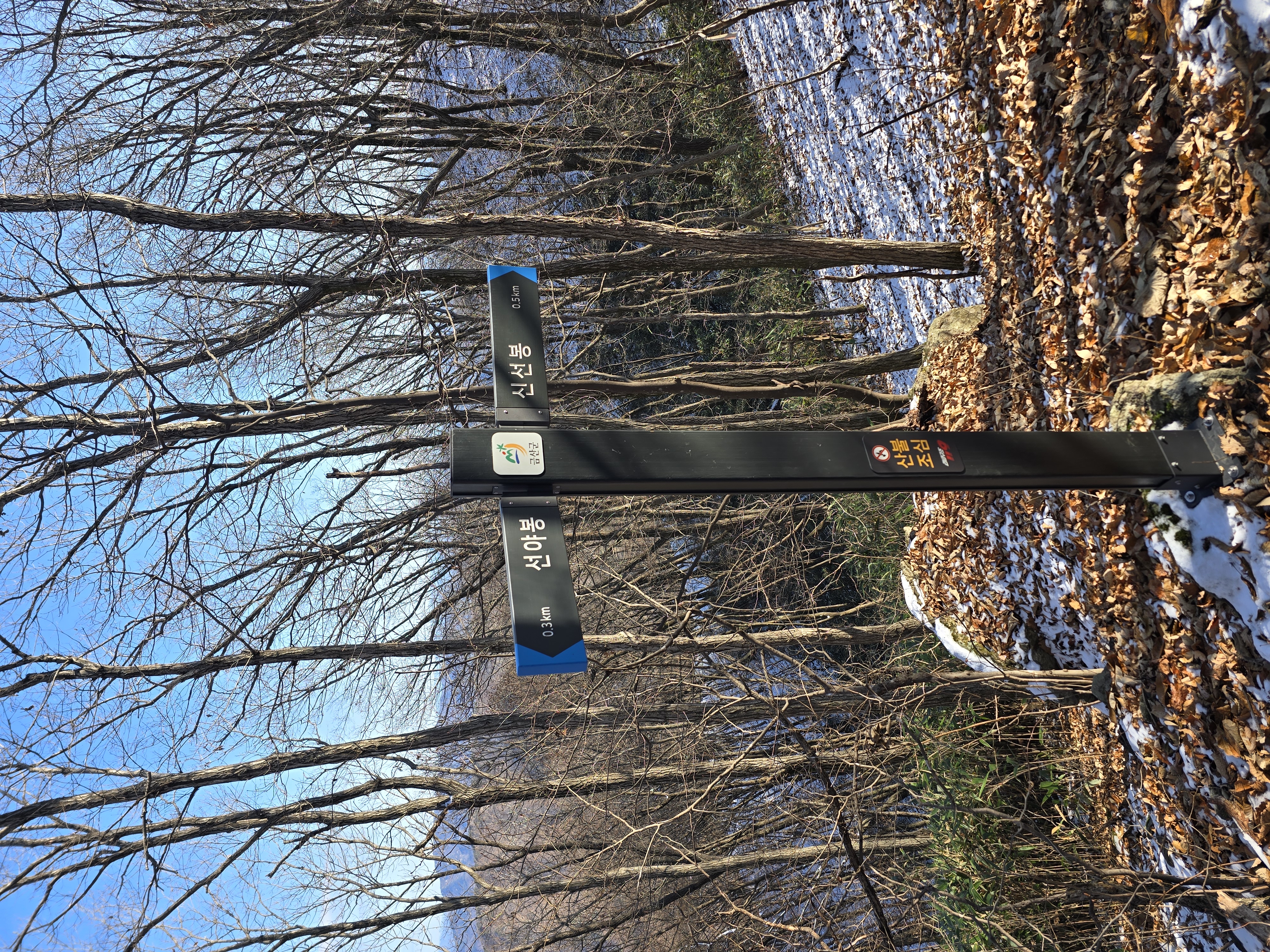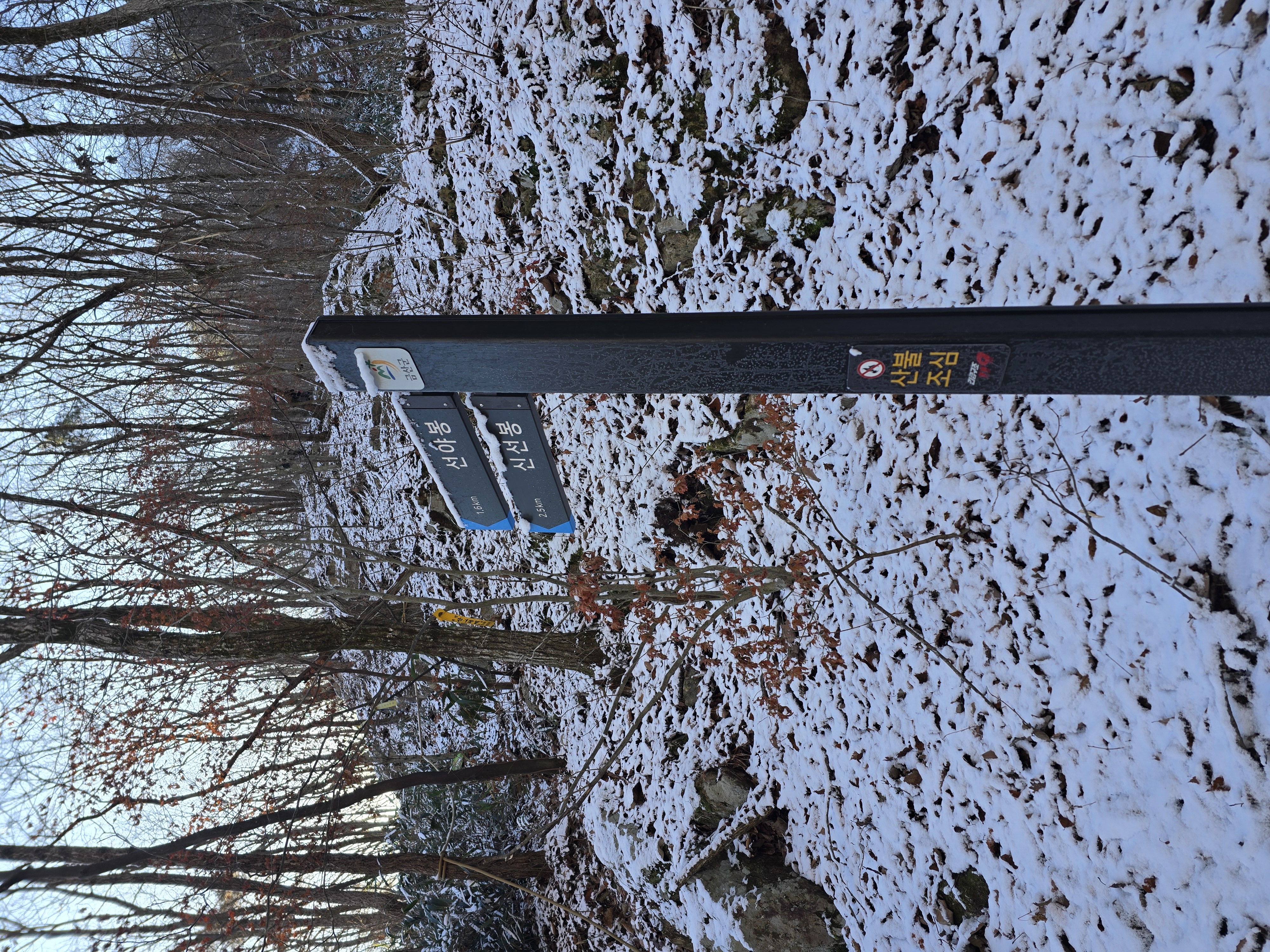 IC를 빠져나와 국도를 따라 남이 자연휴양림 근처로 천천히 이동하는 동안, 아직 눈이 녹지 않은 채 빙판 그대로 남아 있는 길이 있다. 자연휴양림도 관리가 되지 않고, 눈도 치워지지 않아 주차장에 주차하기까지 다소 난관이 있다. 어렵게 주차를 하고 계단을 따라 등산을 시작한다. 눈 때문인지 산불 방지 때문인지 계단은 통제가 되고 있다. 연유를 몰라 블랙야크 공지내용에 산방기간 인증불가 리스트도 다시 한번 체크하는데 별 문제없다. 계단 옆으로 우회해서 등산로로 진입한다. 이곳에서 정상인 선야봉까지는 약 2km가 채 되지 않기에 짧지만, 그만큼 오르막을 감수해야 하는 코스라 할 수 있다. 예정에 없던 눈산행이 시작된다. 첫 번째 이정표에서부터 아이젠을 착용한다. 길이 미끄럽기 때문이다.