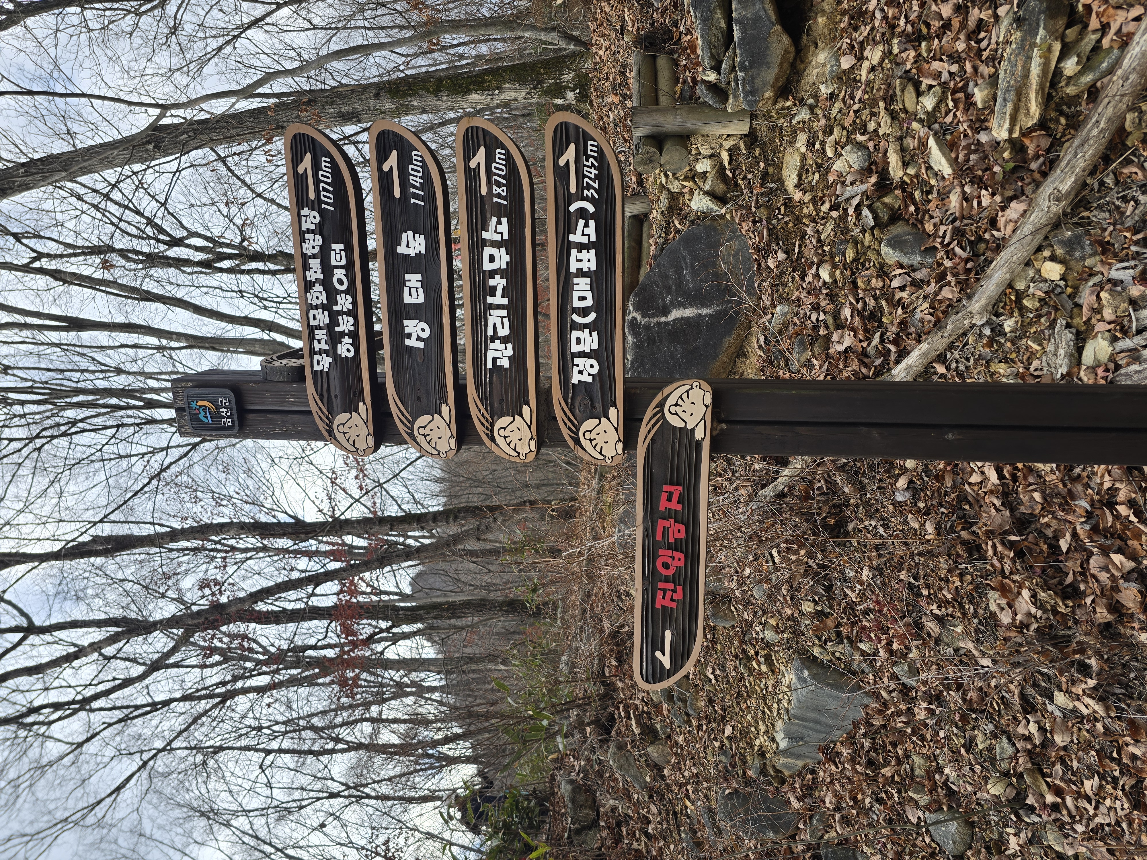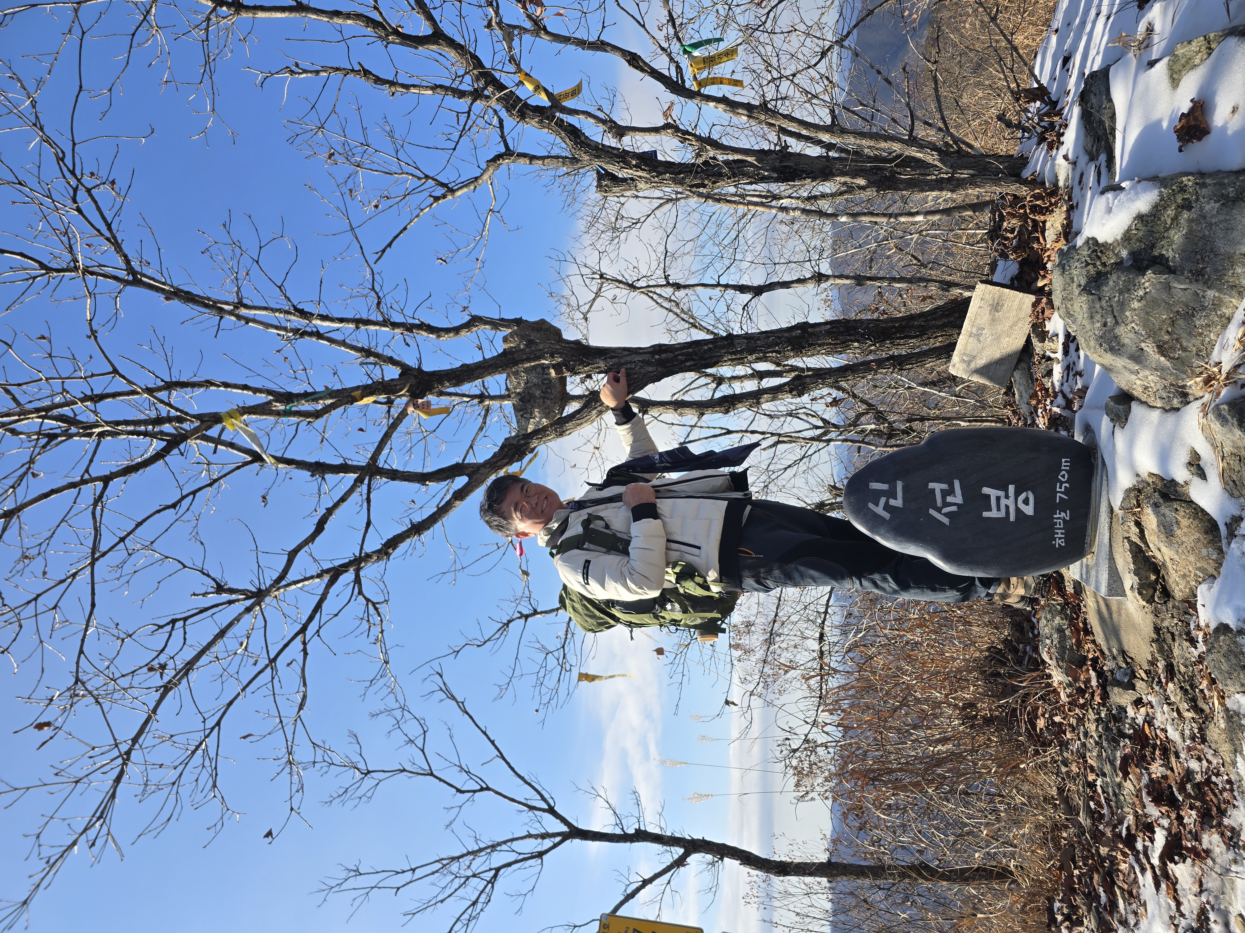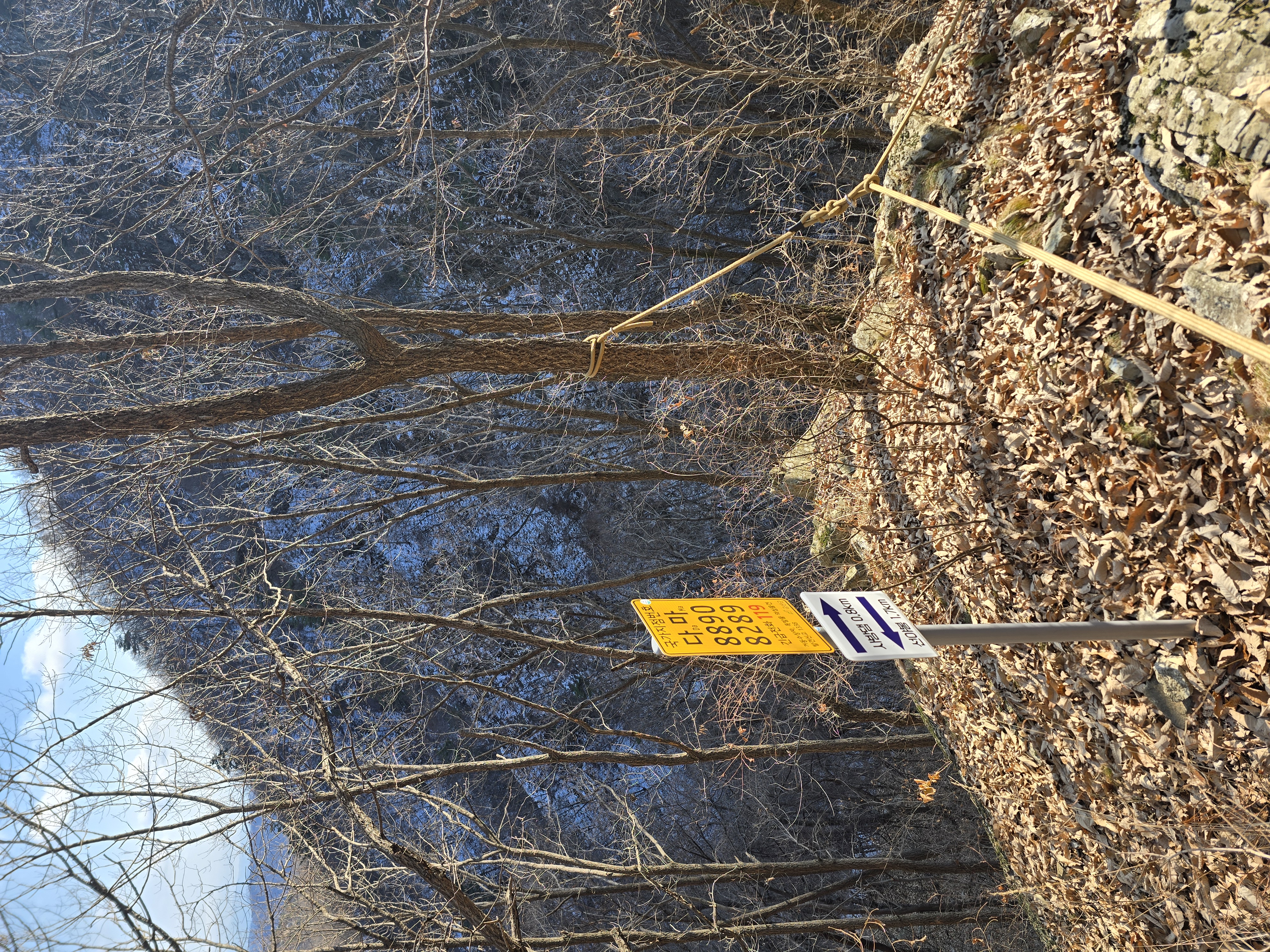 IC를 빠져나와 국도를 따라 남이 자연휴양림 근처로 천천히 이동하는 동안, 아직 눈이 녹지 않은 채 빙판 그대로 남아 있는 길이 있다. 자연휴양림도 관리가 되지 않고, 눈도 치워지지 않아 주차장에 주차하기까지 다소 난관이 있다. 어렵게 주차를 하고 계단을 따라 등산을 시작한다. 눈 때문인지 산불 방지 때문인지 계단은 통제가 되고 있다. 연유를 몰라 블랙야크 공지내용에 산방기간 인증불가 리스트도 다시 한번 체크하는데 별 문제없다. 계단 옆으로 우회해서 등산로로 진입한다. 이곳에서 정상인 선야봉까지는 약 2km가 채 되지 않기에 짧지만, 그만큼 오르막을 감수해야 하는 코스라 할 수 있다. 예정에 없던 눈산행이 시작된다. 첫 번째 이정표에서부터 아이젠을 착용한다. 길이 미끄럽기 때문이다.