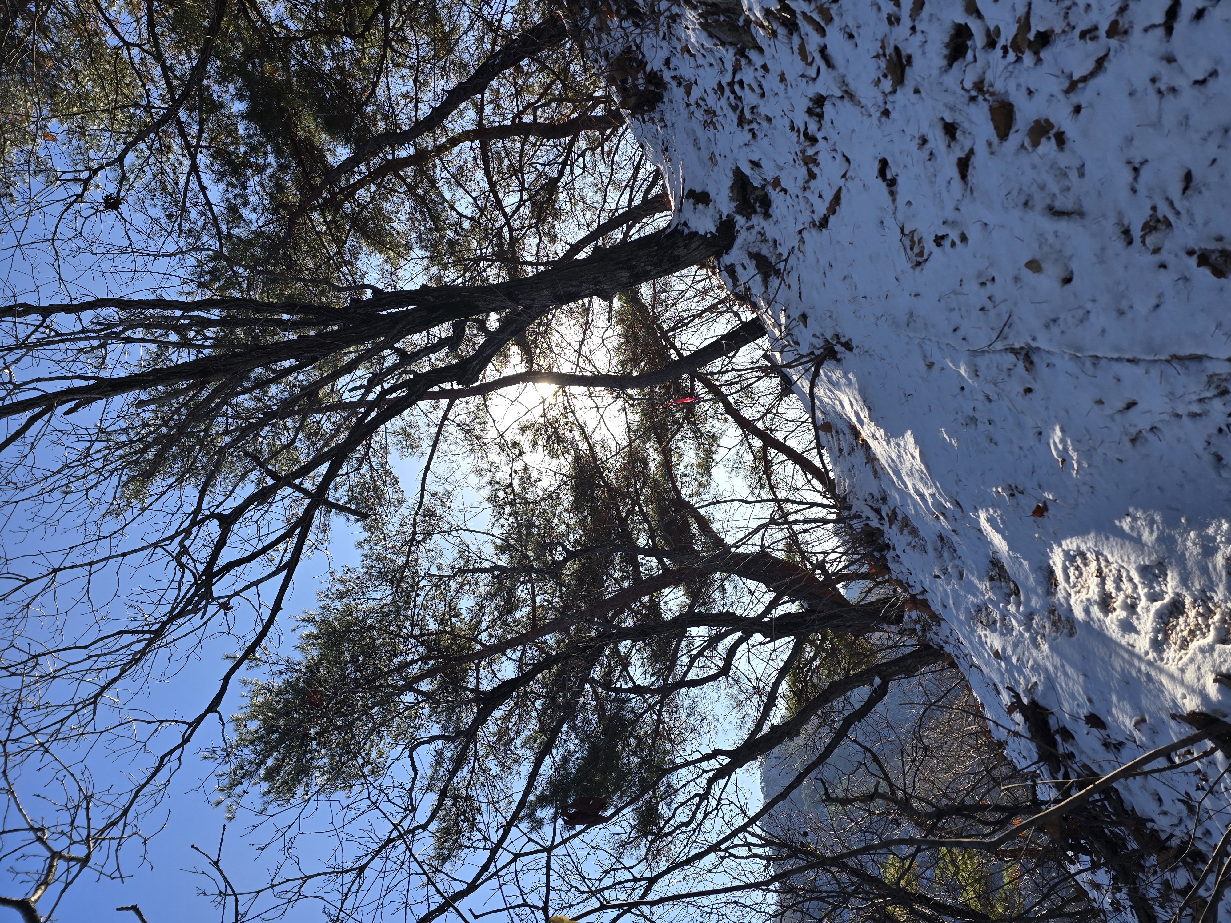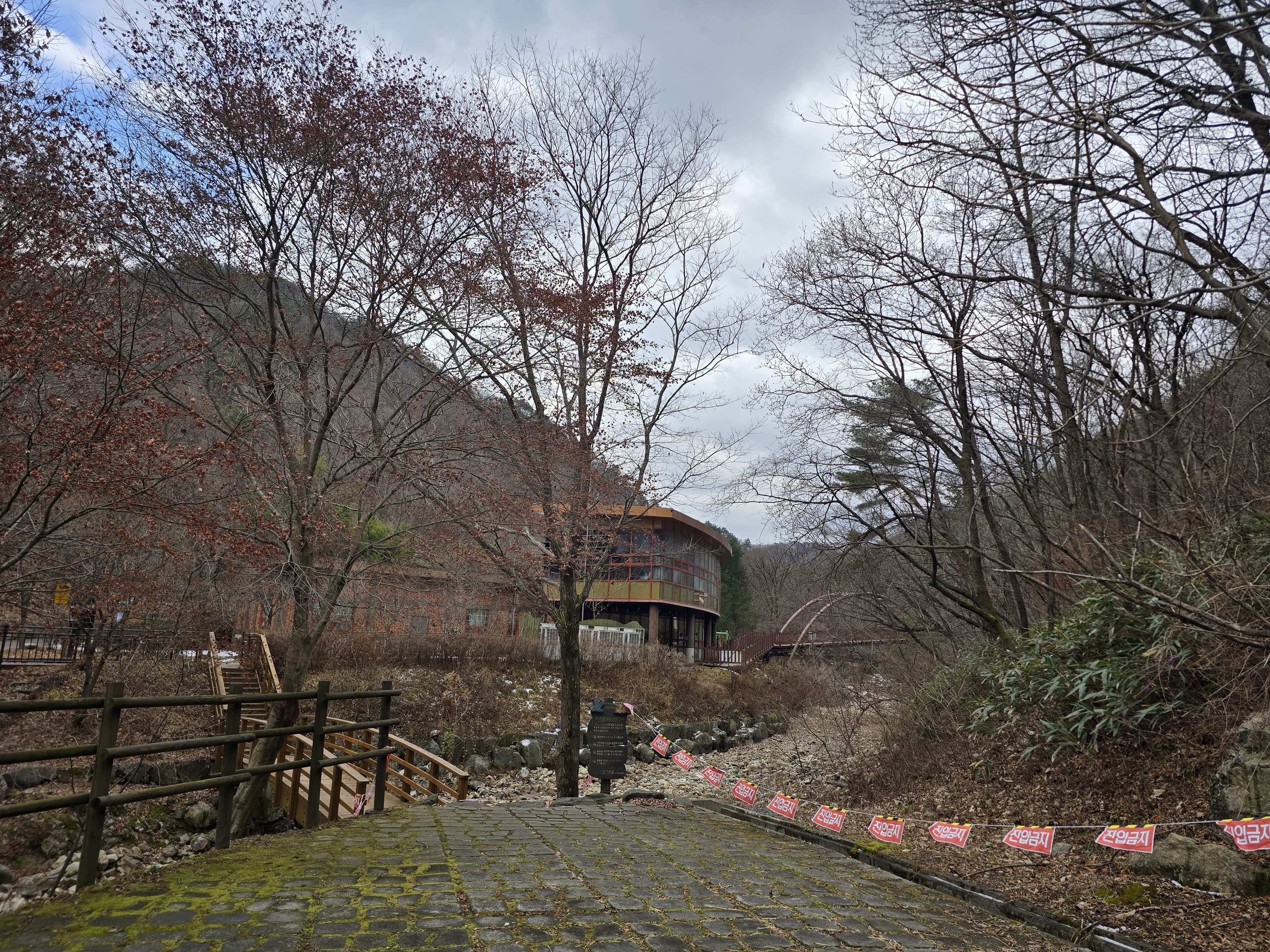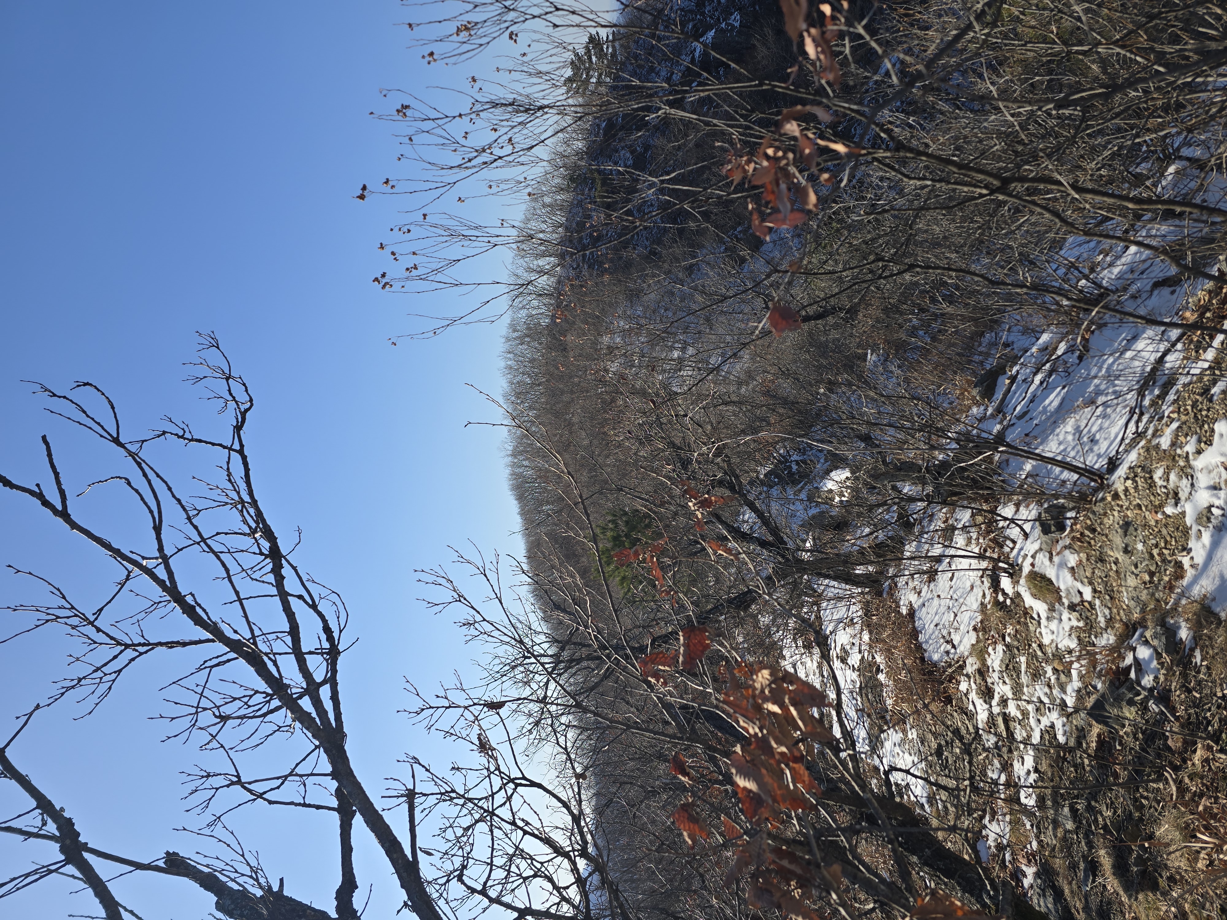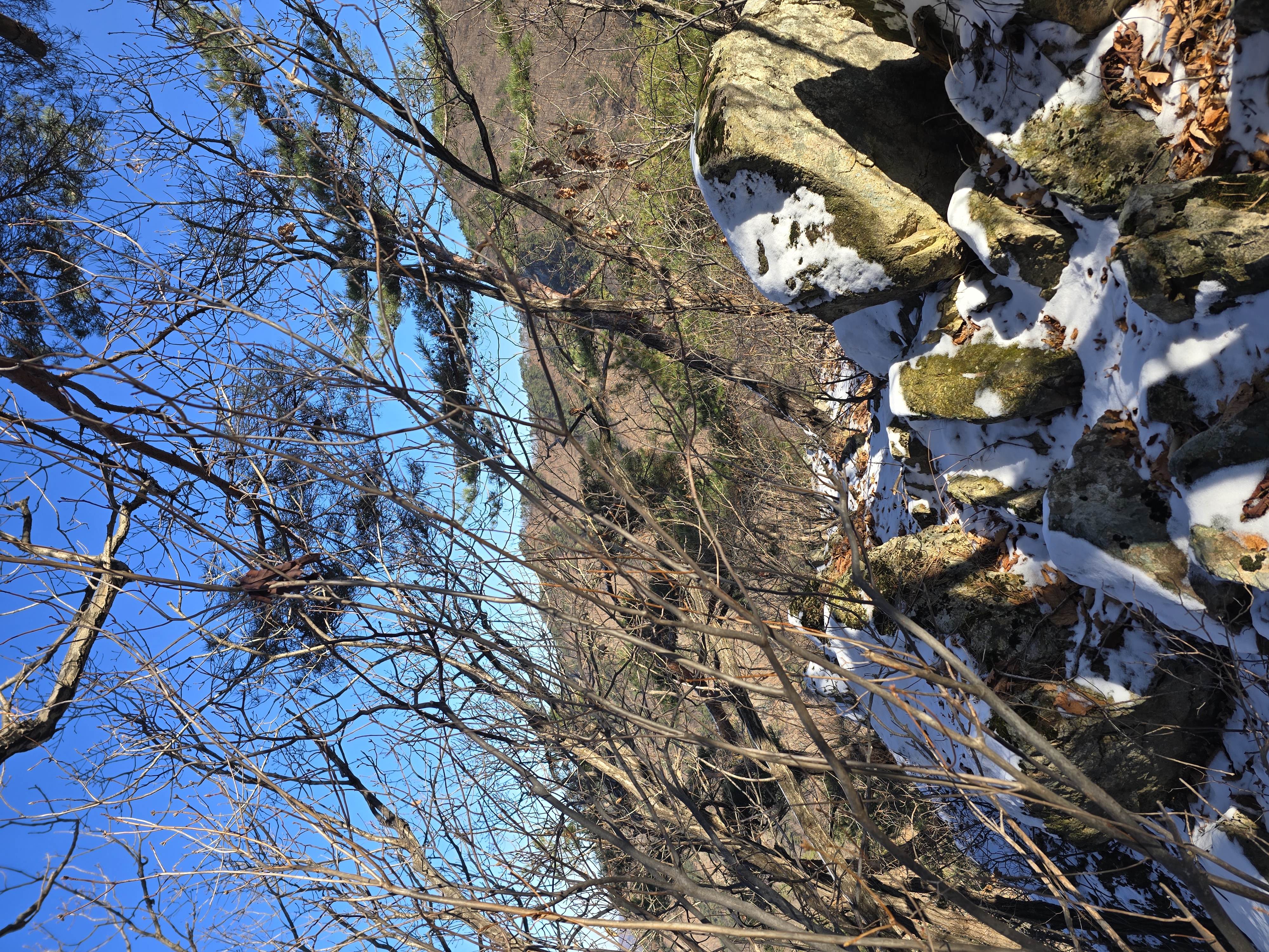 IC를 빠져나와 국도를 따라 남이 자연휴양림 근처로 천천히 이동하는 동안, 아직 눈이 녹지 않은 채 빙판 그대로 남아 있는 길이 있다. 자연휴양림도 관리가 되지 않고, 눈도 치워지지 않아 주차장에 주차하기까지 다소 난관이 있다. 어렵게 주차를 하고 계단을 따라 등산을 시작한다. 눈 때문인지 산불 방지 때문인지 계단은 통제가 되고 있다. 연유를 몰라 블랙야크 공지내용에 산방기간 인증불가 리스트도 다시 한번 체크하는데 별 문제없다. 계단 옆으로 우회해서 등산로로 진입한다. 이곳에서 정상인 선야봉까지는 약 2km가 채 되지 않기에 짧지만, 그만큼 오르막을 감수해야 하는 코스라 할 수 있다. 예정에 없던 눈산행이 시작된다. 첫 번째 이정표에서부터 아이젠을 착용한다. 길이 미끄럽기 때문이다.