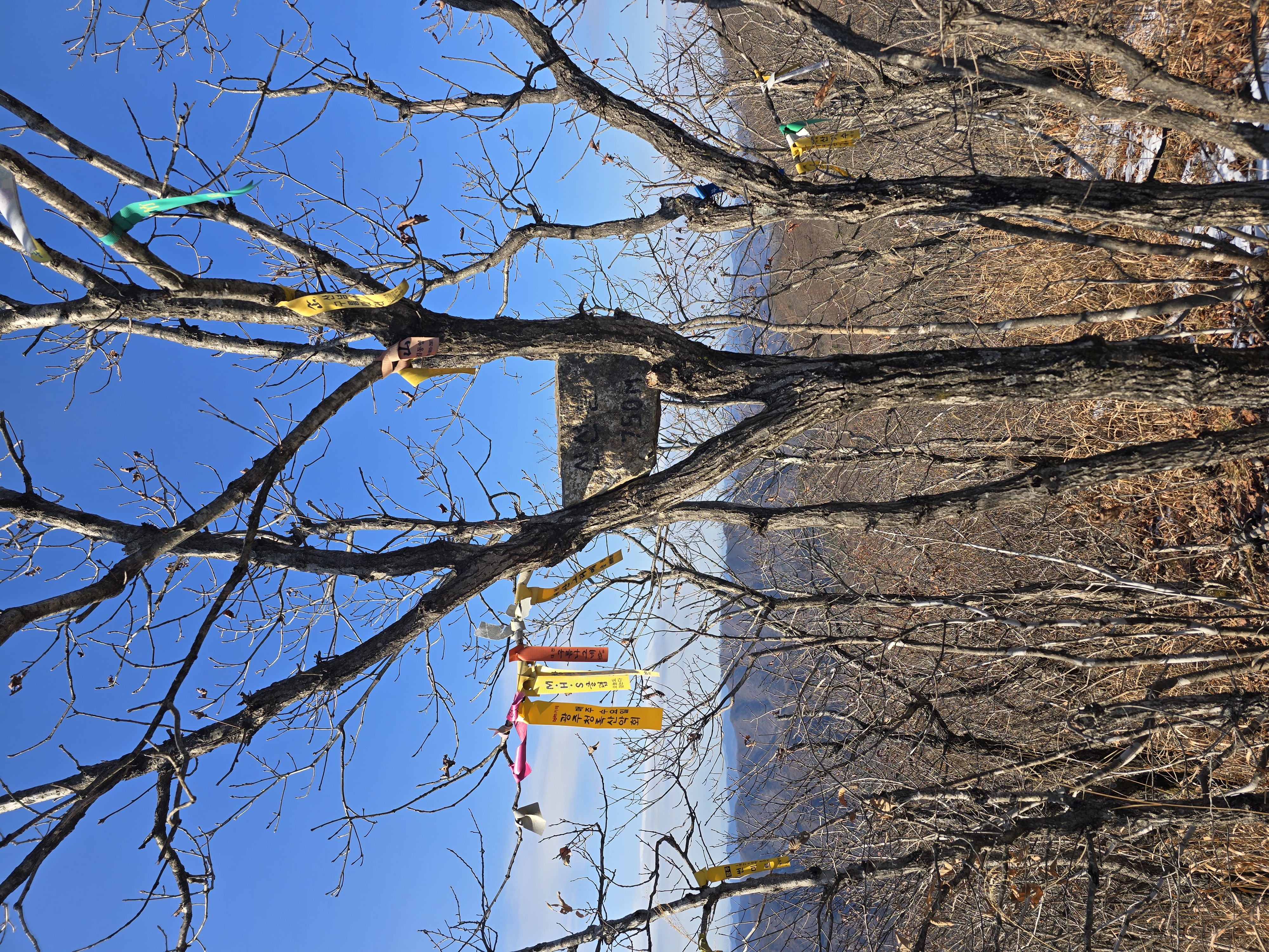 선야봉에서 신선봉까지는 900 미터라고 이정표가 말해 준다. 완만하게 미끄러운 능선길을 천천히 이동한다 신선봉까지 가는 동안 식사할 자리를 찾지 못한다. 결국 신선봉에 도착하고서야 인근 식사할 자리를 찾는다. 우선 신선봉에서 기념사진을 한 장씩 찍는다. 아마도 최근에 새로 제작된 정상석인 듯 깔끔한 모습이다. 뒤편 나무 위에는 가지 사이에 또 하나의 정상석이 올려져 있고, 나무 아래쪽에는 기존의 정상석을 대신했을 정상목이 초라한 모습으로 나무에 기대져 있다. 선야봉과 신선봉 구간의 이정표는 금산에서 제작한 것 이외에, 완주군에서 제작한 이정표는 꽤나 예쁜 매력을 풍겨주고 있다.