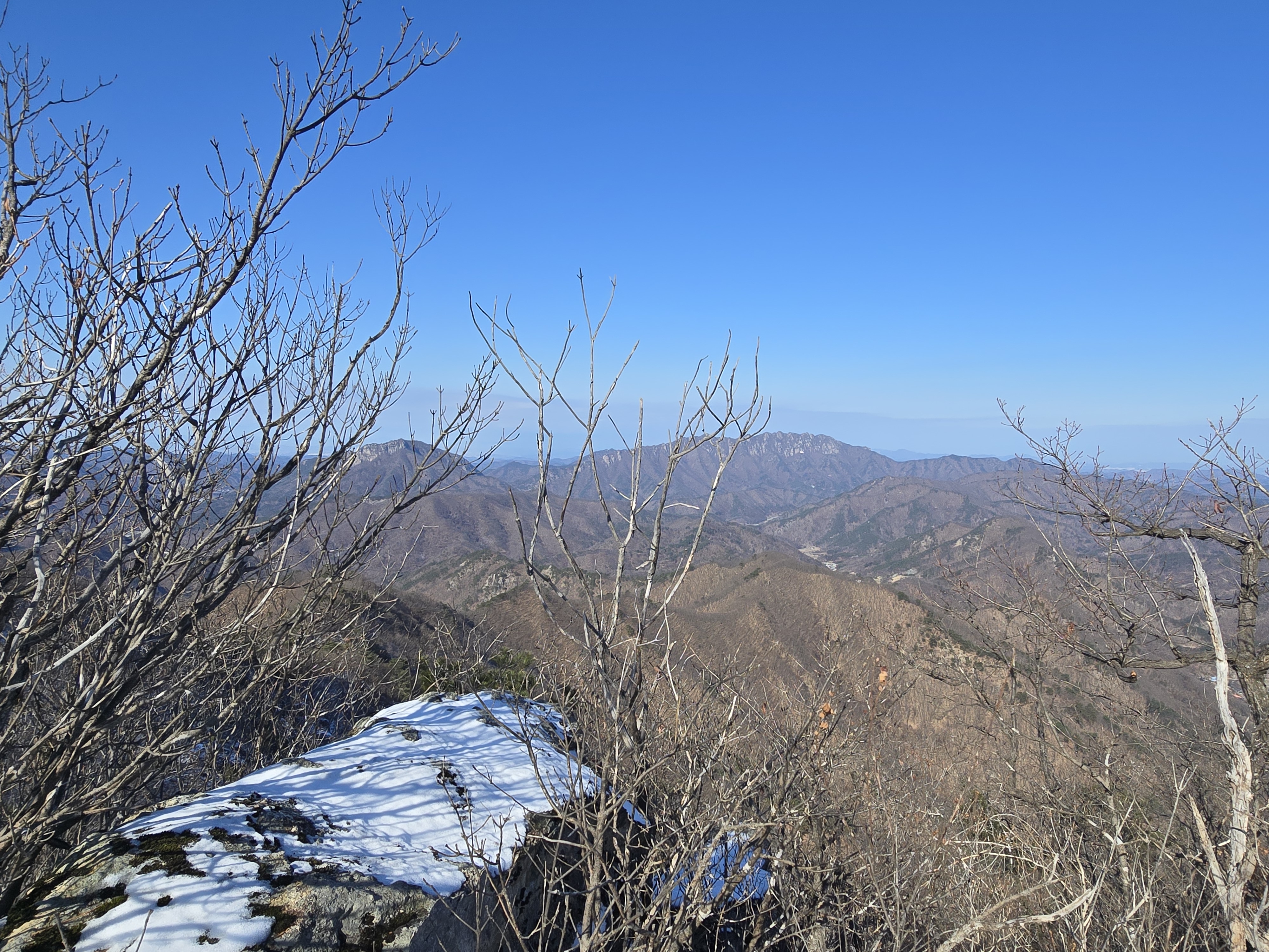 지난번 선야산을 찾았을 때는 혼산에 흐린 날씨로 전혀 주변의 전망을 볼 수 없었으나, 이번엔 그래도 눈 덮인 주변의 산그리메도 제대로 볼 수 있어 좋다. 속도를 내지 않고 천천히 즐기며 선야봉까지의 오르막 구간을 오른다. 군데군데 조망이 뚫린 곳에서는 멀리 대둔산 암릉 능선부터 인근의 다른 산들까지 멋진 산그리메가 펼쳐진다. 의외로 온도가 높아 제법 땀을 많이 흘린 채로 정상인 선야봉에 올라선다. 앙증맞은 정상석이 우리를 맞이한다. 블야 100 플러스 어게인 인증을 마치고, 식사할 자리를 찾아보지만 사방이 뚫린 정상이라 차가운 바람이 허락하지를 않는다. 좀 더 산행을 진행하기로 한다.